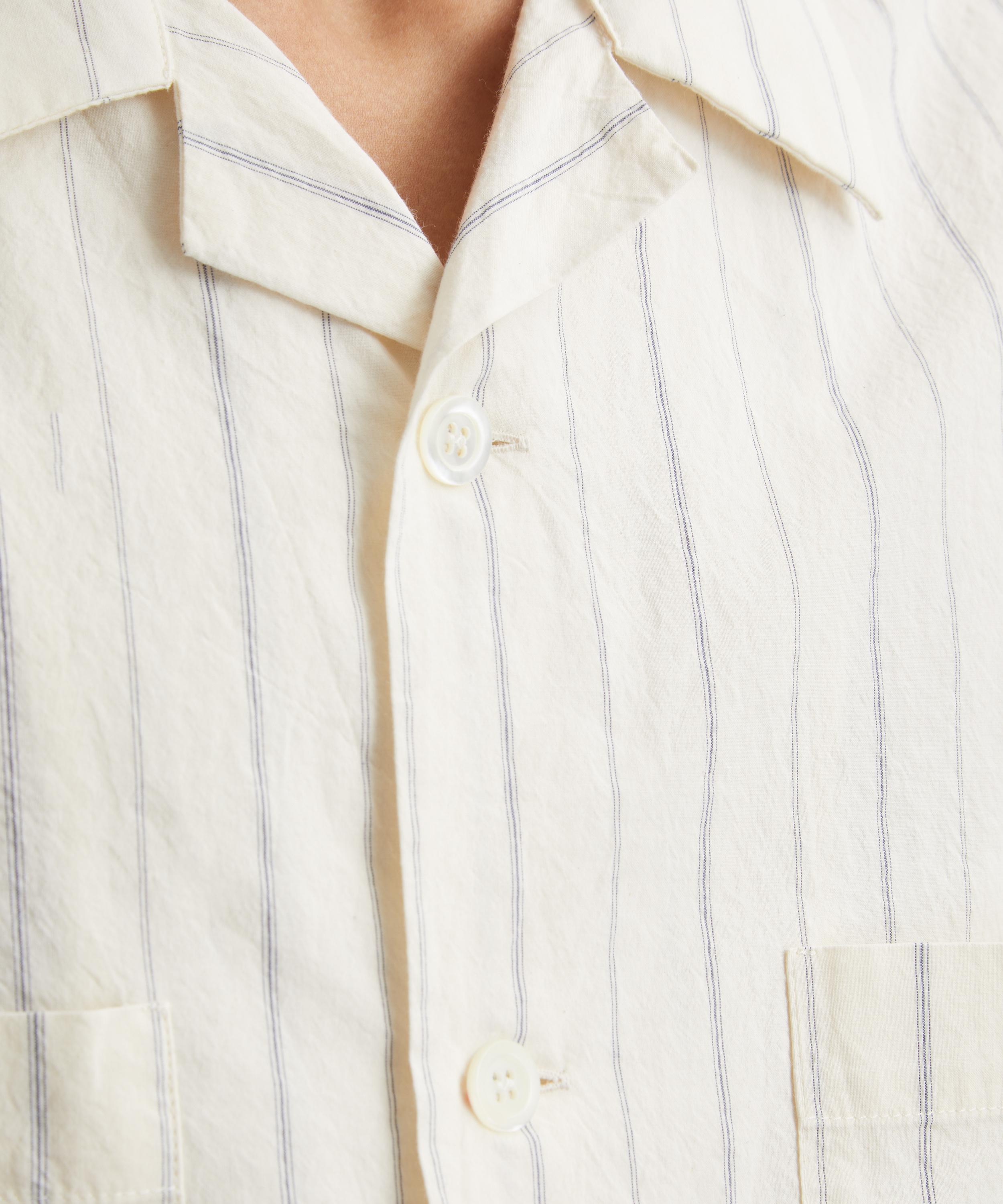 Crafted in Italy from smooth striped poplin, this short-sleeve shirt is cut to a relaxed fit with dropped shoulders, an open camp collar, button fastening, and two chest patch pockets.