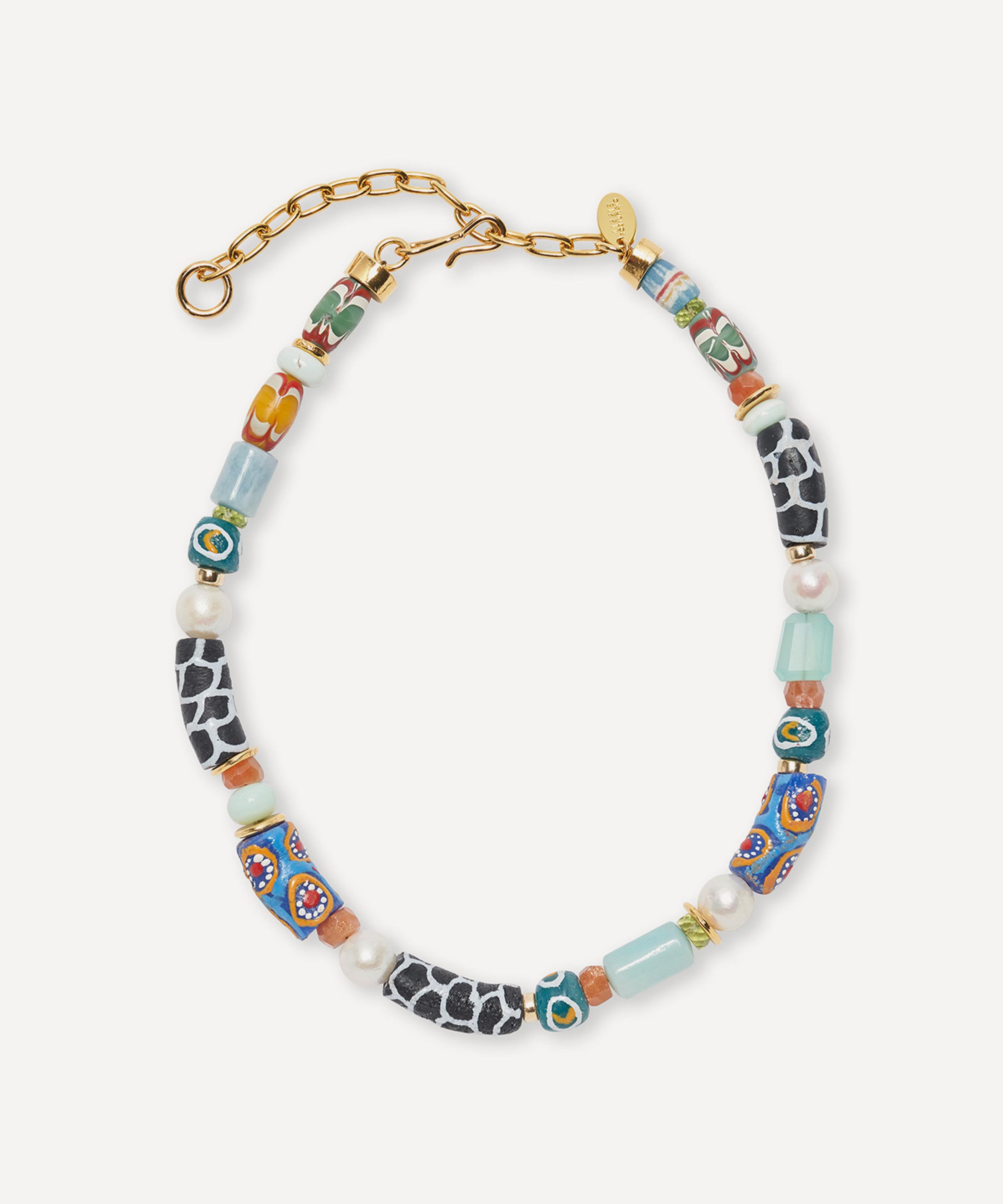 Crafted from gold-plated brass, it features an assorted array of painted glass, natural sunstone, peruvian opal, aquamarine with freshwater pearl accents. Evoking a boho, breezy aesthetic that will effortlessly compliment brightly-hued layering, it can be worn solo, or mixed with several necklaces together, incorporating both chunky and slim styles to achieve a unique and unexpected layered curation.
