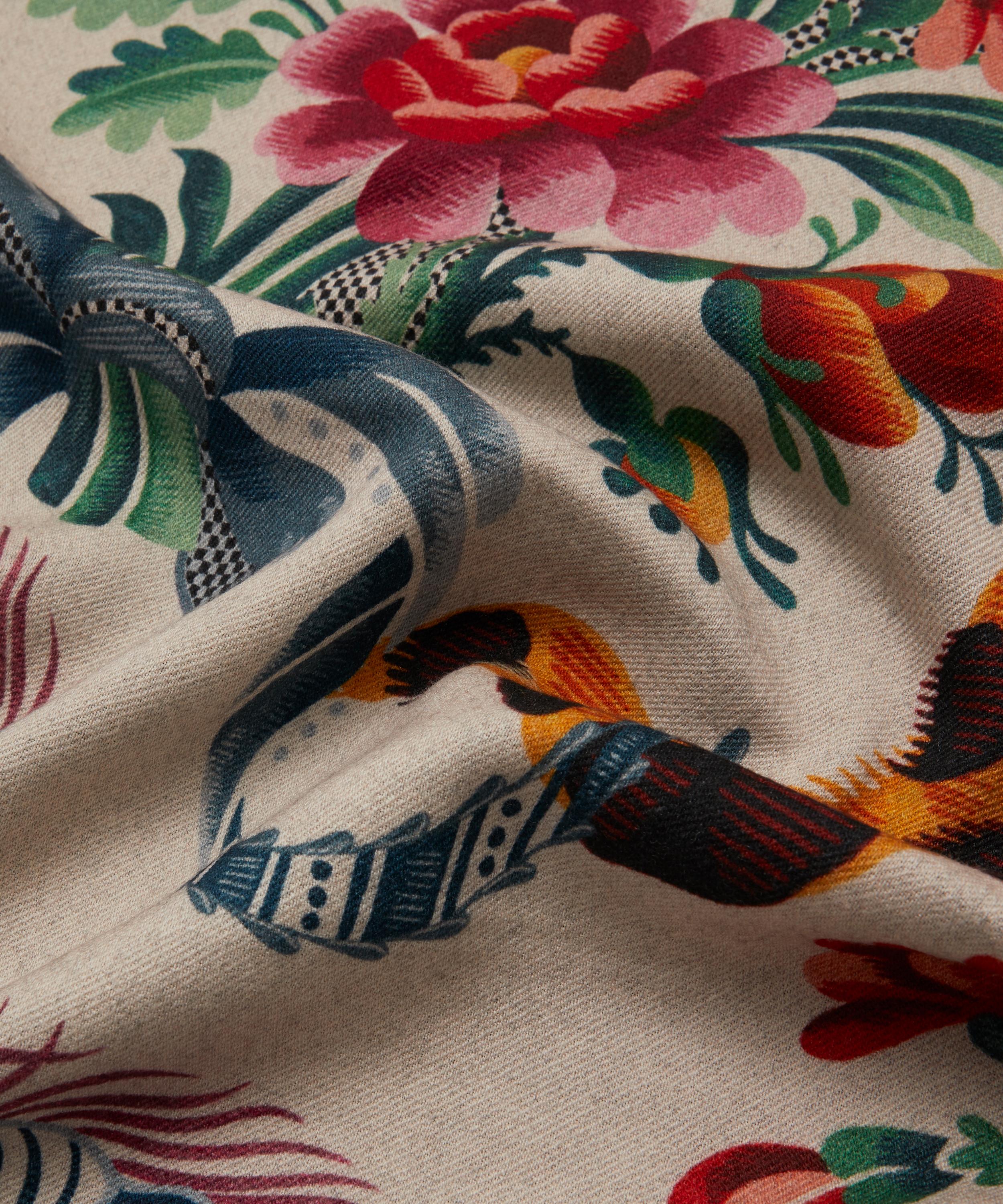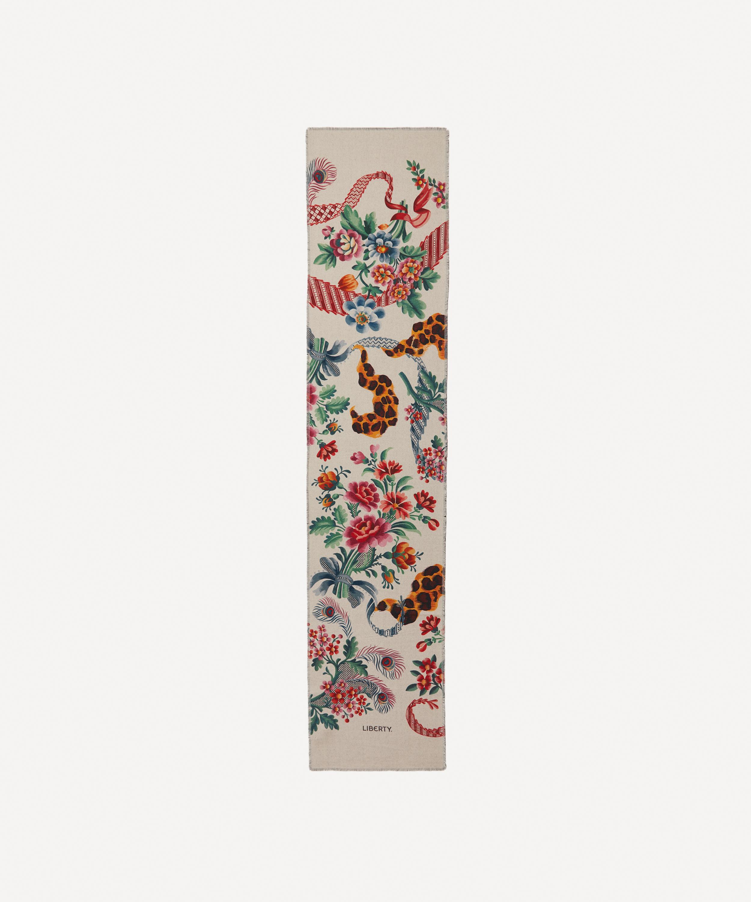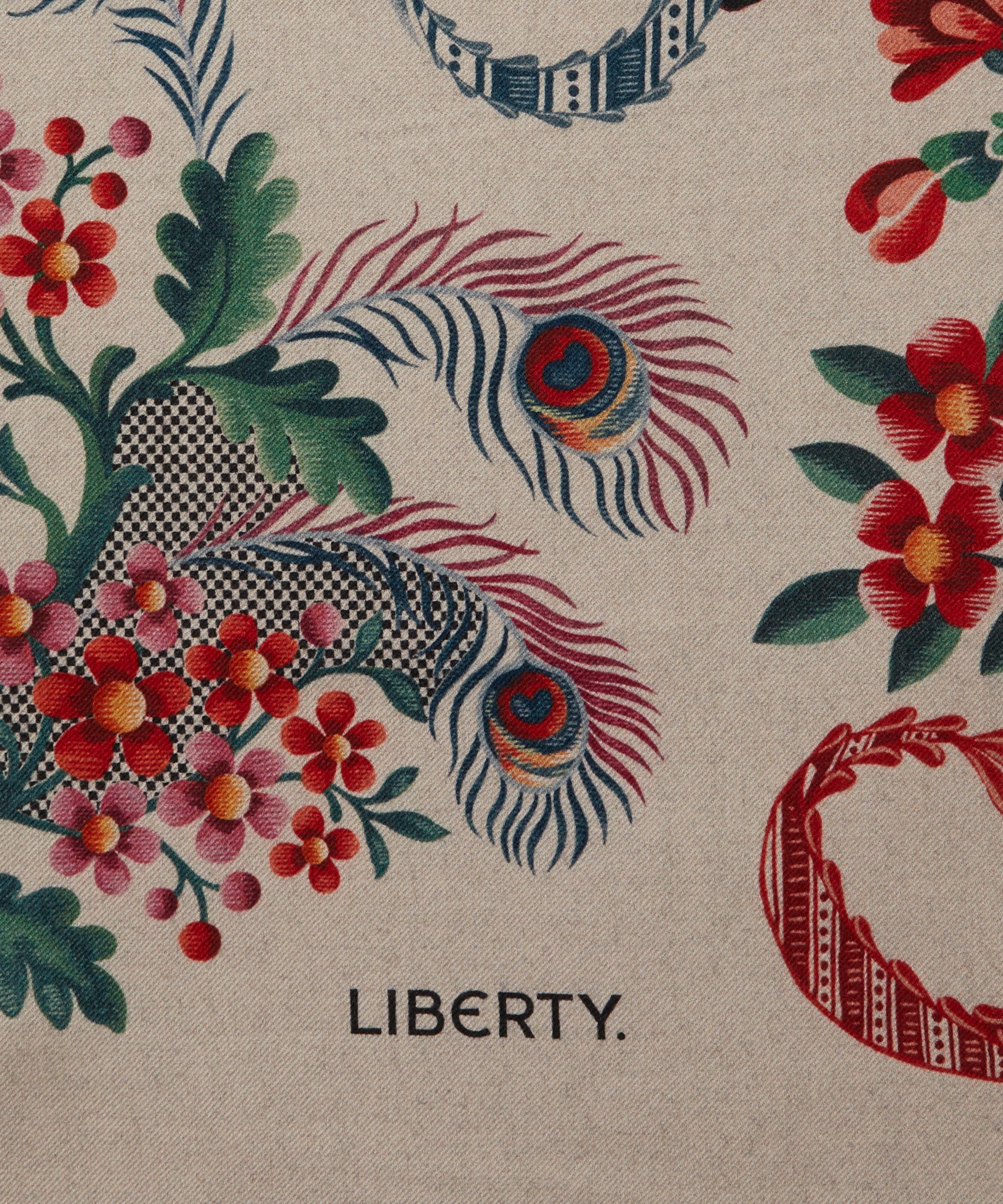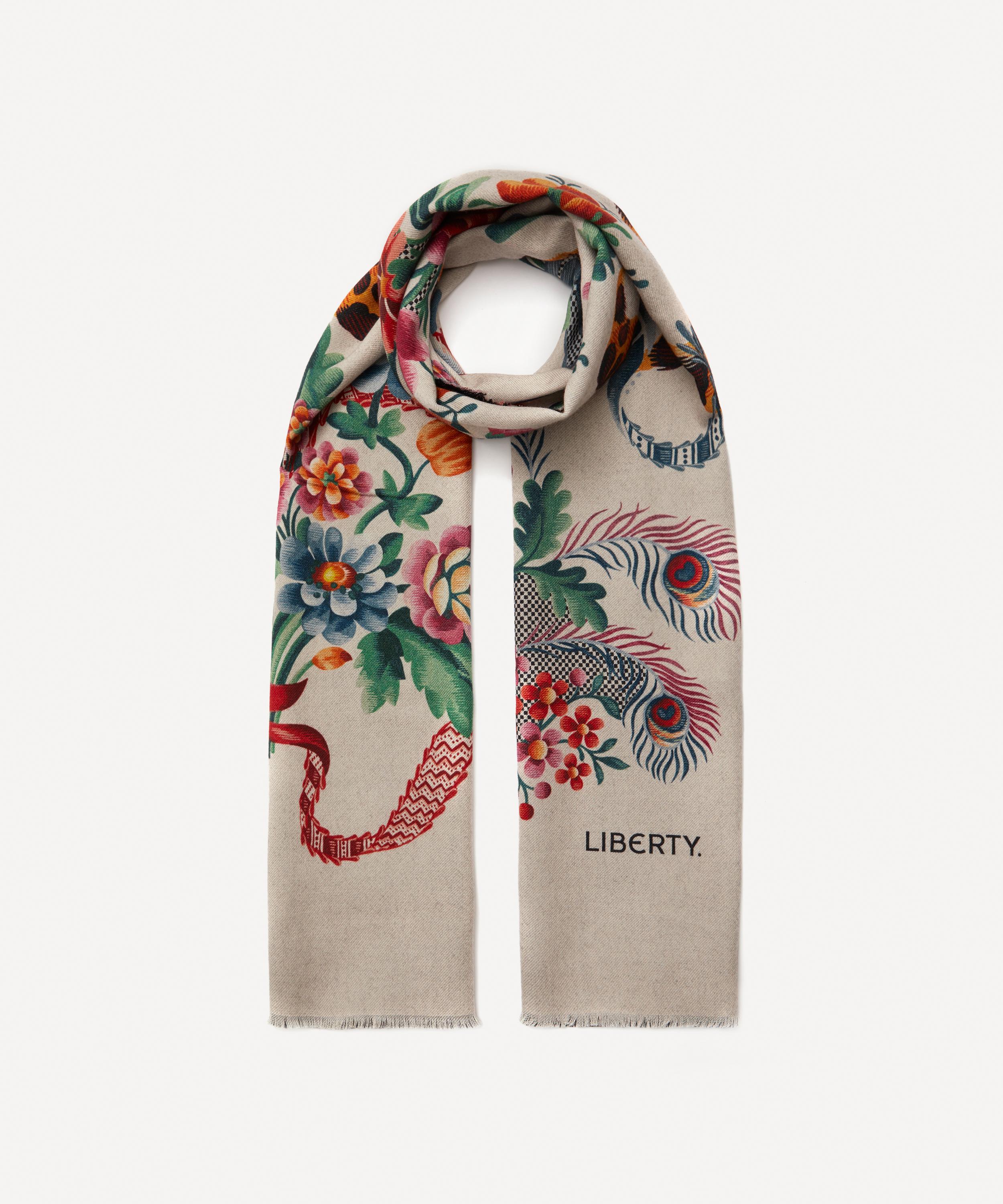 Whether worn as a neckerchief or woven around the handles of your bag, a Liberty scarf is a heroine of versatile styling. This silk-wool blend scarf features Spitalfields Silk – originally dating from around the 1790s, this artwork is based on some of the oldest designs found in the Liberty archive. These artworks would have been hand painted on textile point paper and used as instructions for decorative needlework. The design includes trailing lace elements adorned with flower bouquets, peacock feathers and animal patterned ribbons.
