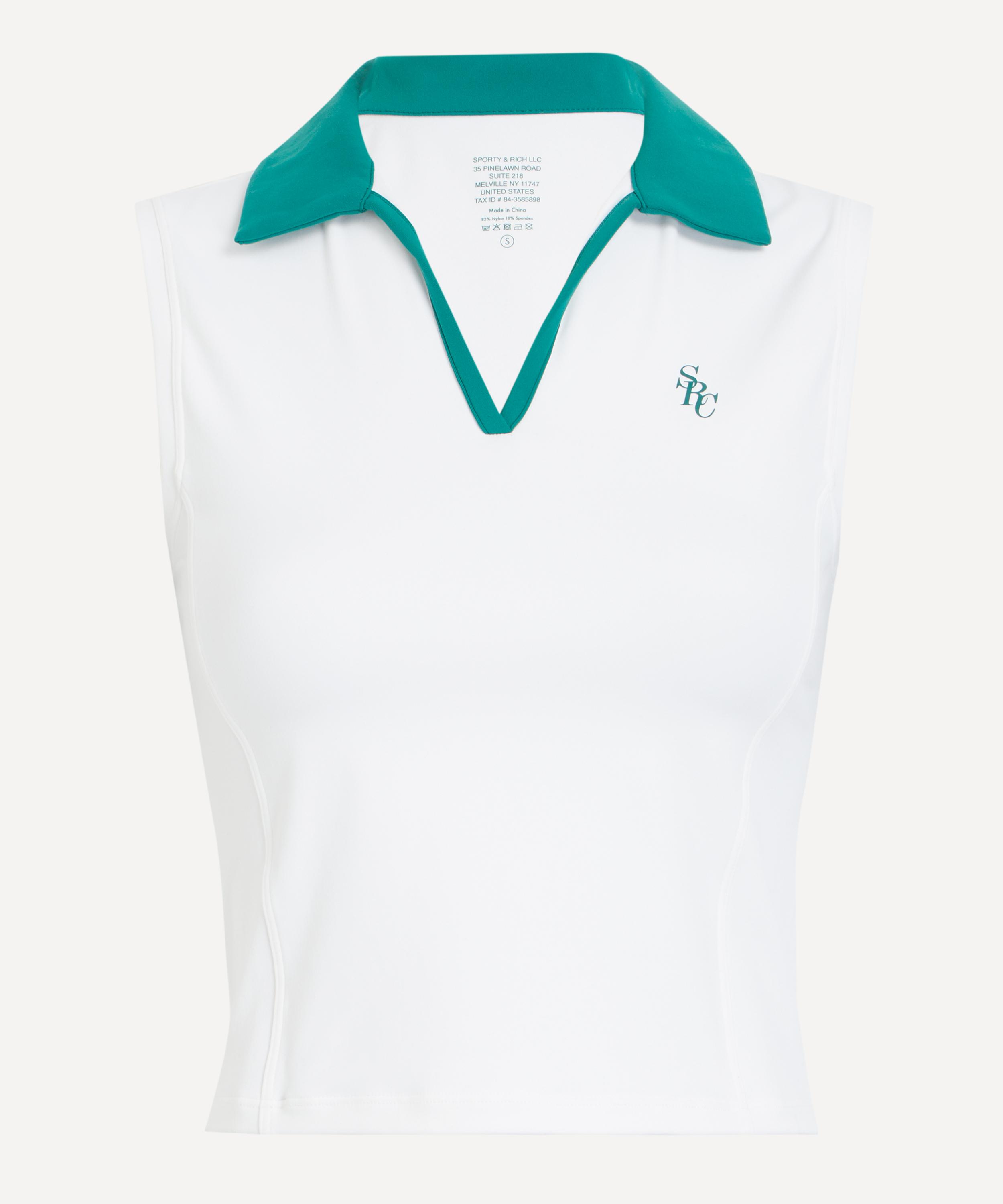 Inspired by classic tennis styles, this sleeveless polo shirt features a contrasting green spread collar, and a printed SRC logo to the chest for a polished, refined touch.