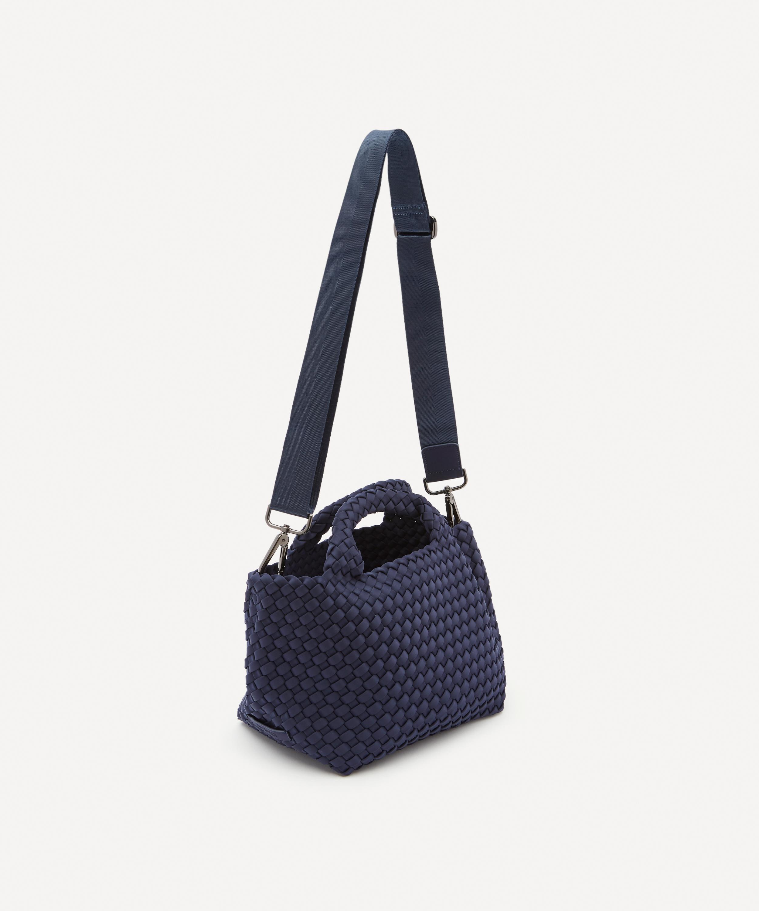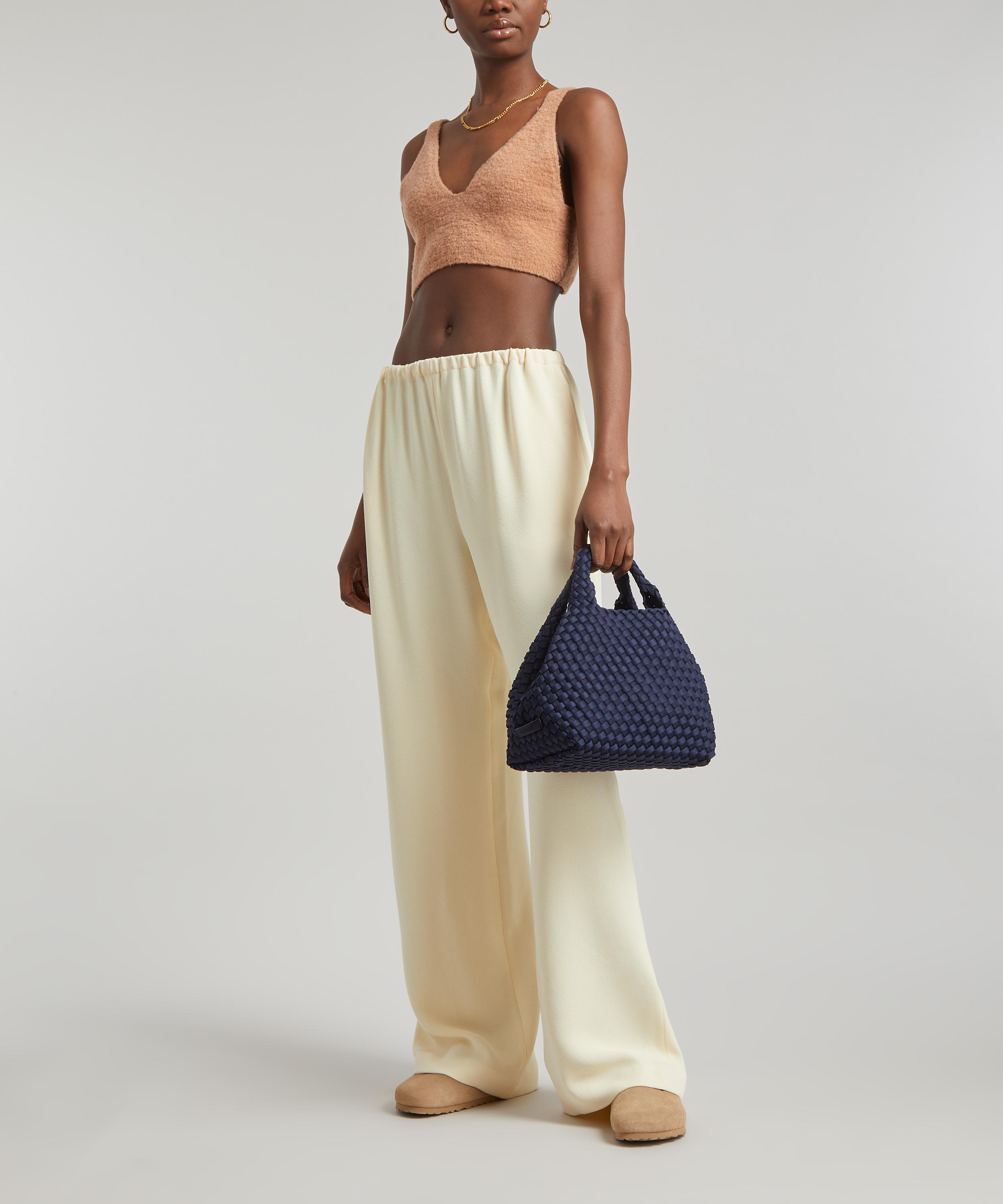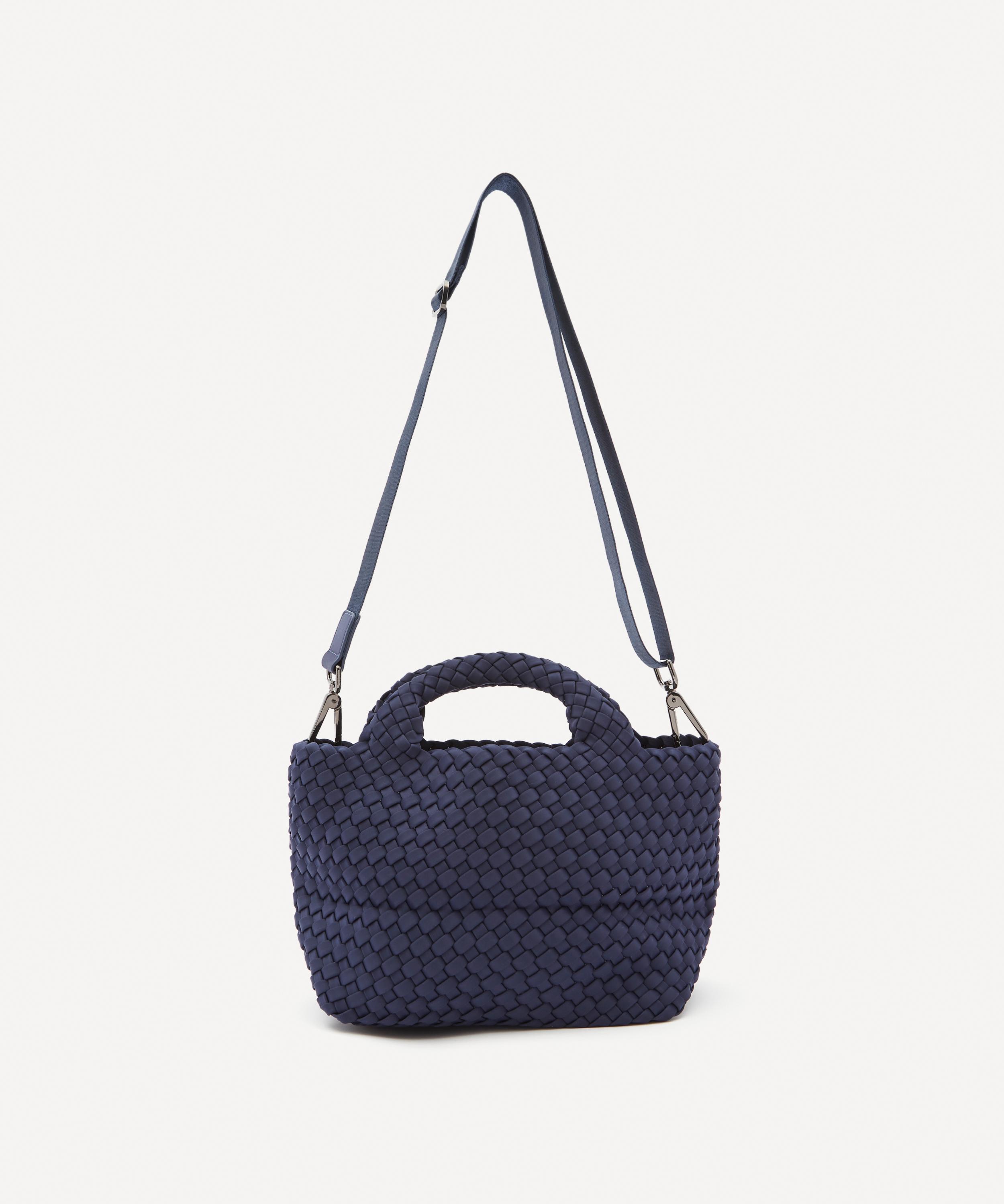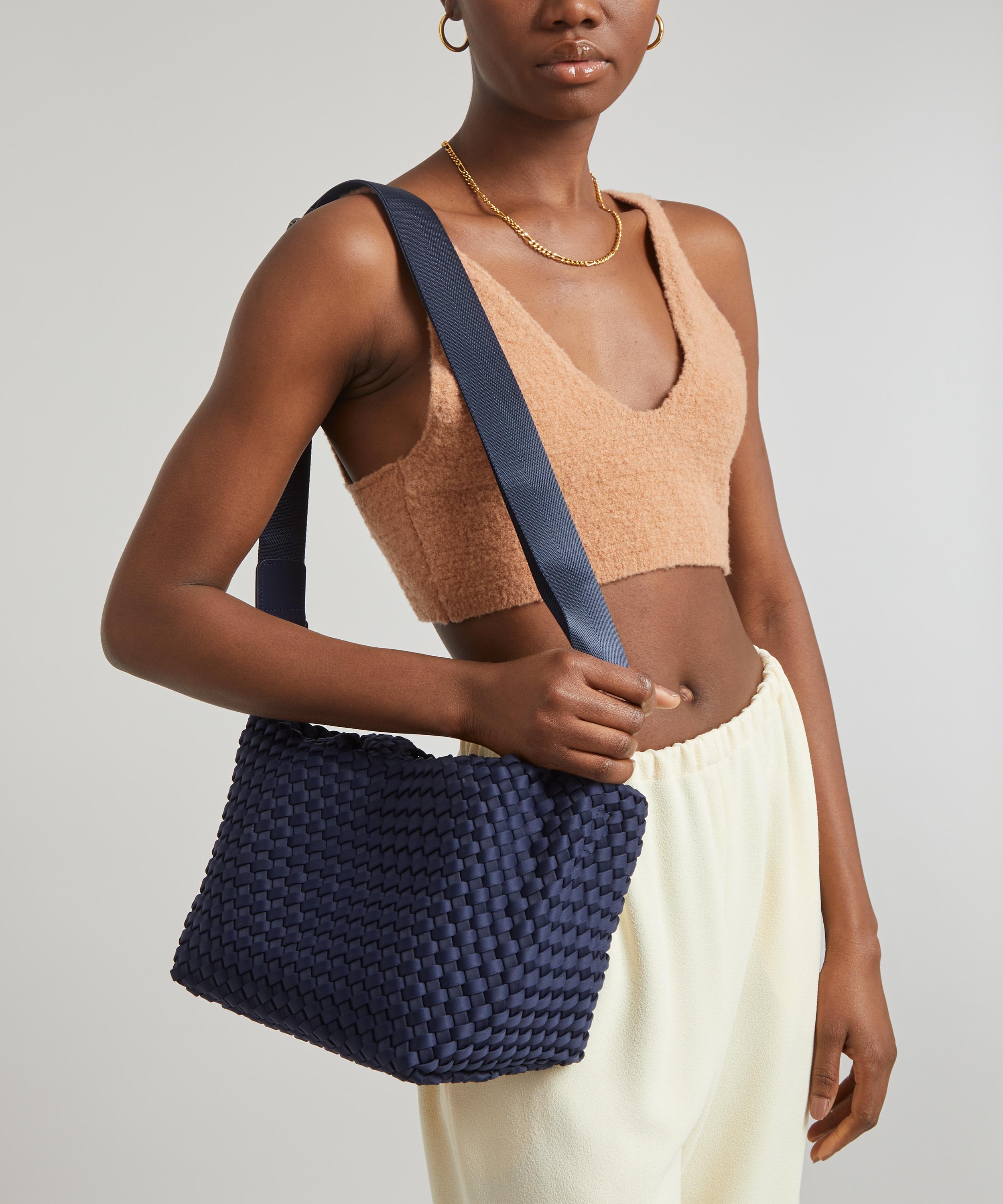 The mini St. Barths tote bag is hand-woven from durable neoprene fabric by New York-based accessories brand Naghedi.