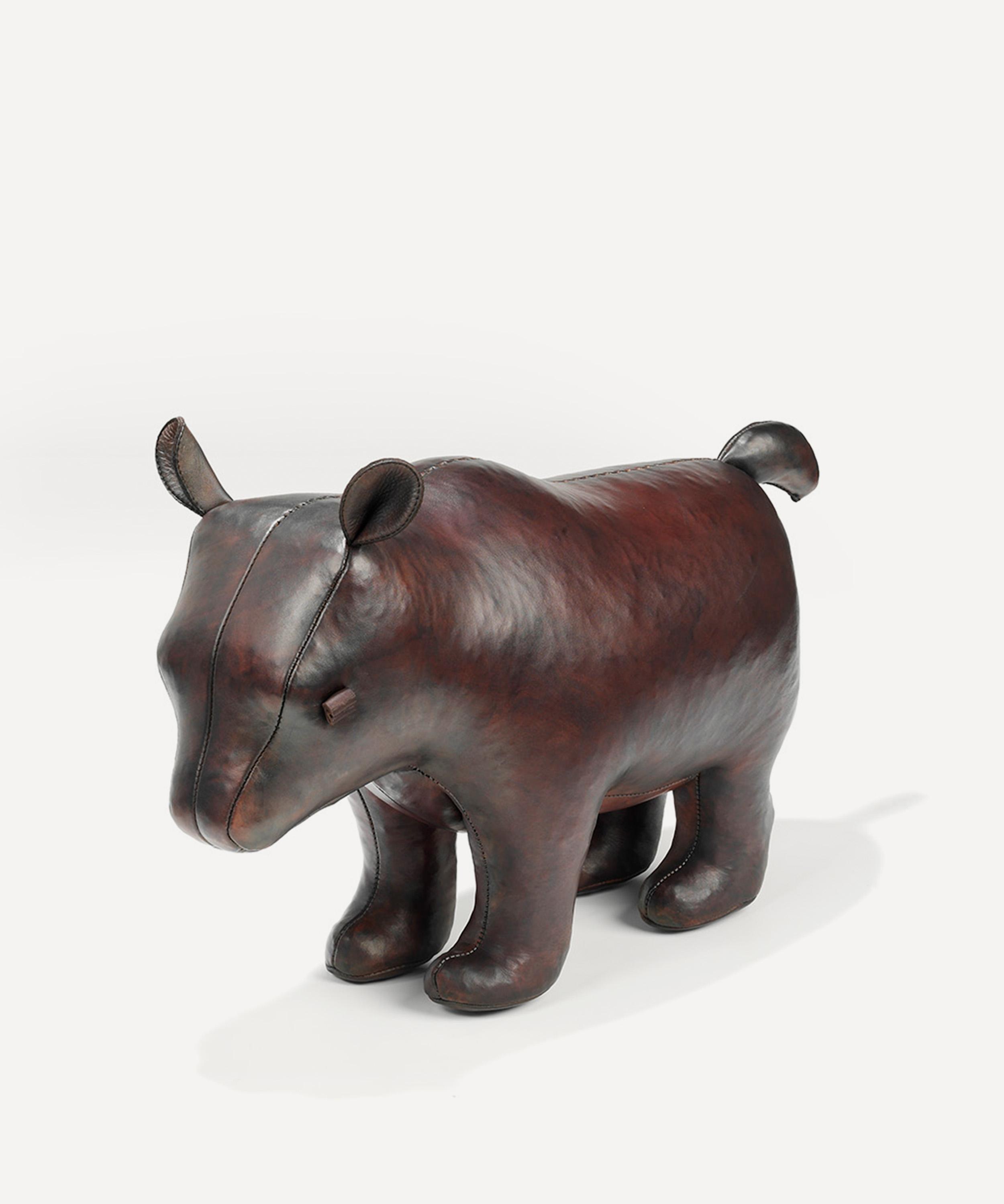 Omersa created their first leather pig in 1927, and it was sold at Liberty. The English full grain cowhide leather, made specifically for Omersa, is hand stained, waxed and polished to create a luxurious rich brown antique finish. A small team of 10 skilled tradesmen in Lincoln design each leather animal, producing one-of-a-kind footstools and desktop accessories.