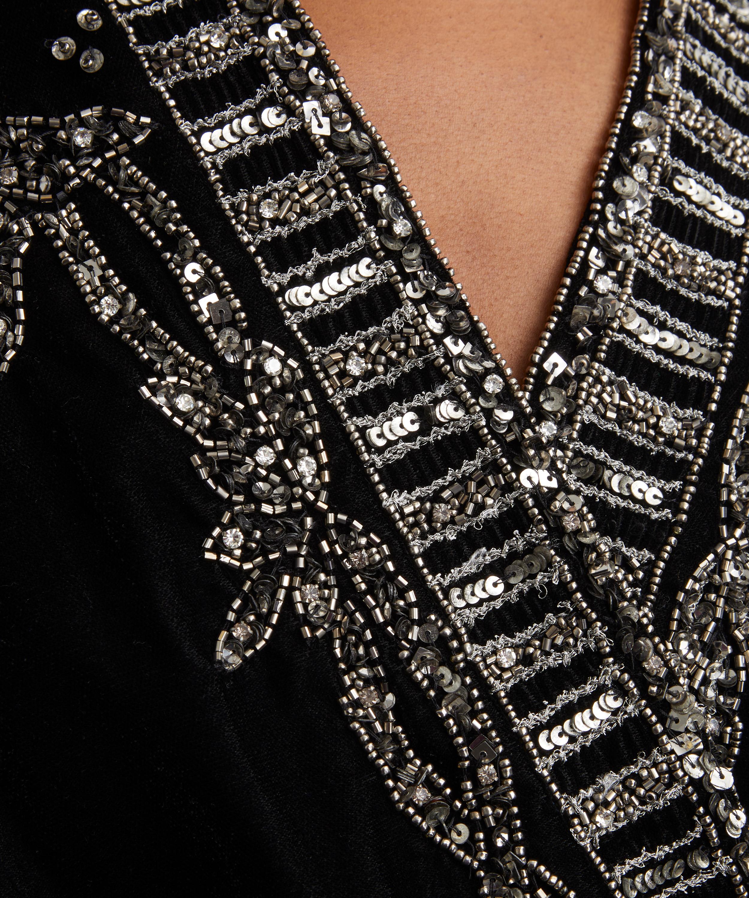 Cut from sumptuous poly velvet, it drapes in a straight silhouette with a graceful overlap fit. Handmade embroidery with sequins and beads adds a delicate touch of texture and sparkle. A statement piece for the wardrobe, the Starlight Kimono combines timeless sophistication with artisanal artistry.