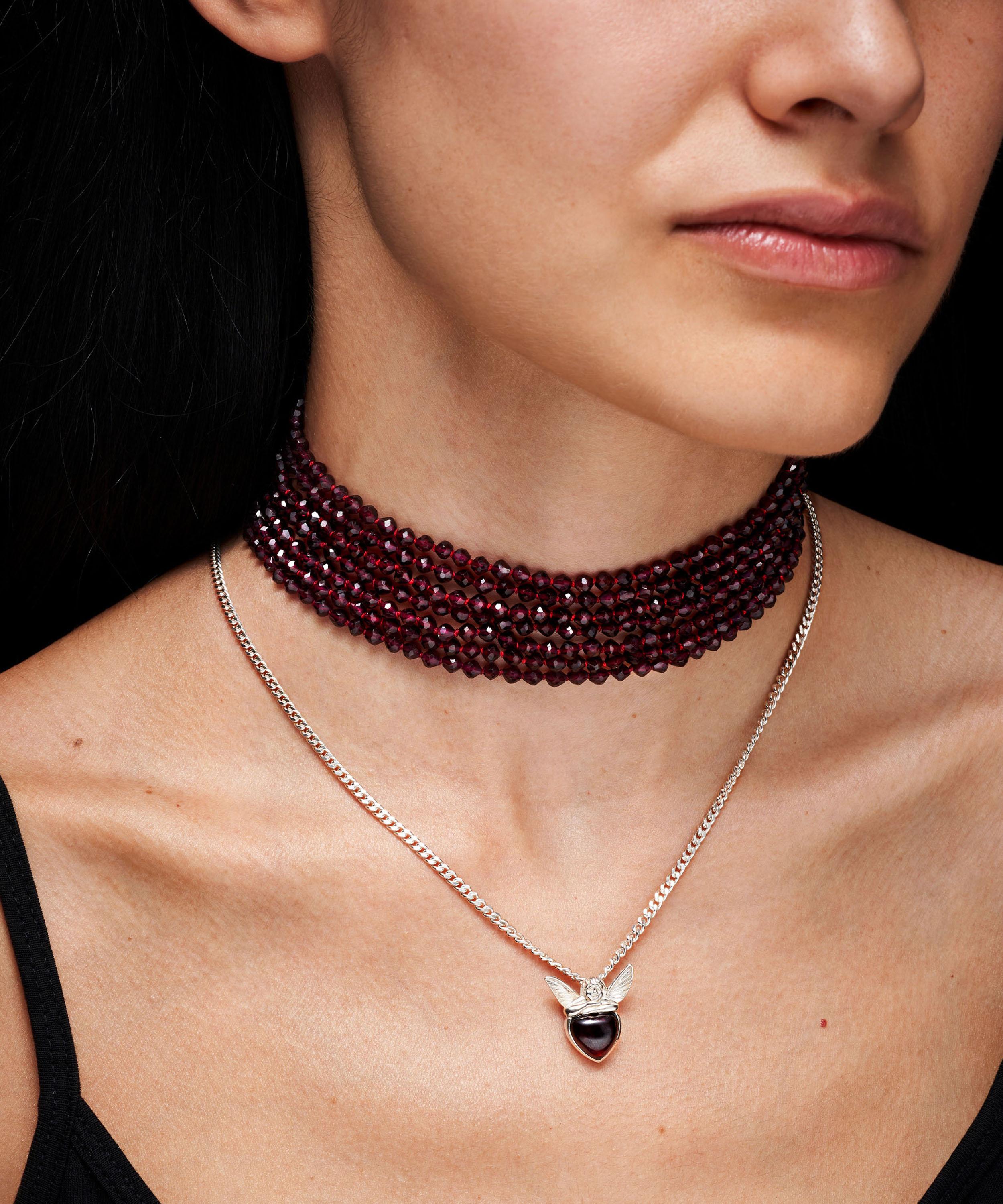 Beaming with mystic, the Cherub Garnet pendant necklace from Maria Nilsdotter will breathe new life into any old jewellery box. Exuding an endearing beauty with gothic undertones, it pays homage to celestial beings depicted in Tarot cards, featuring an intricate cherub pendant in textured sterling silver, juxtaposed by a fiercely red garnet stone. Perfect for both occasion wear and elevated everyday looks, style this captivating piece as a statement necklace, or incorporate it into a curated stack.