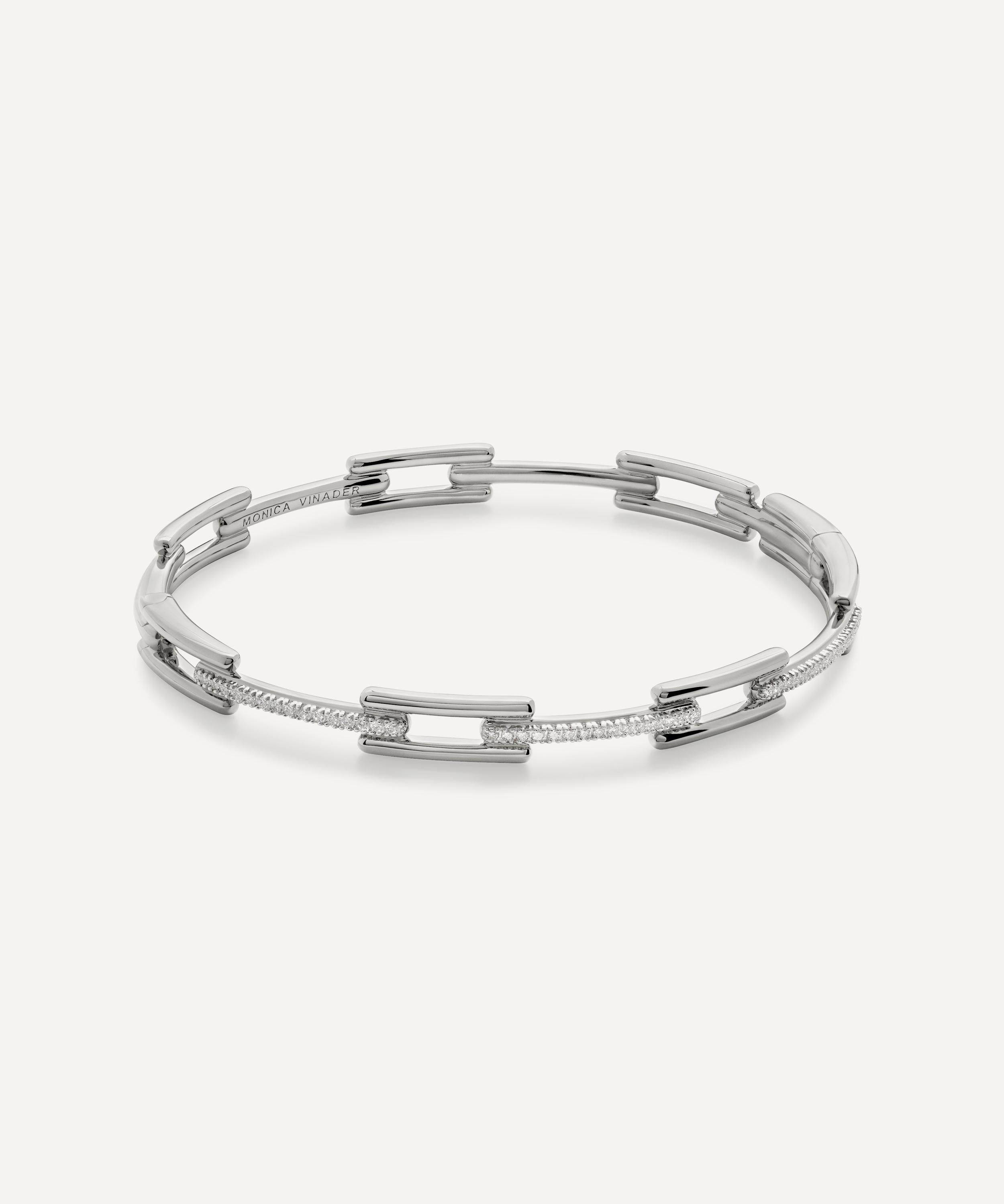 Crafted from sterling silver, this bracelet takes inspiration from contemporary architecture, combining strong, clean lines and flowing curves for a modern and feminine finish. Perfect for stacking or styling alone, it features geometric links and pavé-set lab grown diamonds - try wearing it with several contrasting Signature bangles for a seamless stack of polished metal that will instantly compliment your attire.