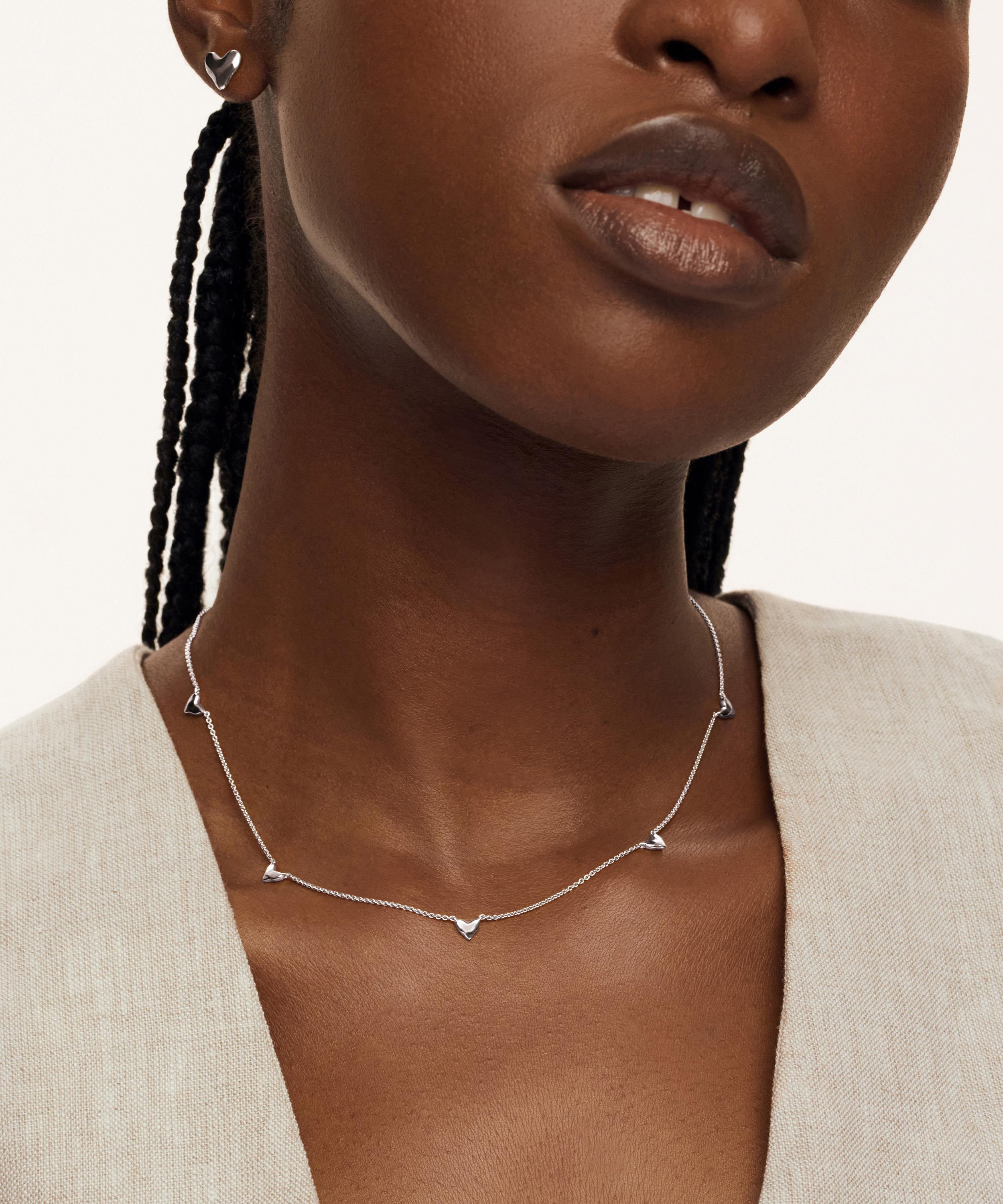 Empower your individual style and transform curated outfits with this contemporary station necklace from Monica Vinader. Crafted from sterling silver, it features a fine link chain adorned with five heart-shaped pebble charms in a polished finish. Wear solo, or stacked and style alongside your go-to gold earrings.
