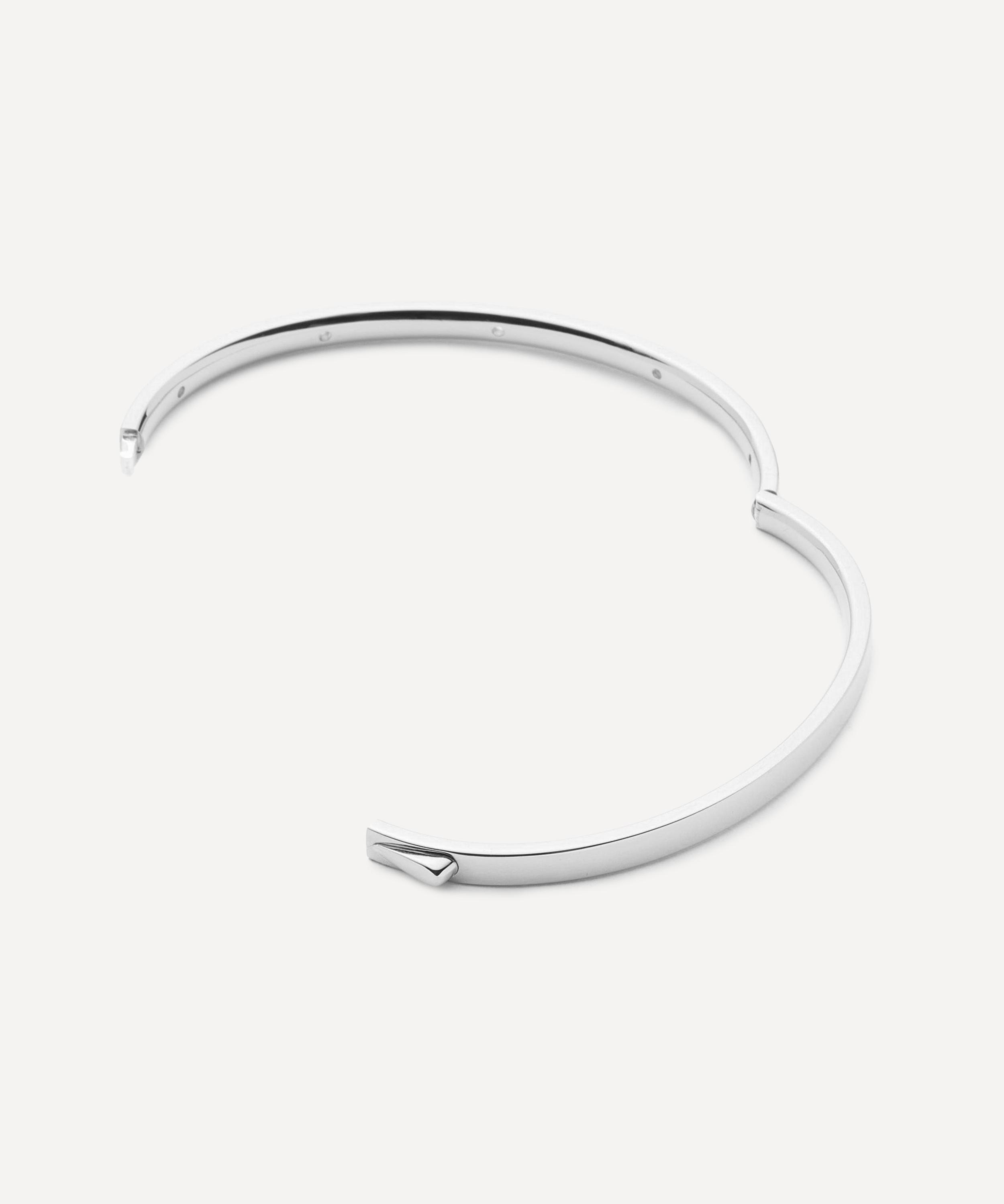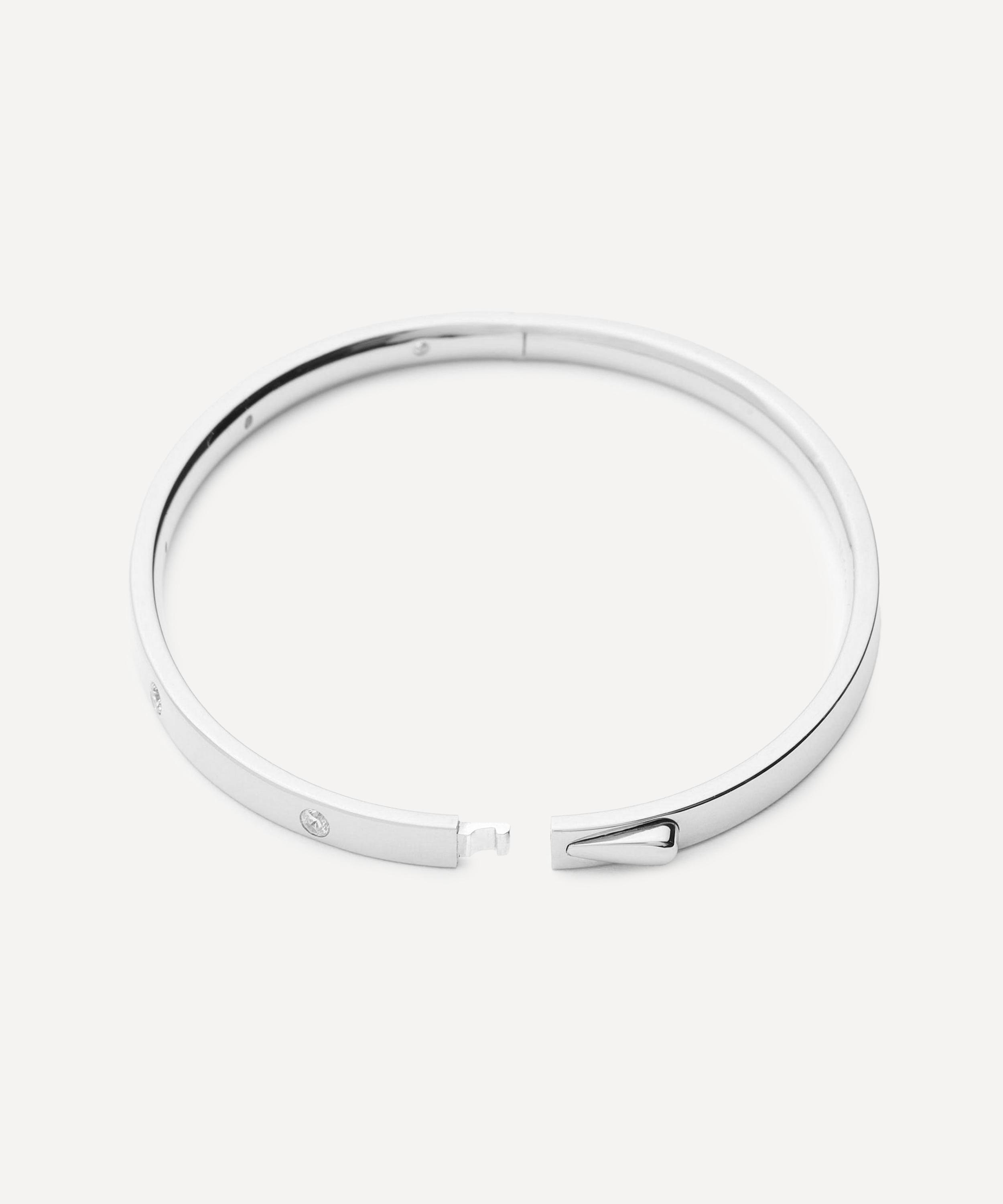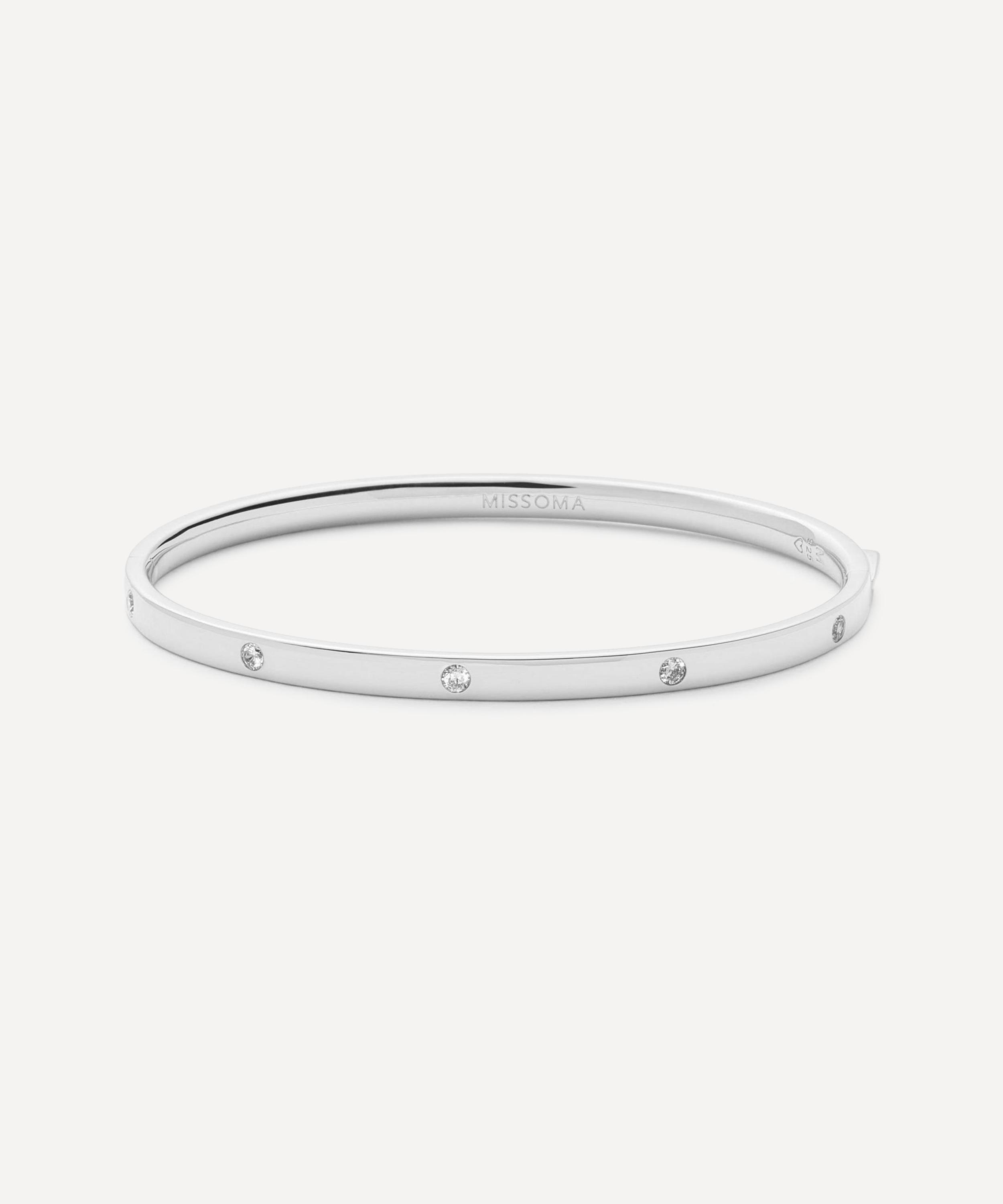 Enhance the appeal of everyday looks and occasion outfits with the Interstellar Hinged Bangle Bracelet from Missoma. Boasting an essential jewellery box staple, it features a hinged oval shape in sleek rhodium-plated silver, adorned with sparkling cubic zirconia stones. Due to its sleek and simple design it offers versatile wearability. Style it solo for a minimal look, or pair it with a mix of chains and additional cuff bracelets to create a bold wrist stack.