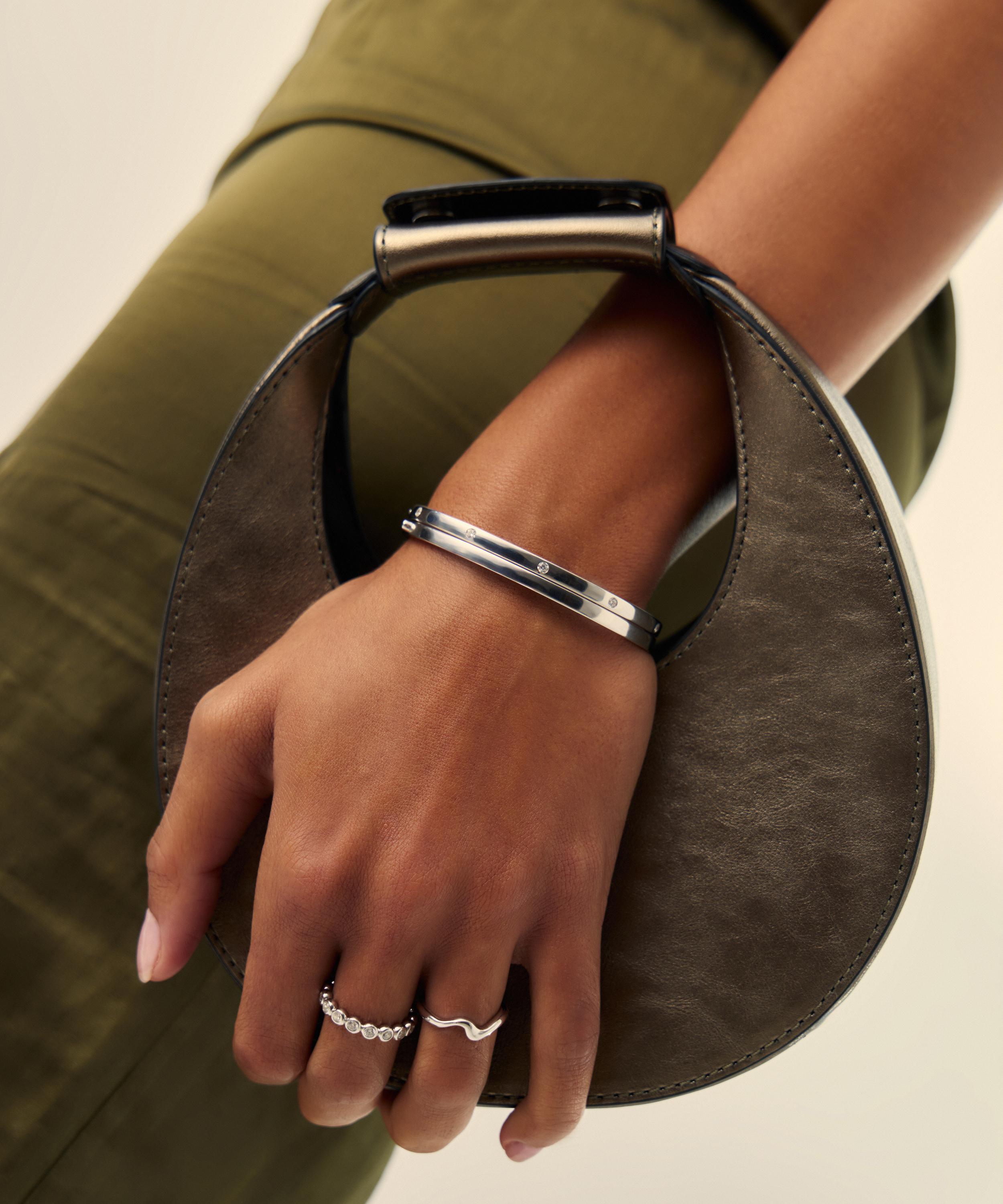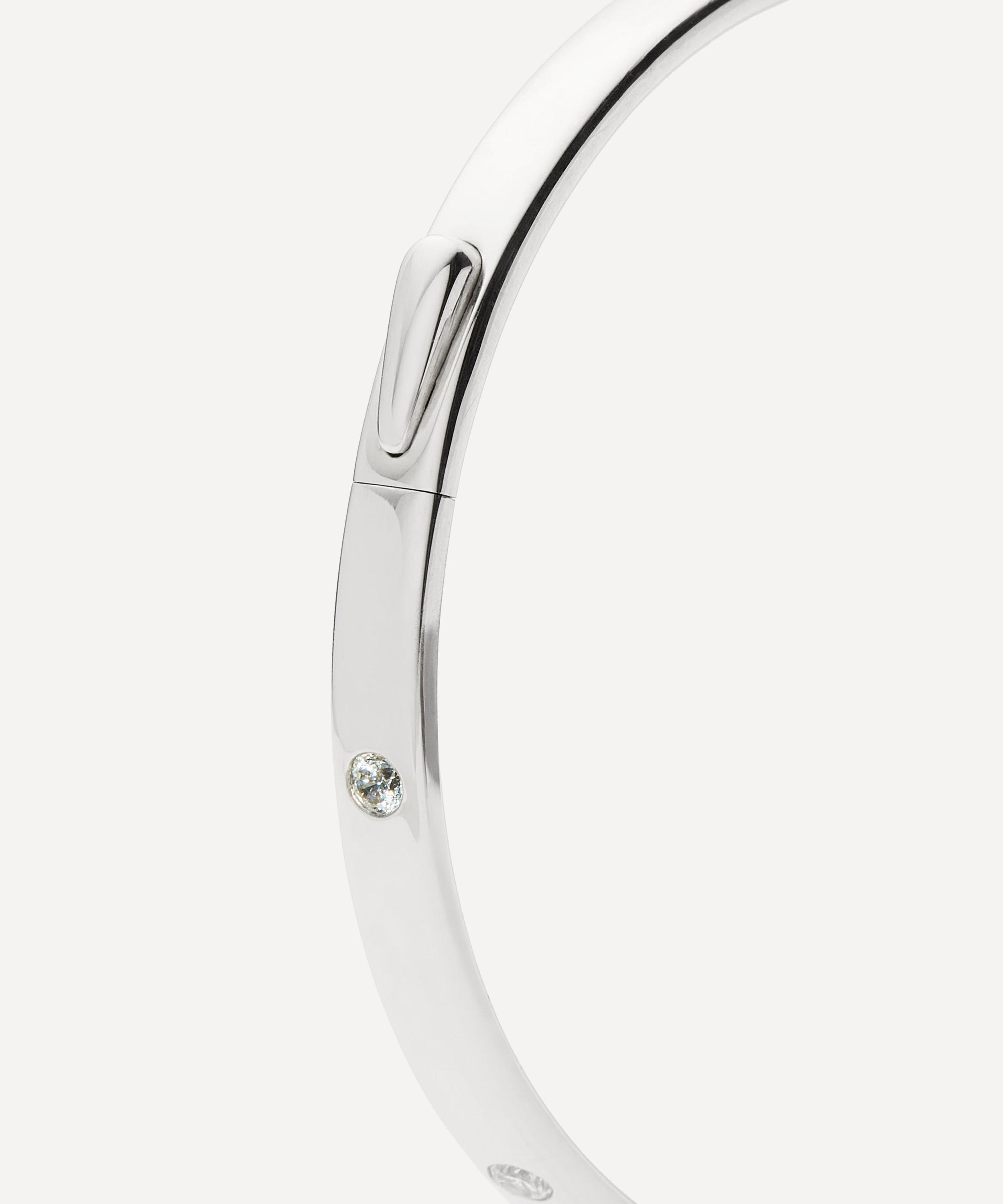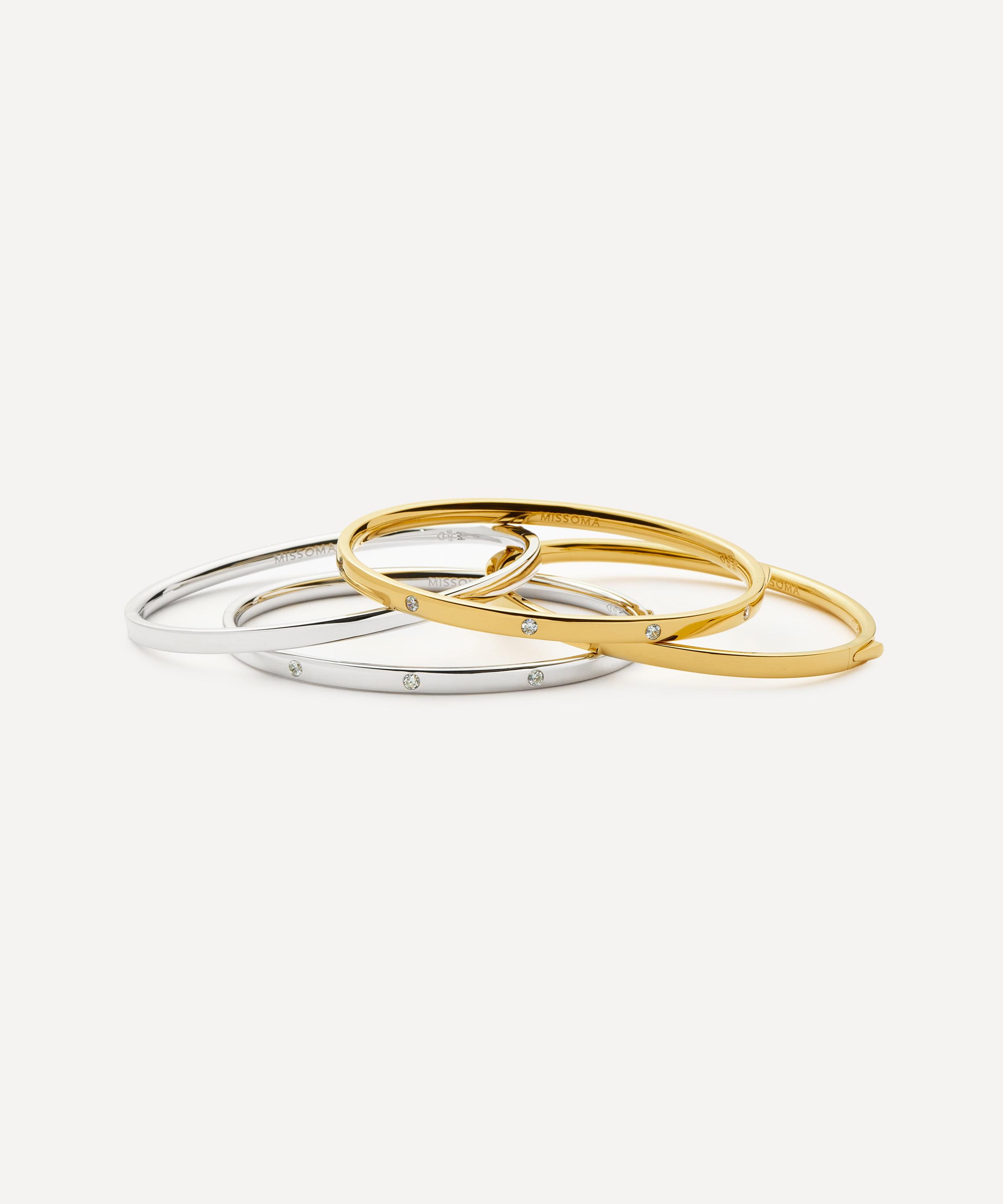 Enhance the appeal of everyday looks and occasion outfits with the Interstellar Hinged Bangle Bracelet from Missoma. Boasting an essential jewellery box staple, it features a hinged oval shape in sleek rhodium-plated silver, adorned with sparkling cubic zirconia stones. Due to its sleek and simple design it offers versatile wearability. Style it solo for a minimal look, or pair it with a mix of chains and additional cuff bracelets to create a bold wrist stack.