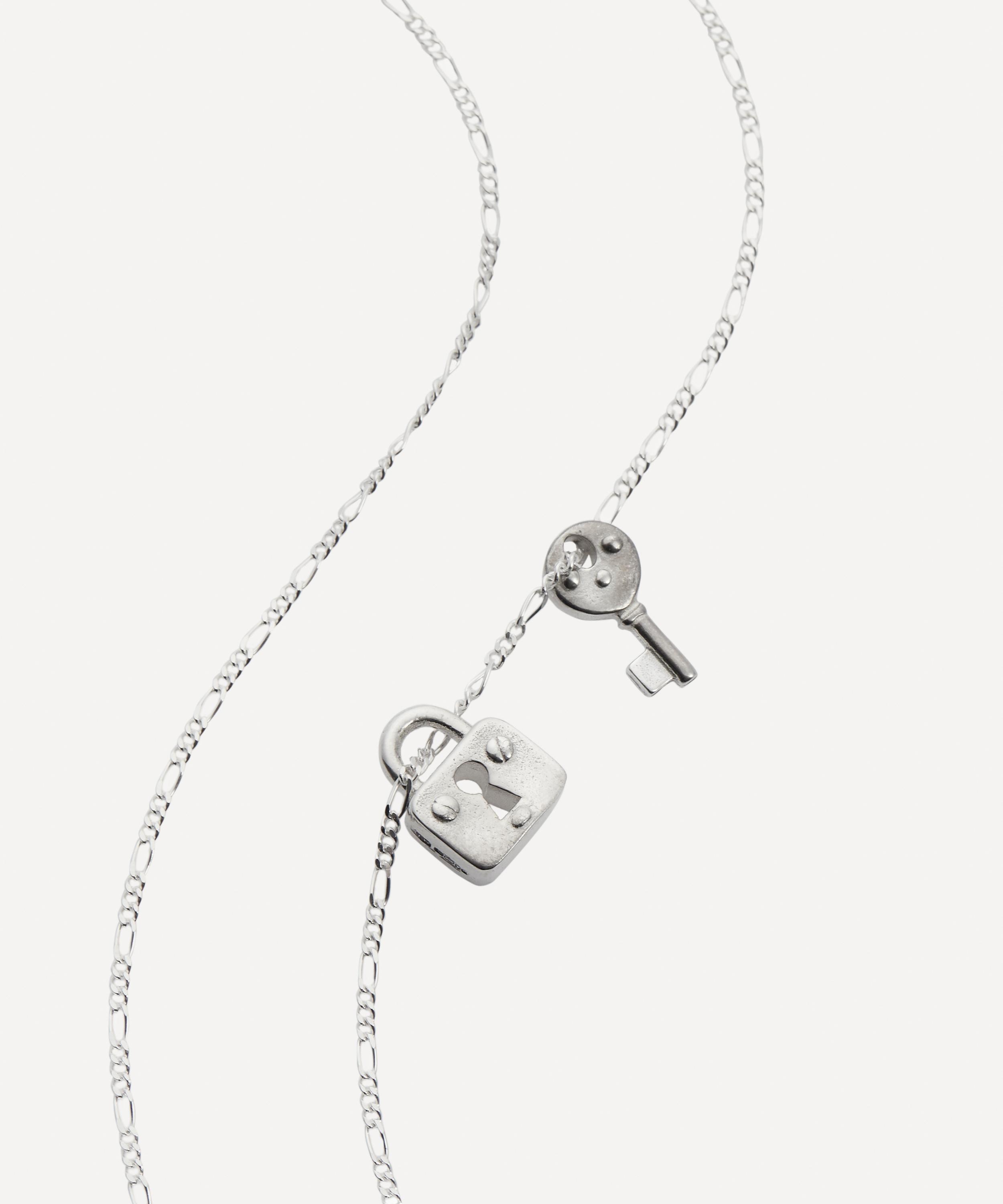 Finely cast and hand finished in London from sterling silver, this charming necklace features a figaro chain in a high-polish finish and lock and key charms, cleverly designed to fit together and complete with distinctive signature face designs.