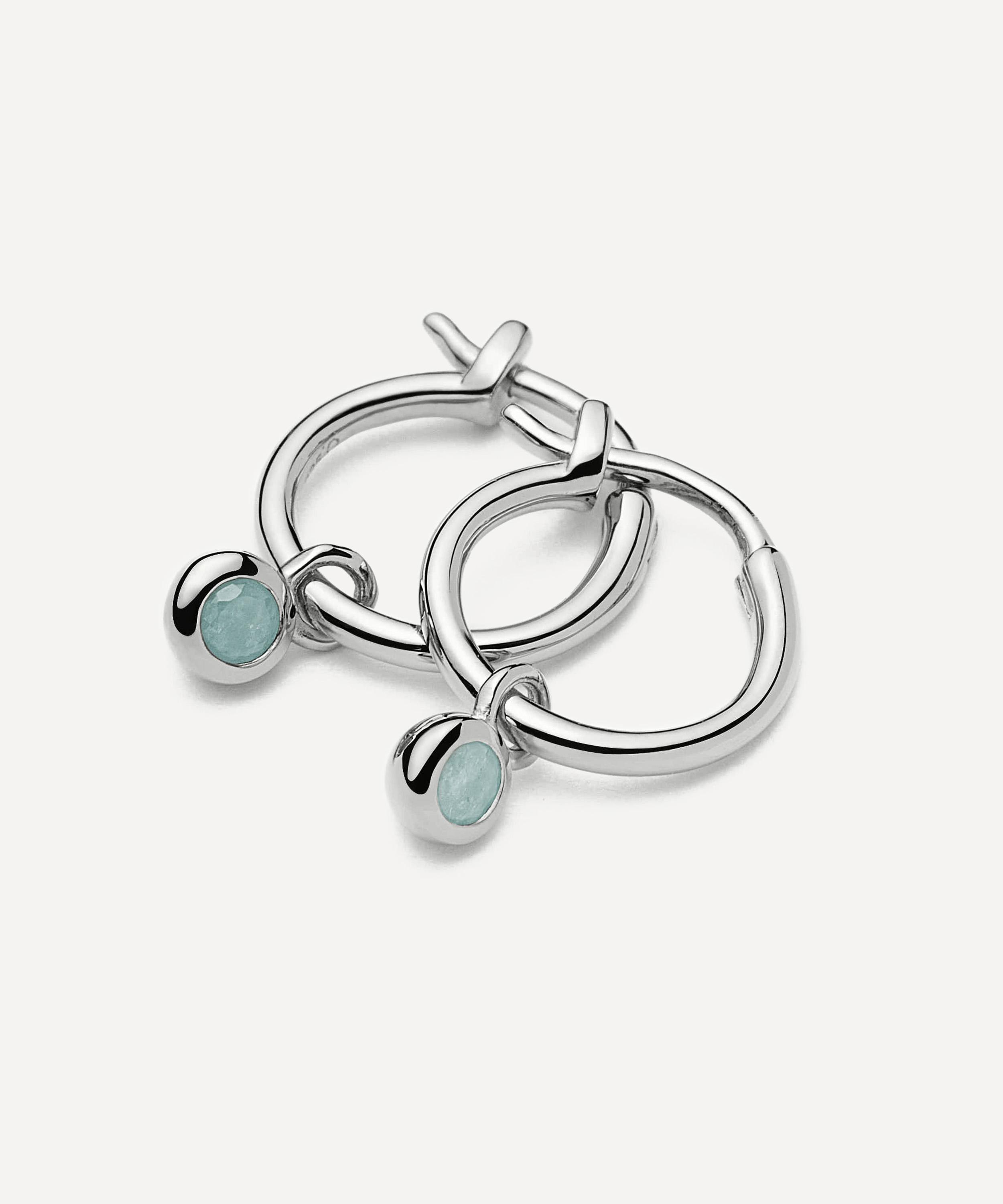 Crafted from rhodium-plated sterling silver, each earring features a polished hoop adorned with a faceted aquamarine gemstone – perfect for anyone born in March. Personal and playful in equal measure, they make for a thoughtful gift, whether chosen for birth month or their timeless allure. Style them alone for a quiet statement or layer into your ear stack for a curated look.