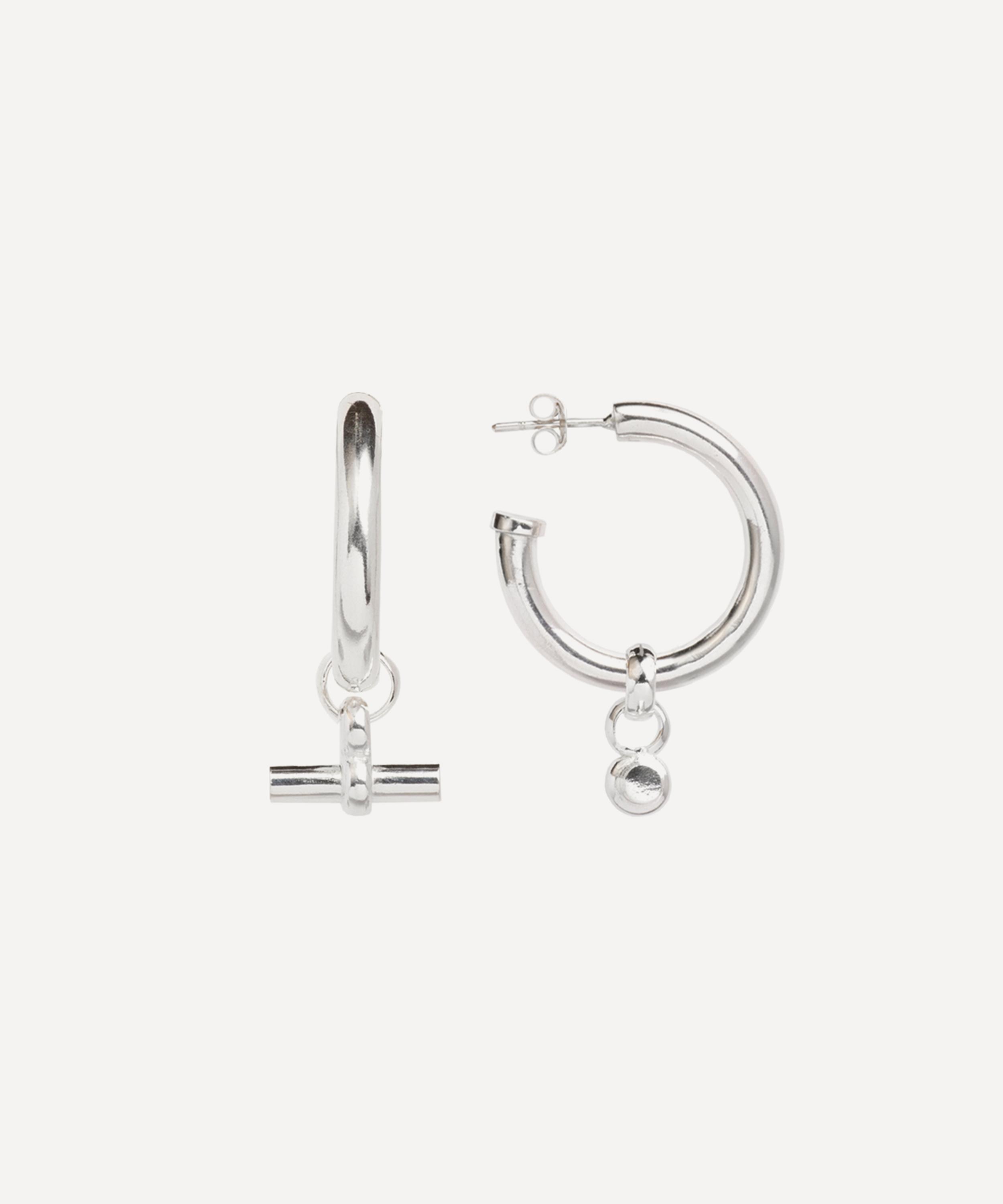 Effortlessly transform everyday outfits with these stackable drop hoop earrings from Tilly Sveaas. Crafted from sterling silver, each earring features a sleek half hoop embellished with an elegant T-bar drop. Offering visual interest to your look, this pair strike a balance between contemporary design and ageless staples to serve as a building block in your jewellery collection.