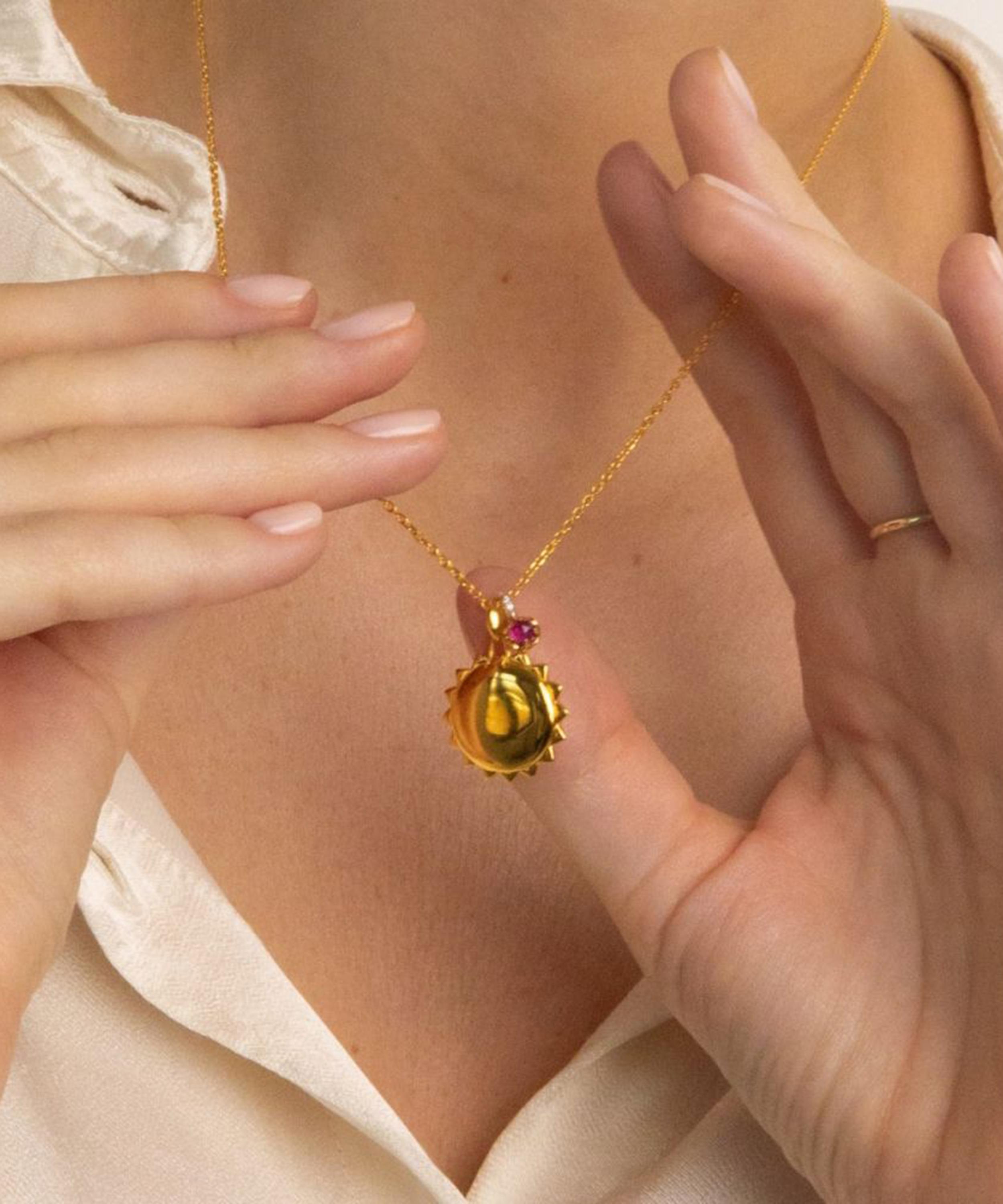 Update your regular line-up with this exquisite Sun Locket Necklace from Dinny Hall’s My World collection – a symbolic selection of locket necklaces, rose-cut birthstone charms and celestial motifs.