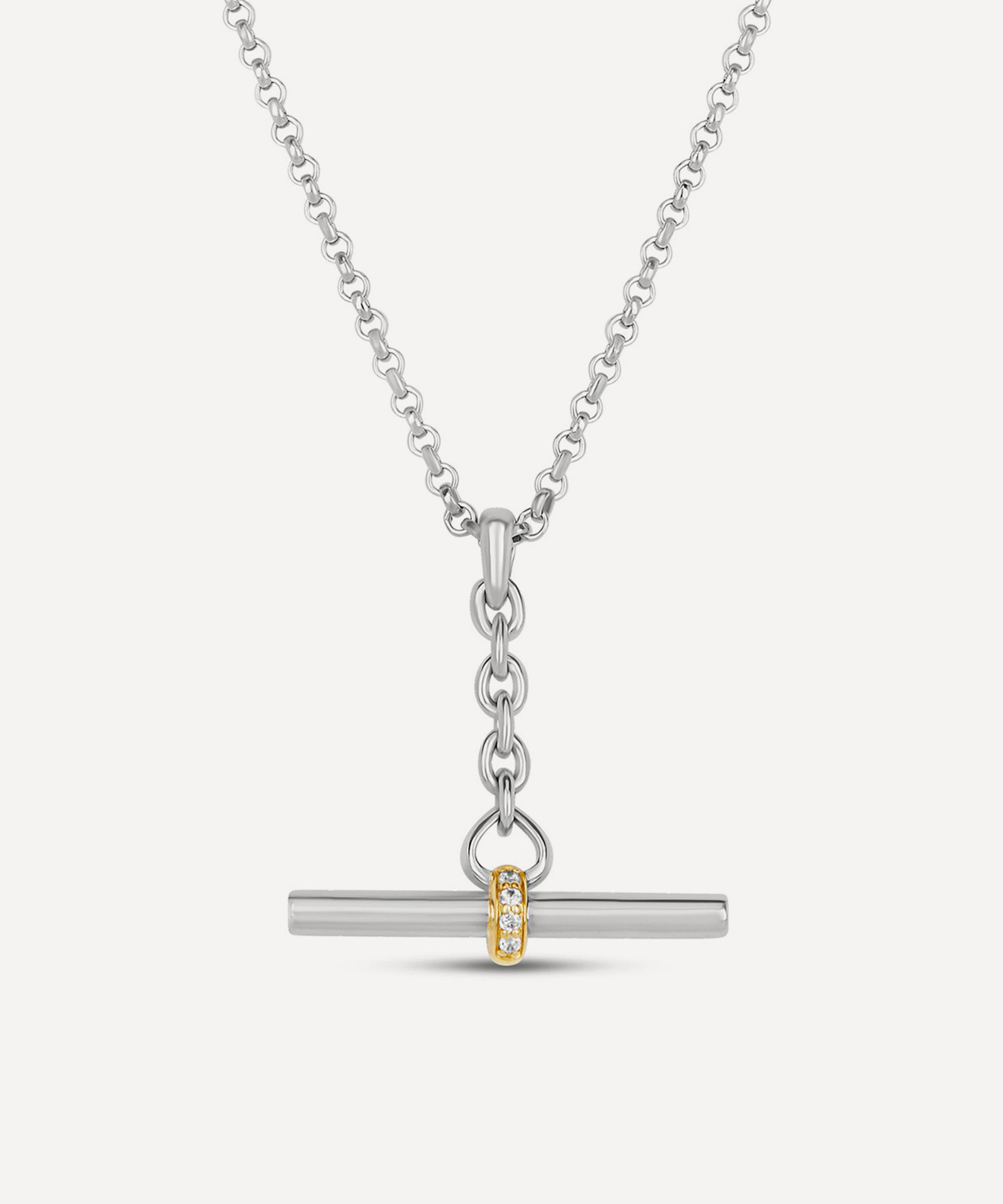 Update your regular line-up with this exquisite pendant necklace from Dinny Hall’s My World collection – a symbolic selection of locket necklaces, rose-cut birthstone charms and celestial motifs. Crafted from sterling silver, it features a classic rolo chain and a sleek T-bar threaded with a diamond set charm at the centre. Style yours solo or stacked.