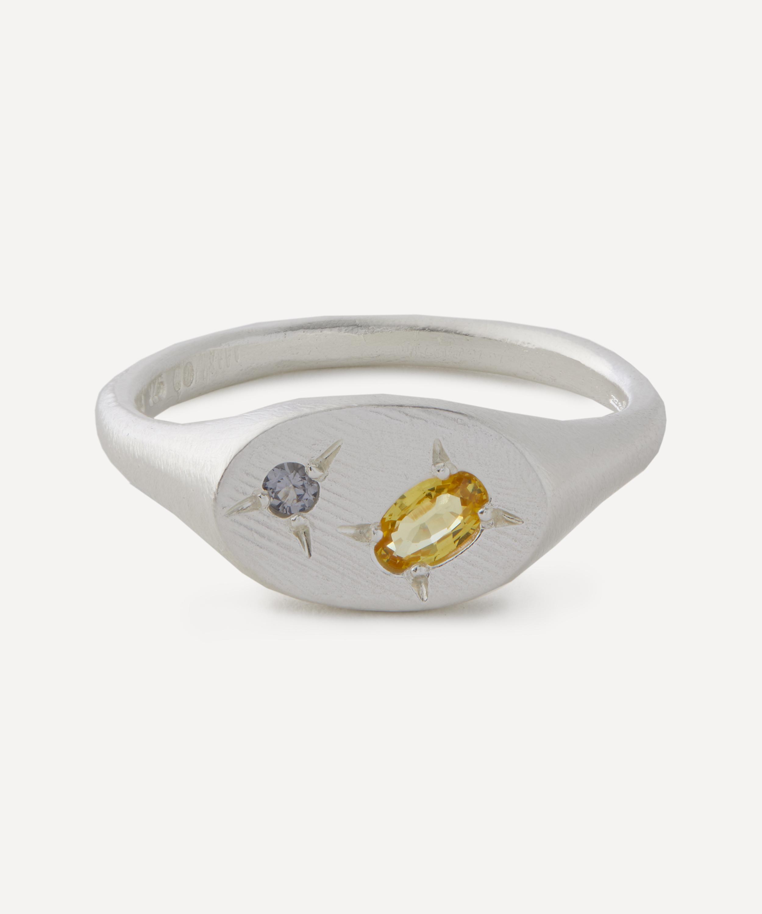 Handmade in Melbourne from sterling silver, it features a rounded band and flat, oval-shaped feature adorned with a sapphire and spinel stone – perfect for injecting a burst of individuality into your everyday jewellery line-up.