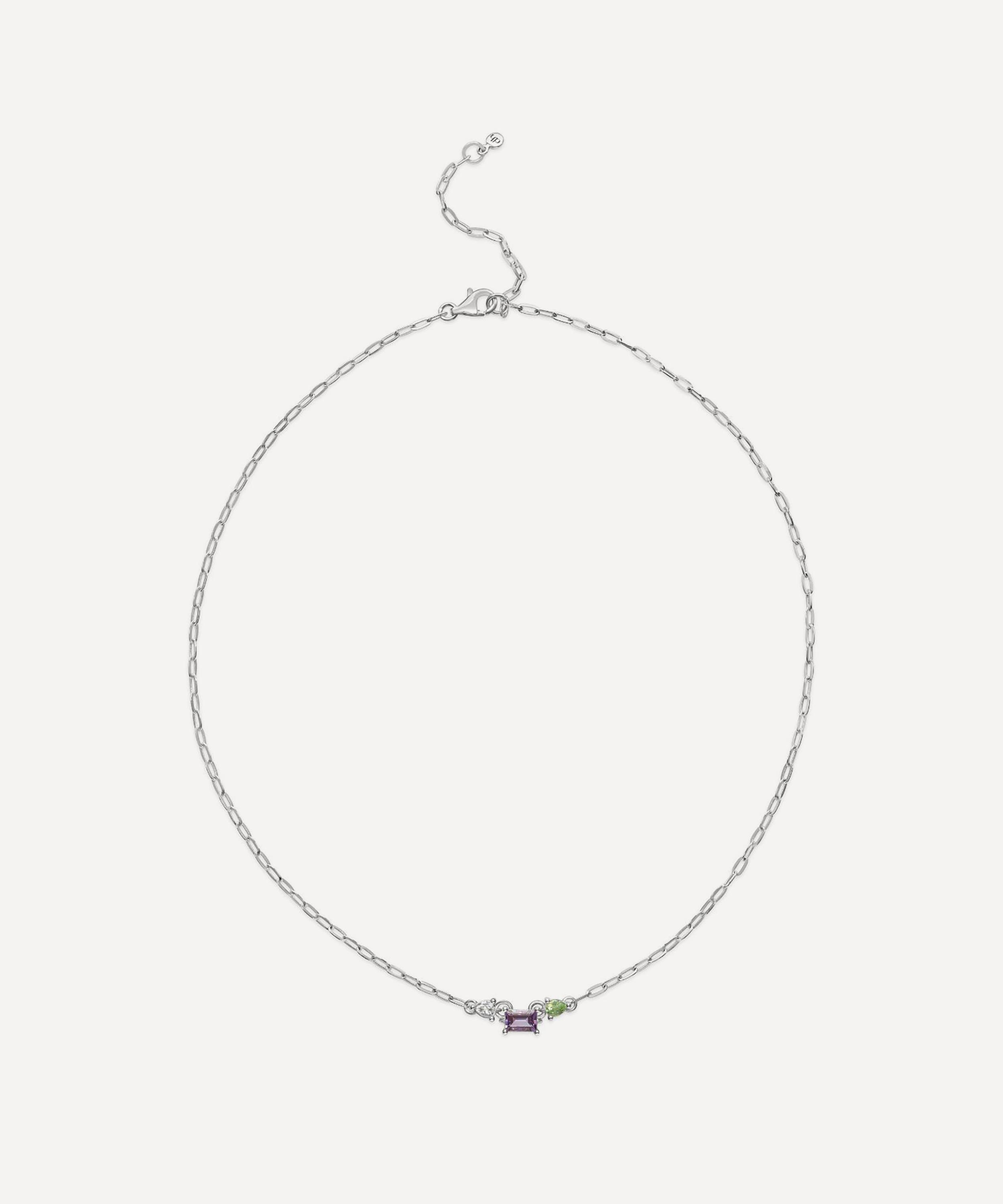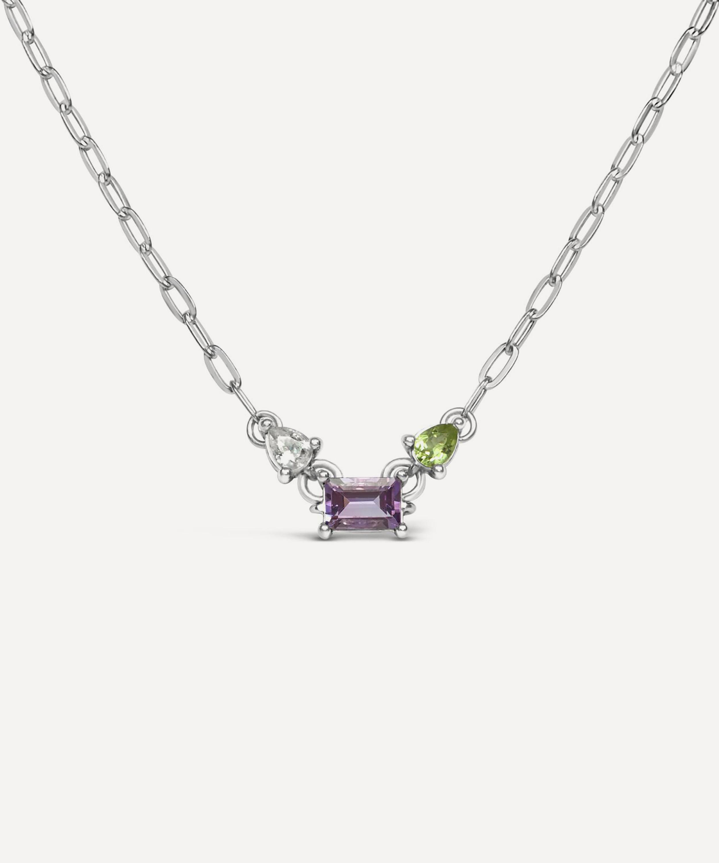 Crafted from sterling silver, it features a hammered paperclip chain adorned with a trio of gemstones including a pear cut peridot and a pear cut white sapphire, flanking a baguette cut amethyst - this impressive burst of hues represents the suffragette colours, violet for dignity, green for hope, and white for purity. Wear it solo or layered, team with other pieces from the collection, or gift to a loved one.