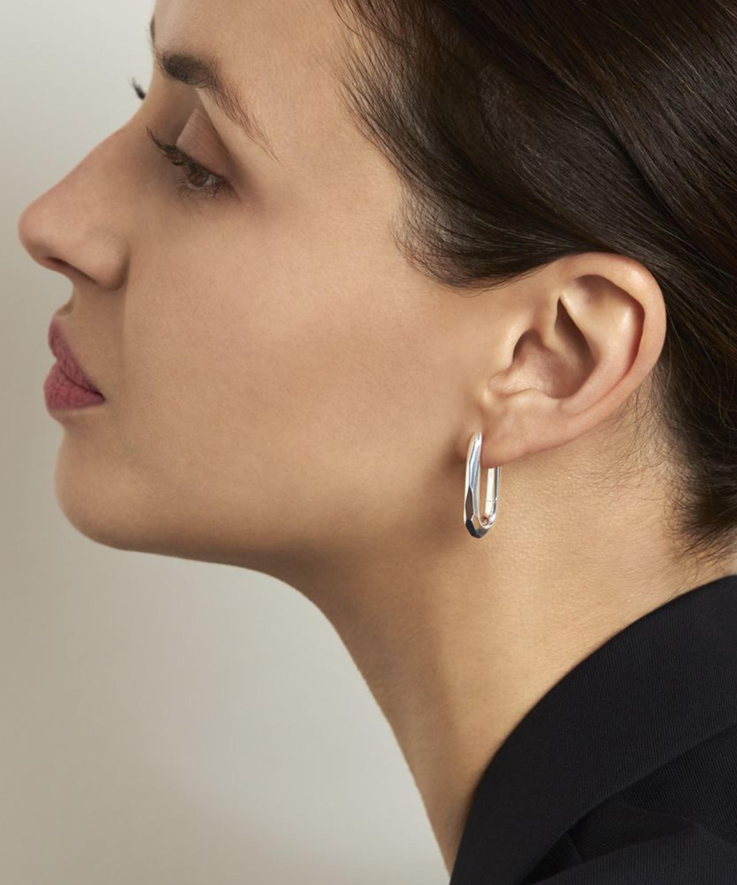 Crafted from sterling silver, these earrings have been hand-carved in wax and moulded into an elongated, oval silhouette with a faceted design. Complete with a polished finish, they boast a reimagined take on a classic staple – wear them solo for a minimal approach or stack them with other hoops for a layered curation.