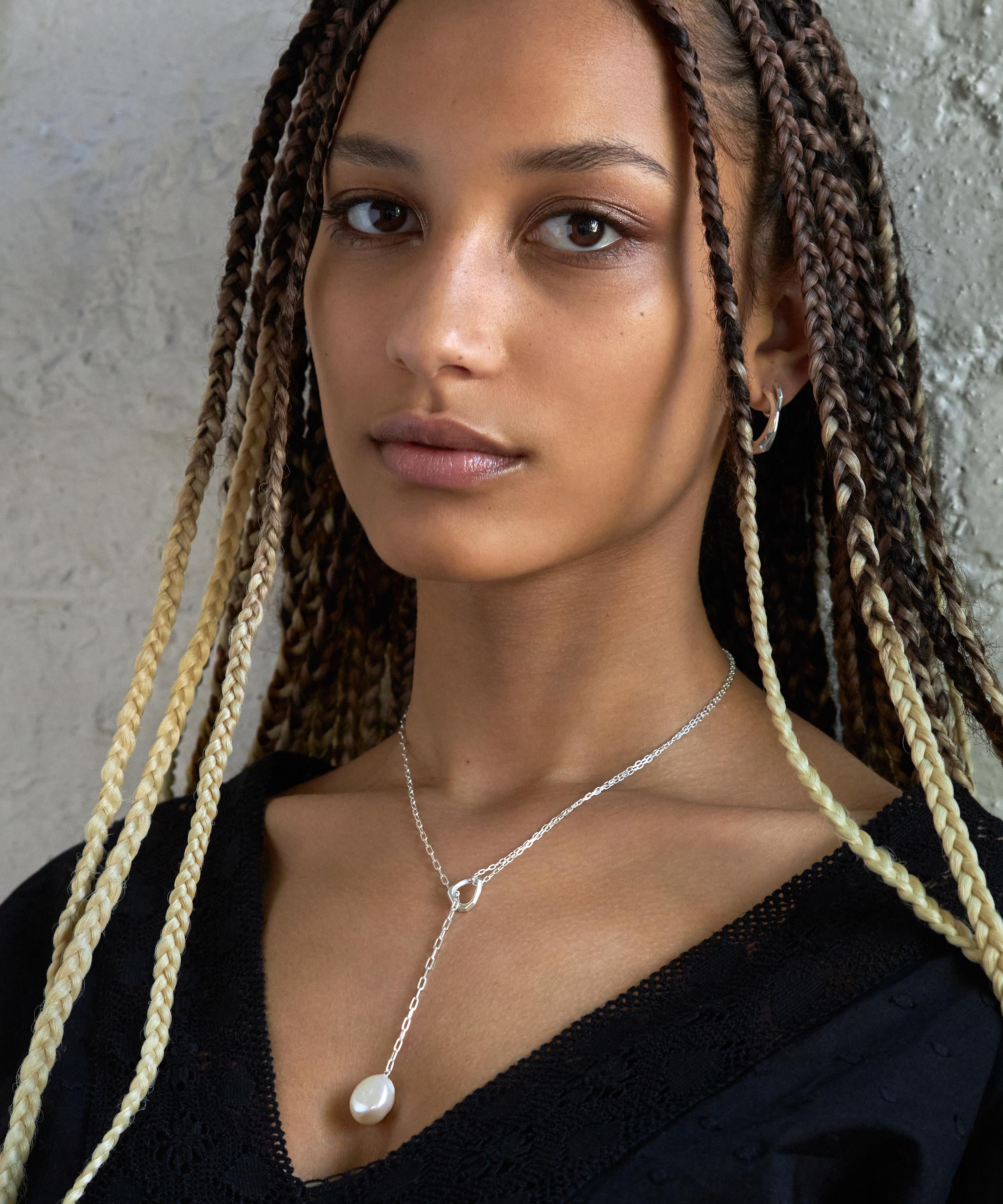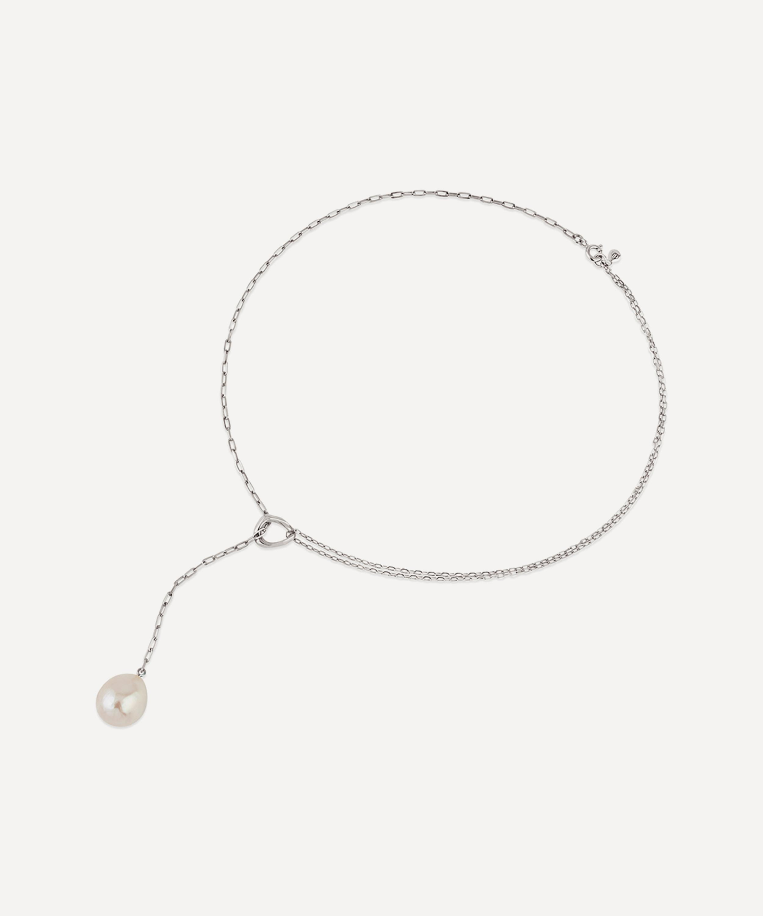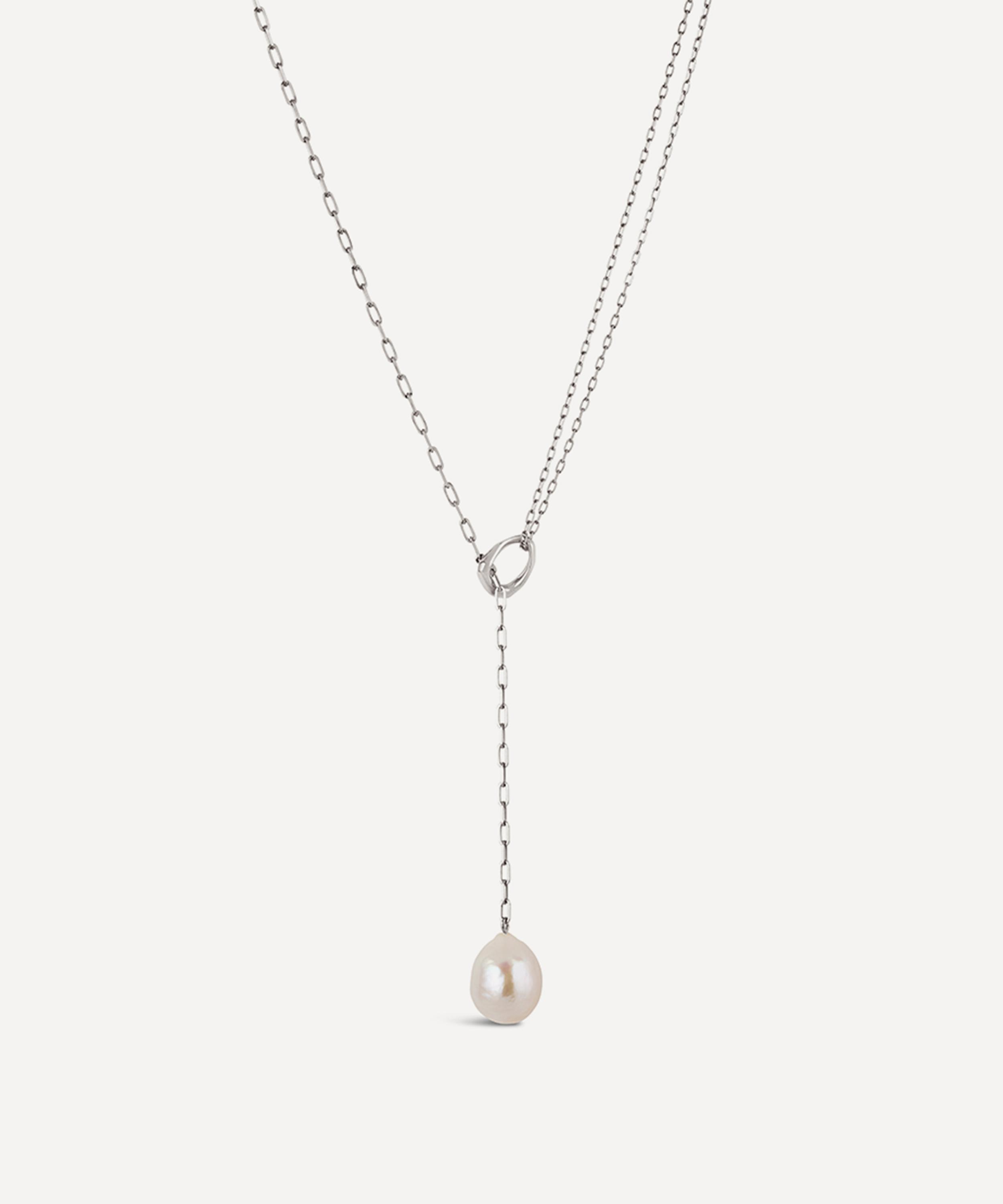 Crafted from recycled sterling silver, this lariat necklace features a baroque freshwater pearl pendant with a double row of hammered trace chains and a faceted link that threads through the chain. Complete in a polished and light refracting finish, it makes for a mini statement piece perfect for everyday styling. Wear it alone, or layer it with additional chains for a trend-led finish.