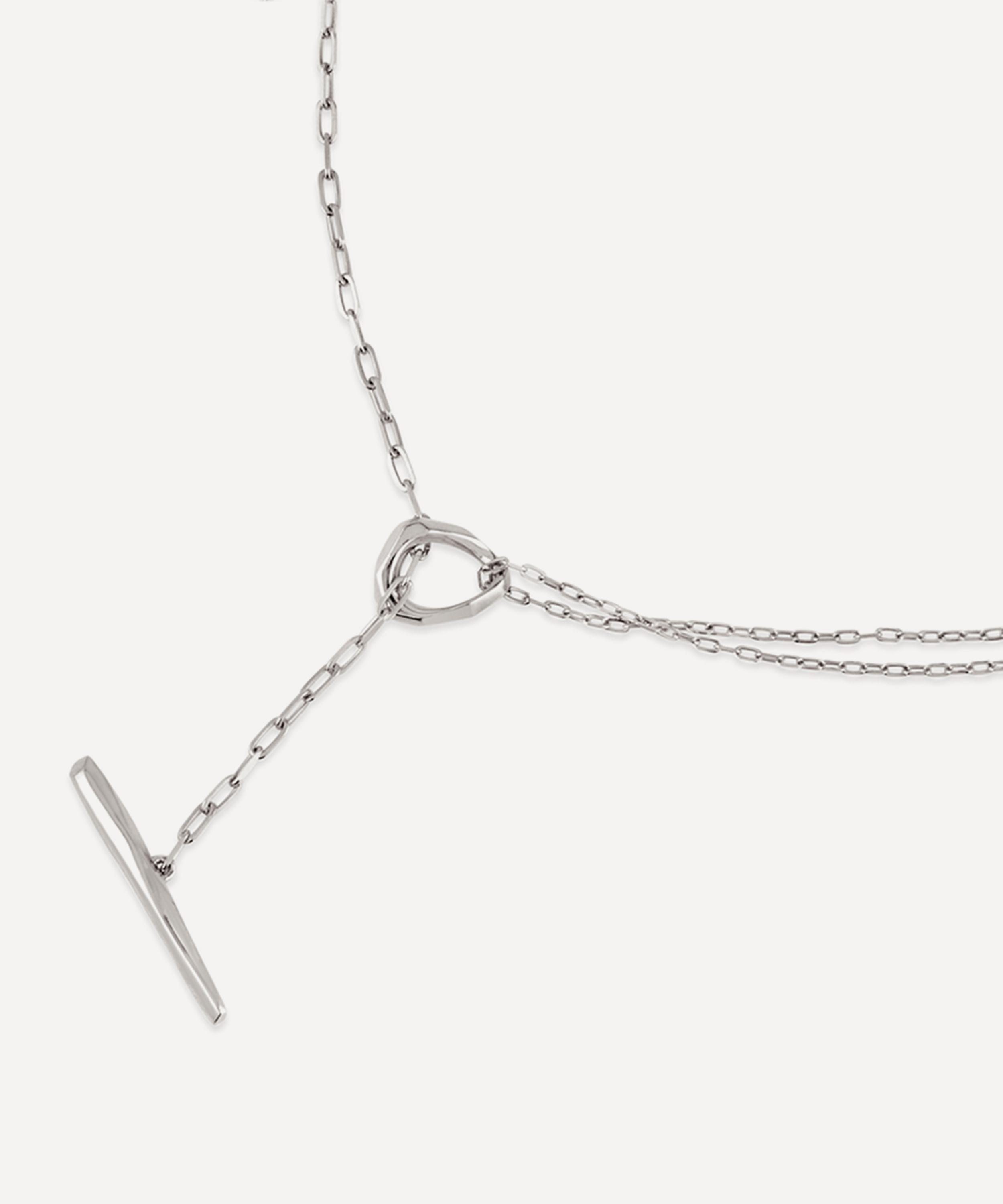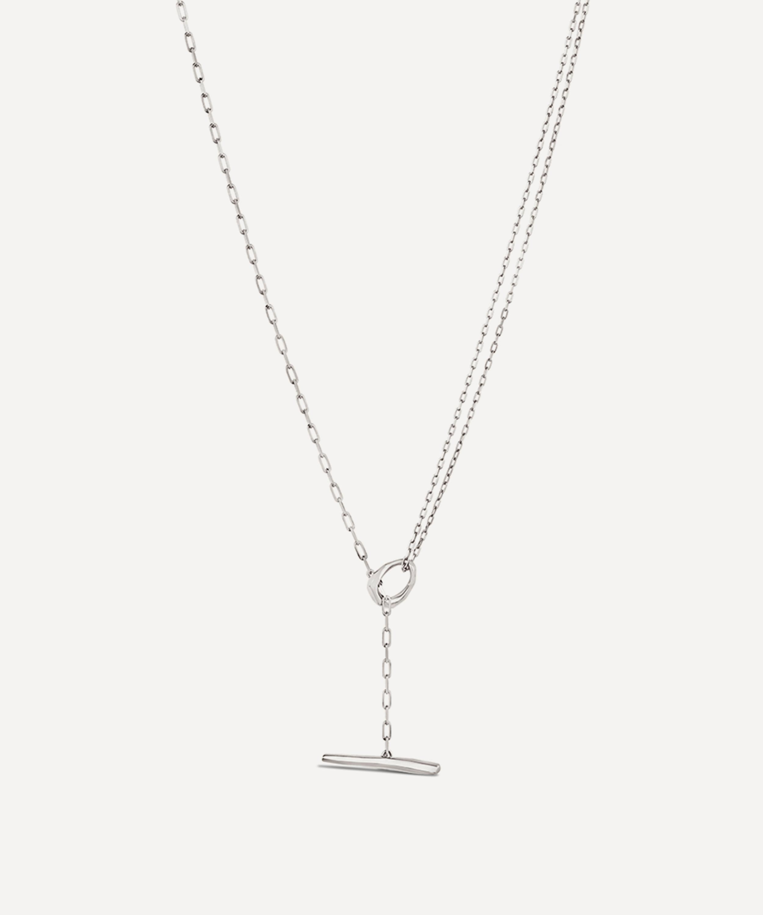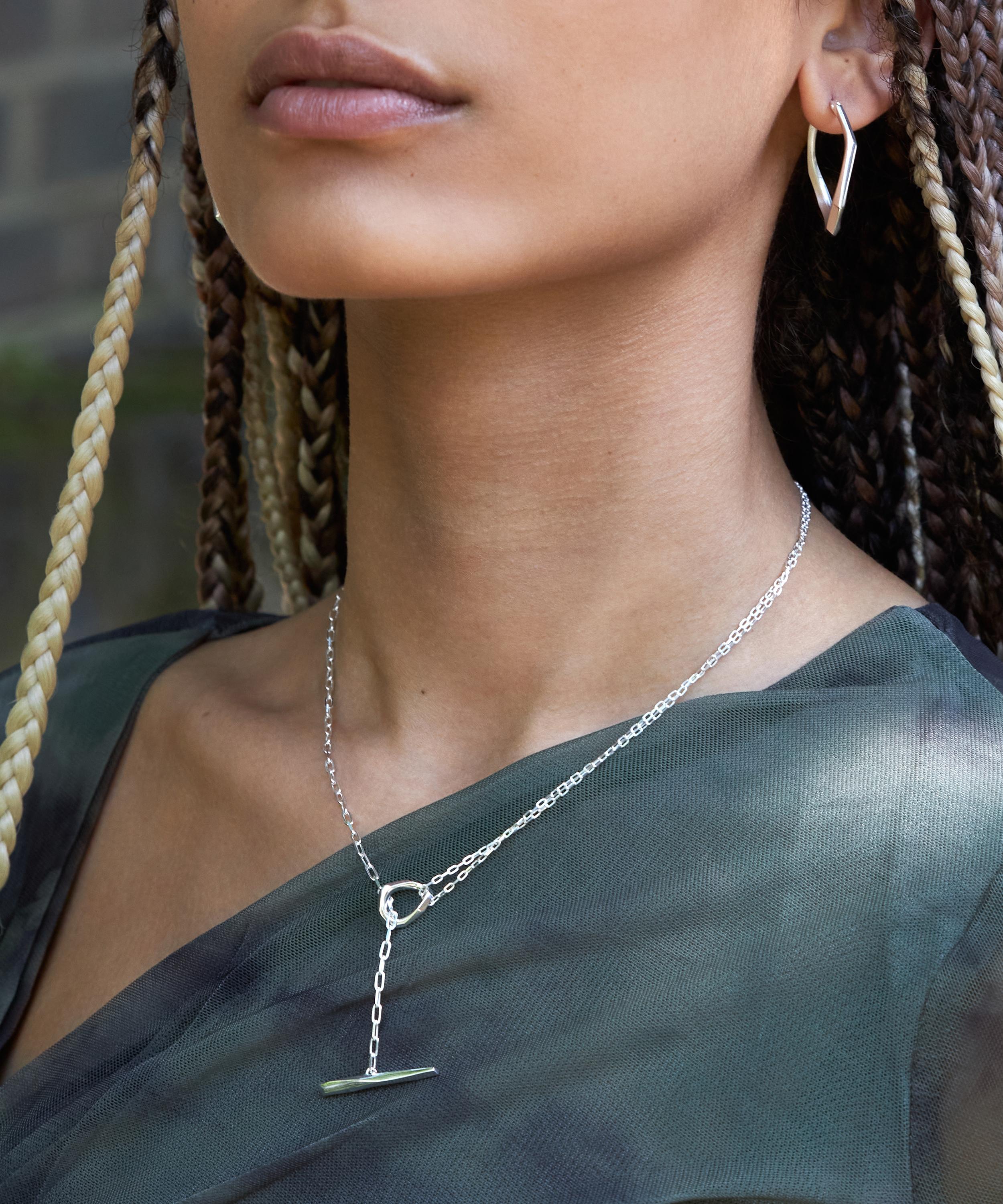 Crafted from recycled sterling silver, this lariat necklace features a reimagined take on a classic T-bar necklace with a double row of hammered trace chains and a faceted link that threads through the chain. Complete in a polished and light refracting finish, it makes for a mini statement piece perfect for everyday styling. Wear it alone, or layer it with additional chains for a trend-led finish.