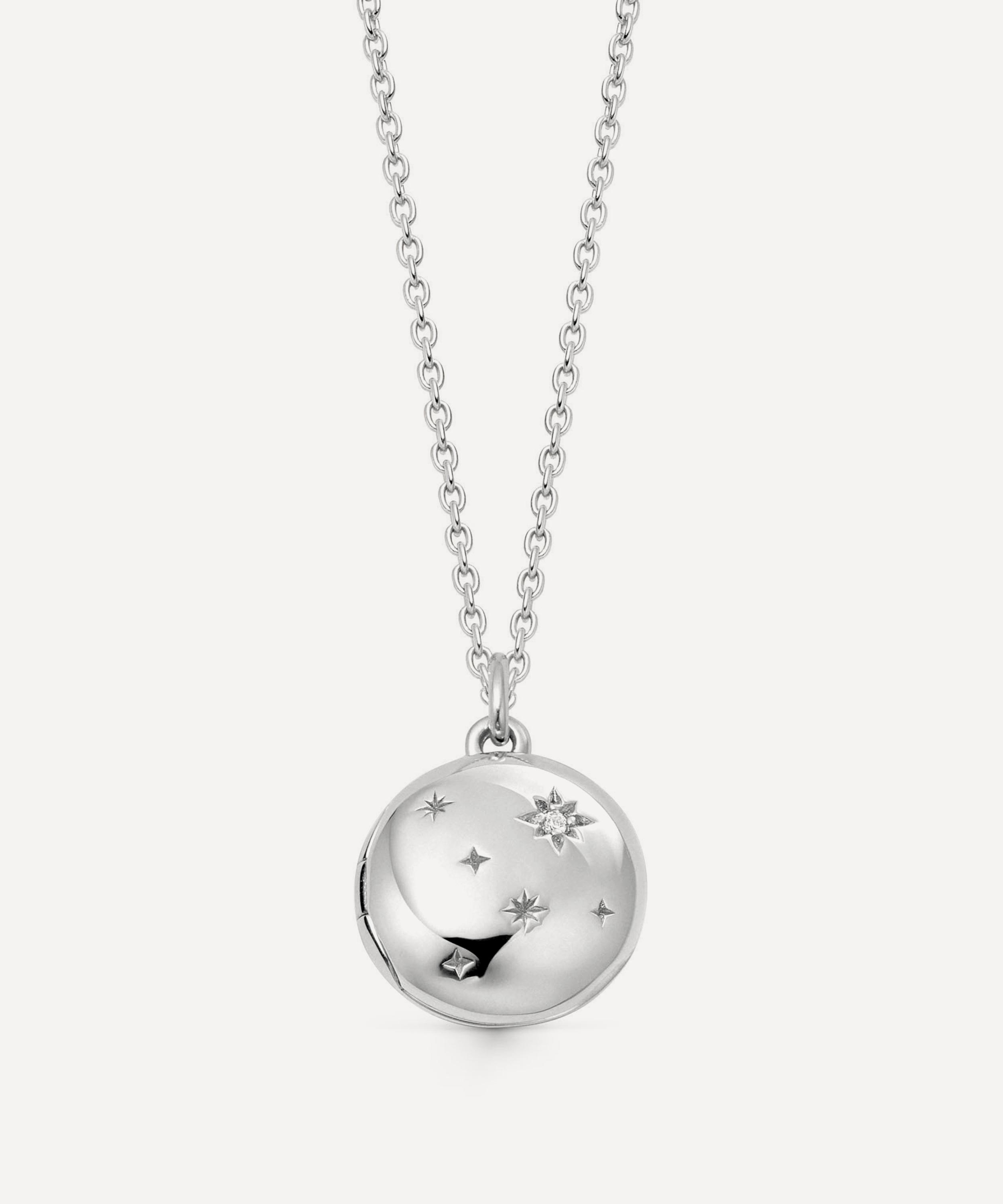 Crafted from sterling silver, it features a fine trace chain and round locket, beautifully embellished with engraved stars and a single white sapphire. The locket opens to reveal two 8mm slots, offering the option to add two special photographs. Boasting a meaningful piece that you can treasure for years to come, or gift to a loved one, it can be styled as solo piece or layered with classic chains and additional pendant necklaces to build a curated stack.