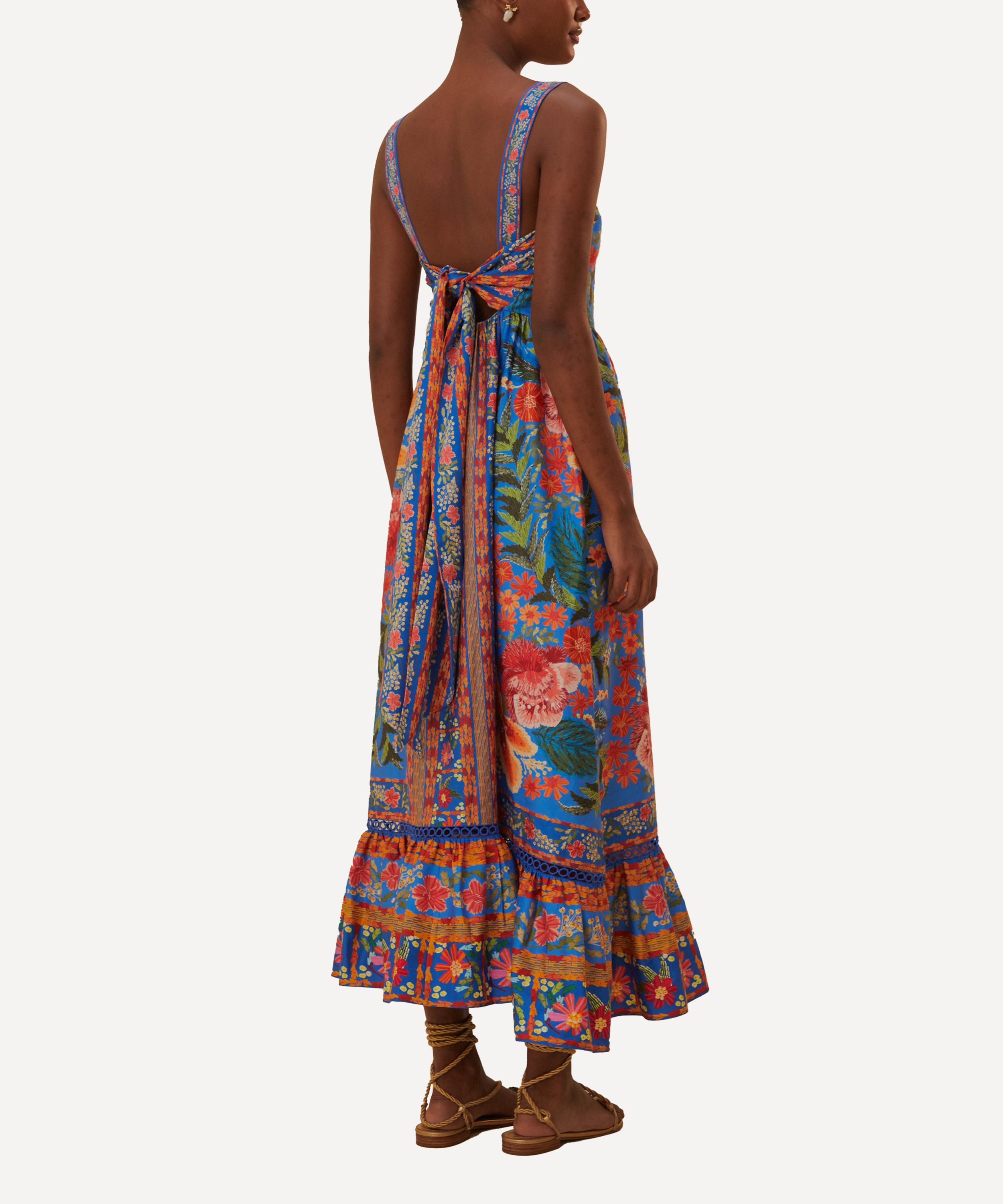Adorned all-over in the bold and blooming Stitched Garden print, this cotton maxi-dress is the ultimate summer piece with its sleeveless design, and open back. Complete with a flattering square neckline, its tiered hem is intricately embellished with insertion lace.