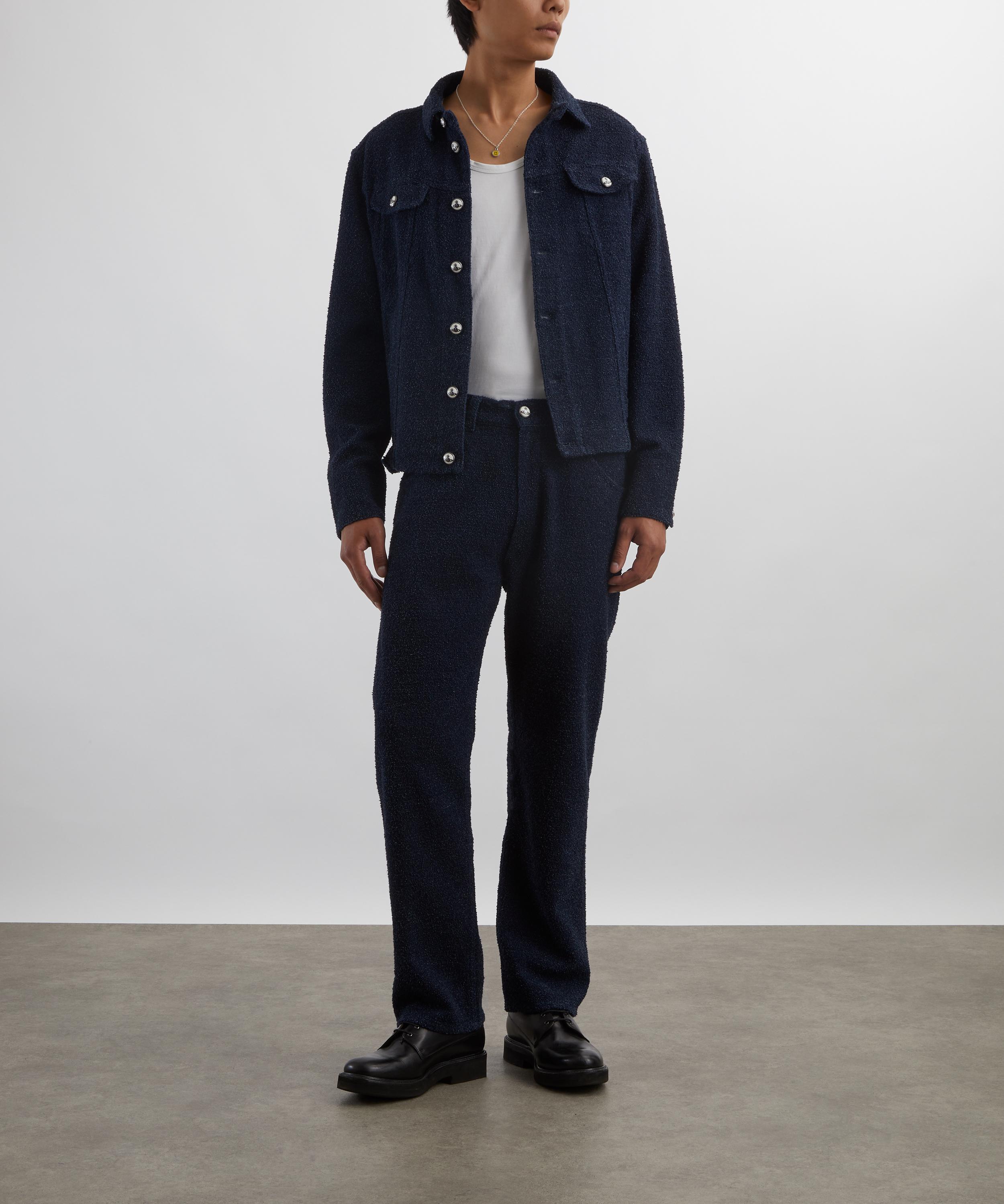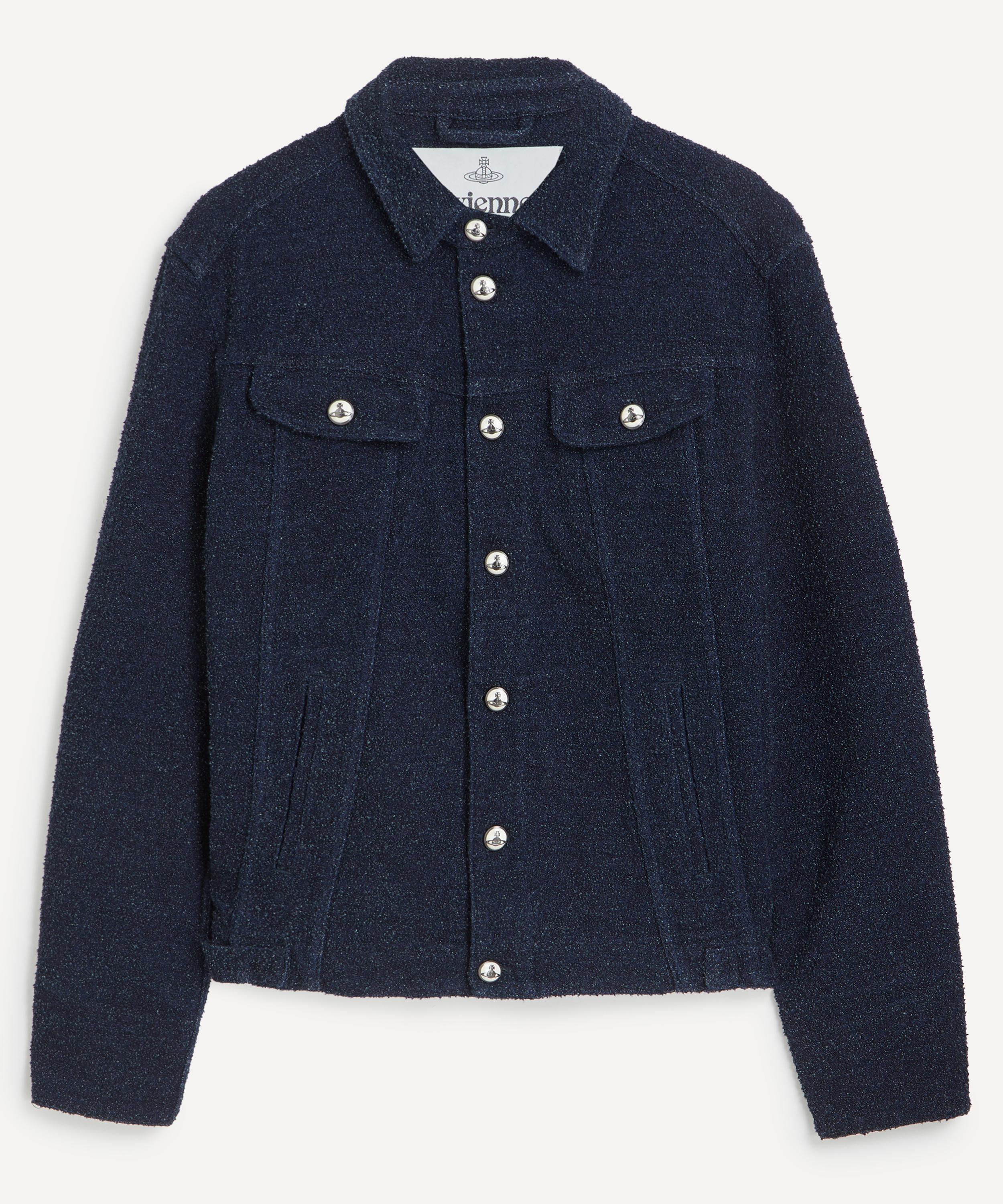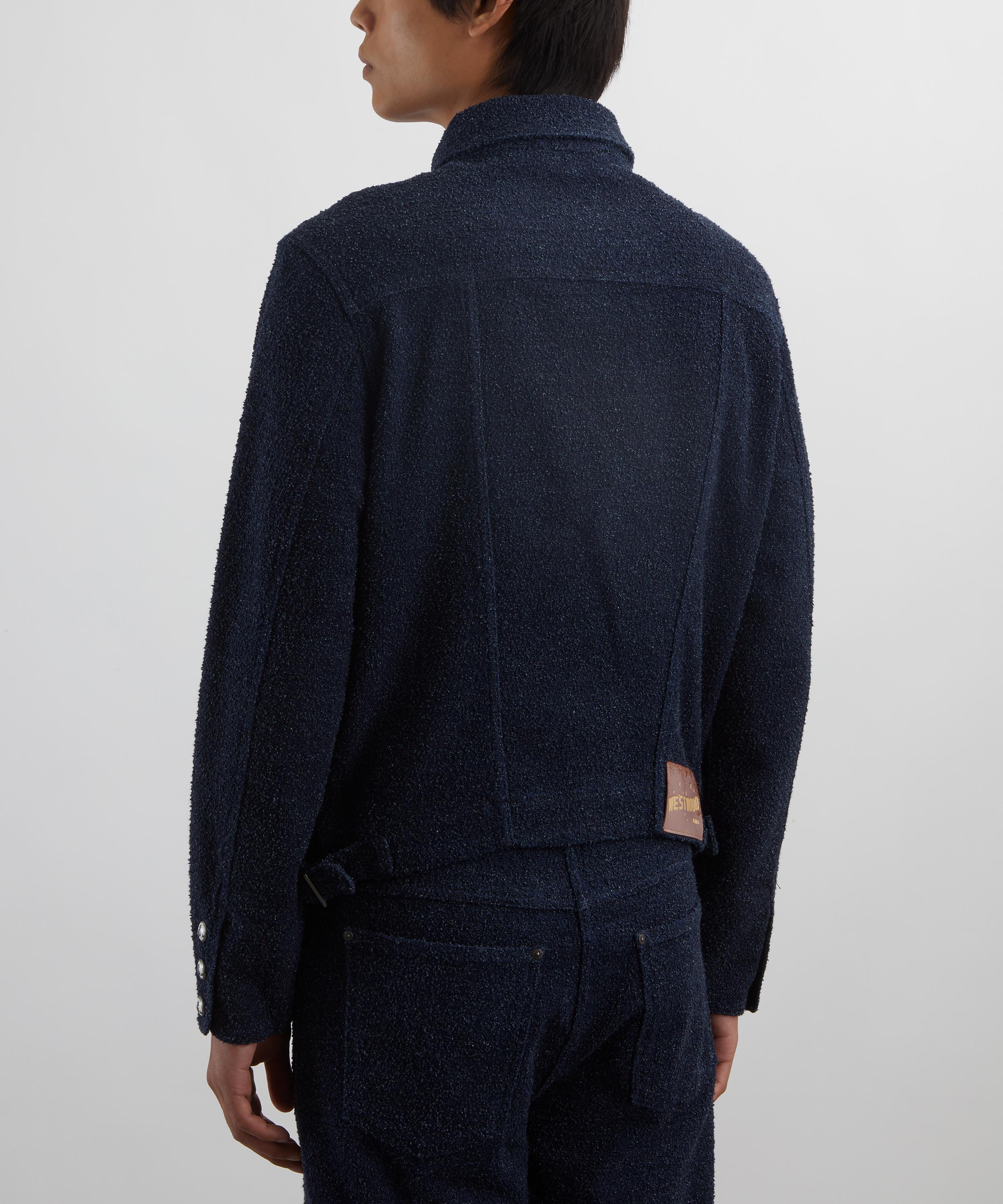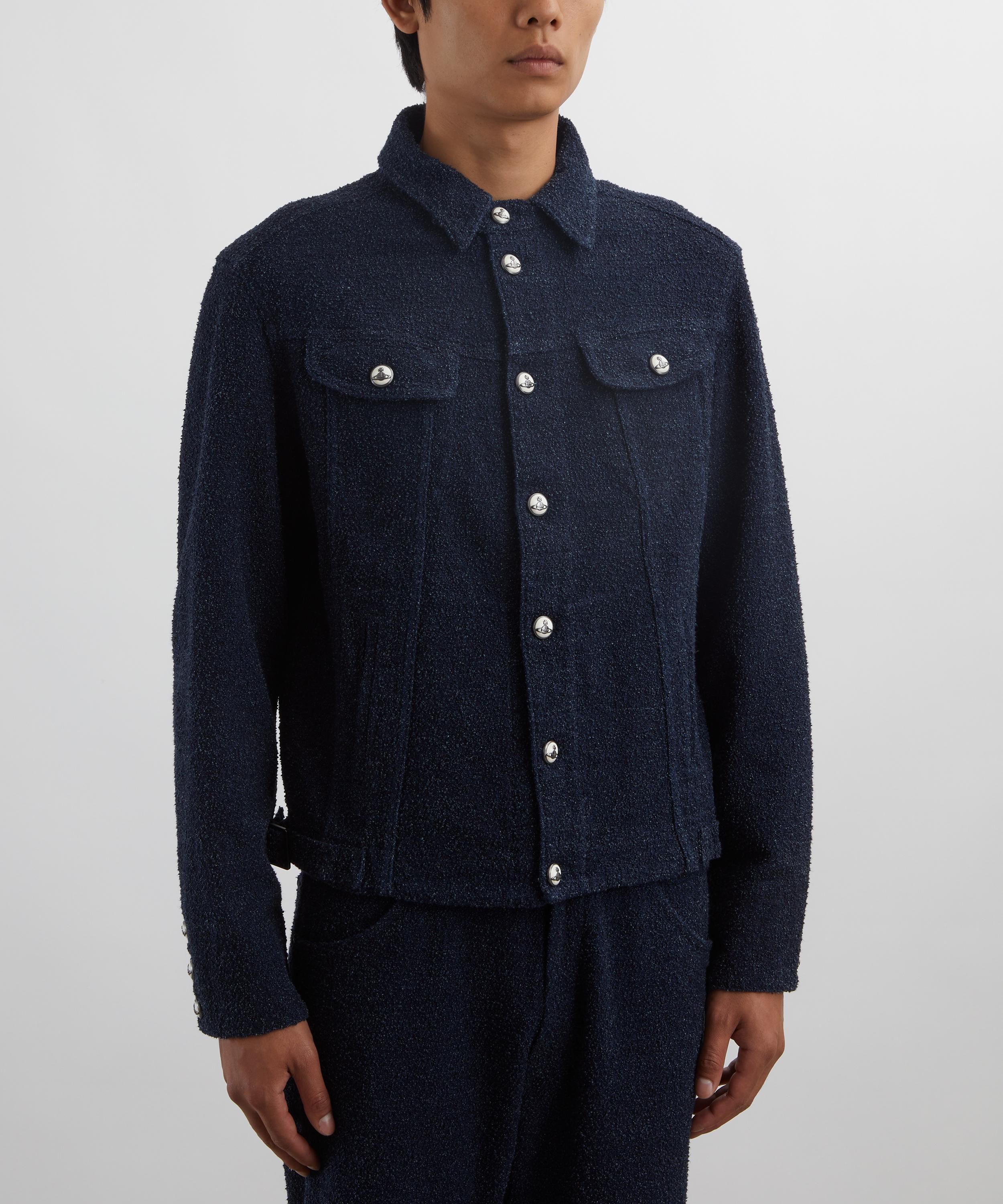 Crafted from a tactile bouclé fabric, the Stormrider jacket reimagines classic denim styling with a point collar, chest flap pockets, and a buttoned front, finished with branded silver buttons for a distinctive touch.