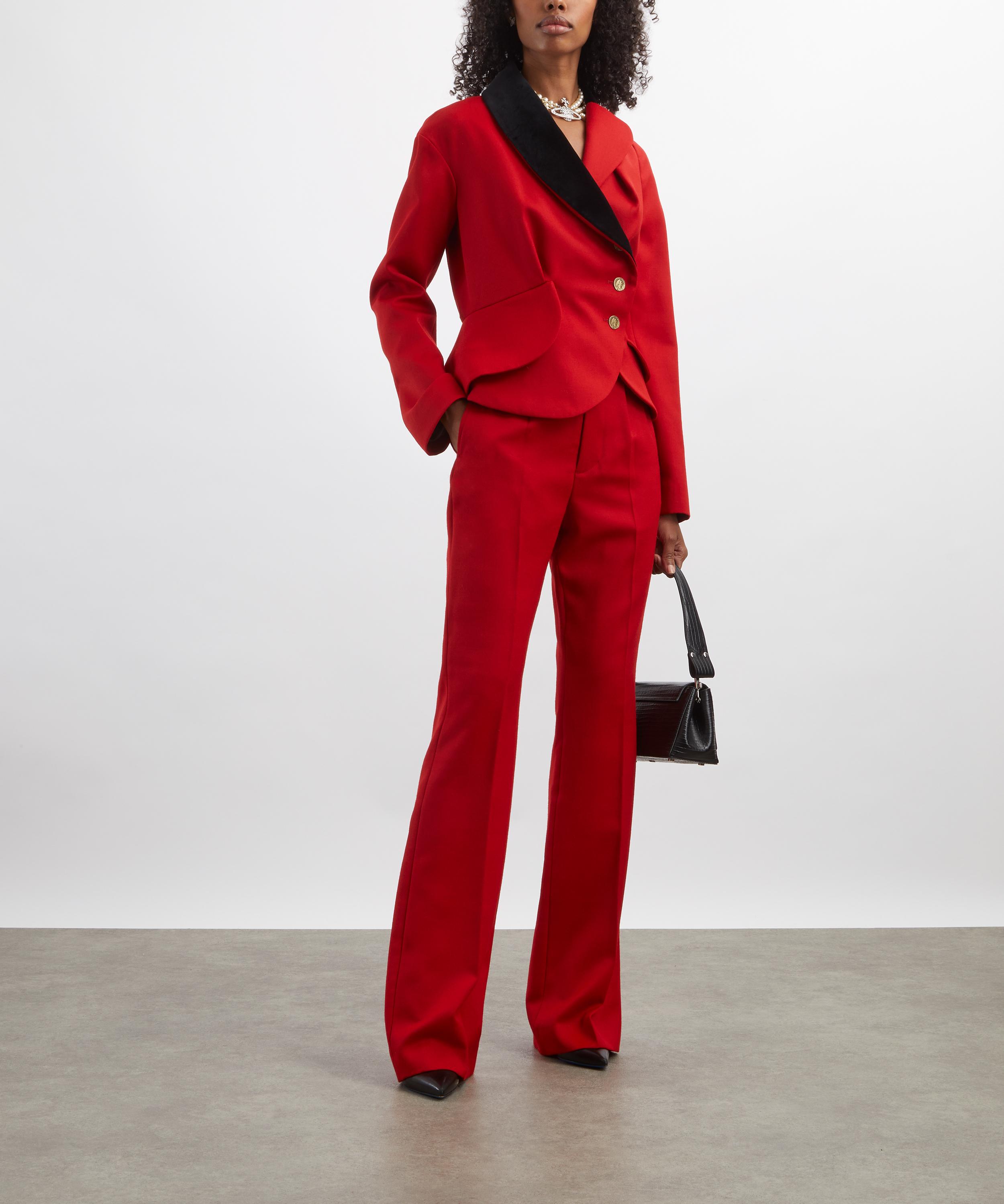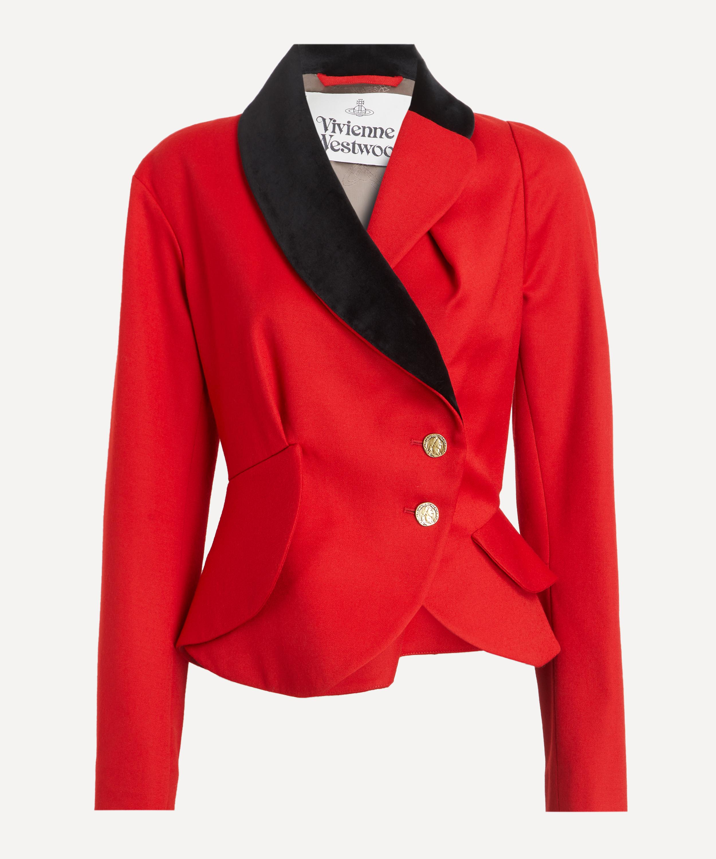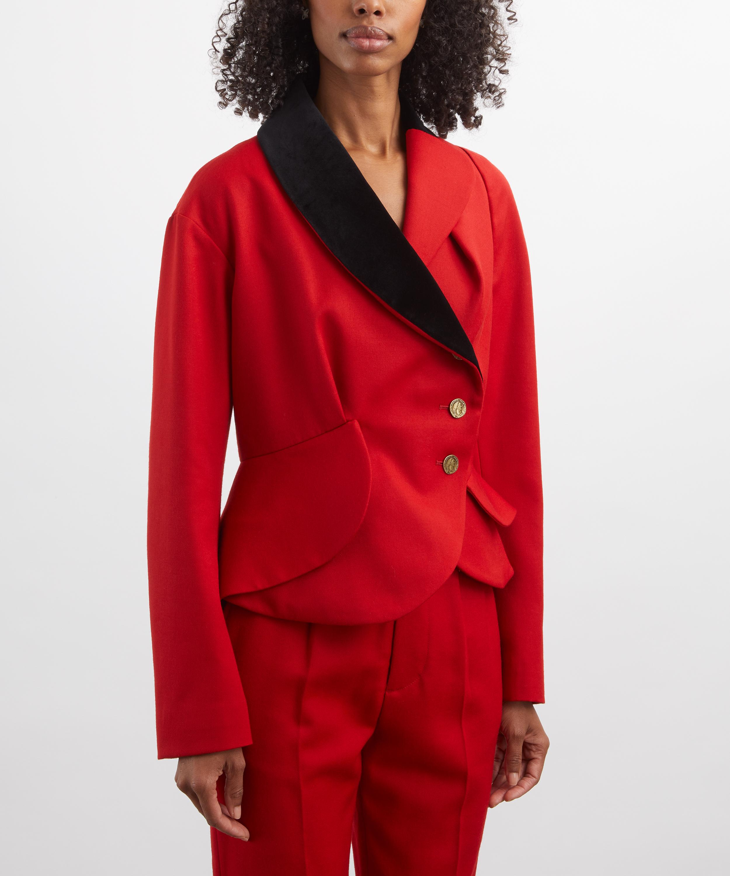Crafted from wool, this bold red jacket features a contrasting black shawl collar, asymmetric front closure with two-tone gold-embossed buttons, and a cinched waist that flares into a sculpted peplum hem.
