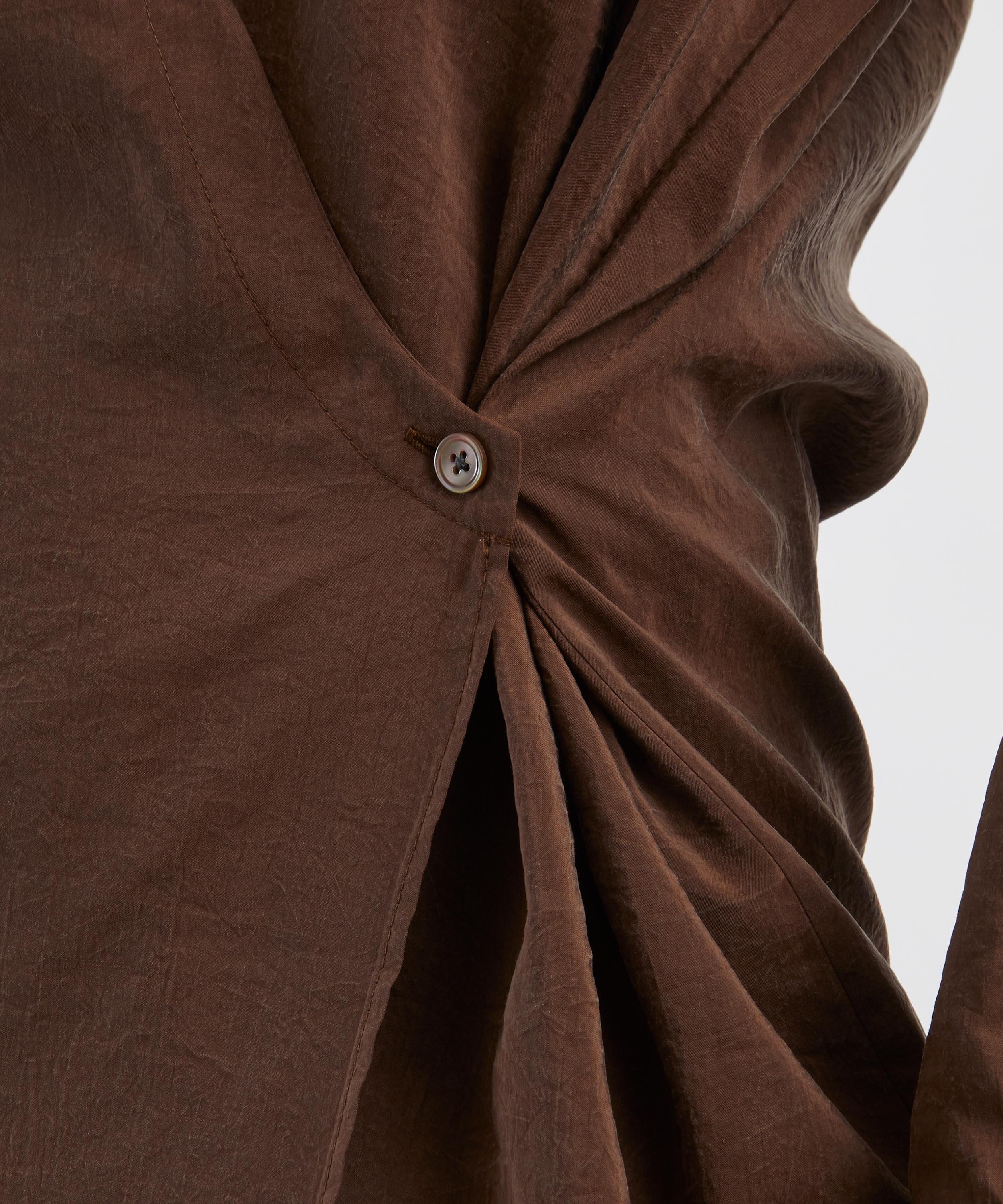Expertly crafted from a dry silk blend with a subtly crinkled texture, this shirt dress showcases an oversized, twisted silhouette with dropped shoulders, long sleeves, and an asymmetrical button closure.