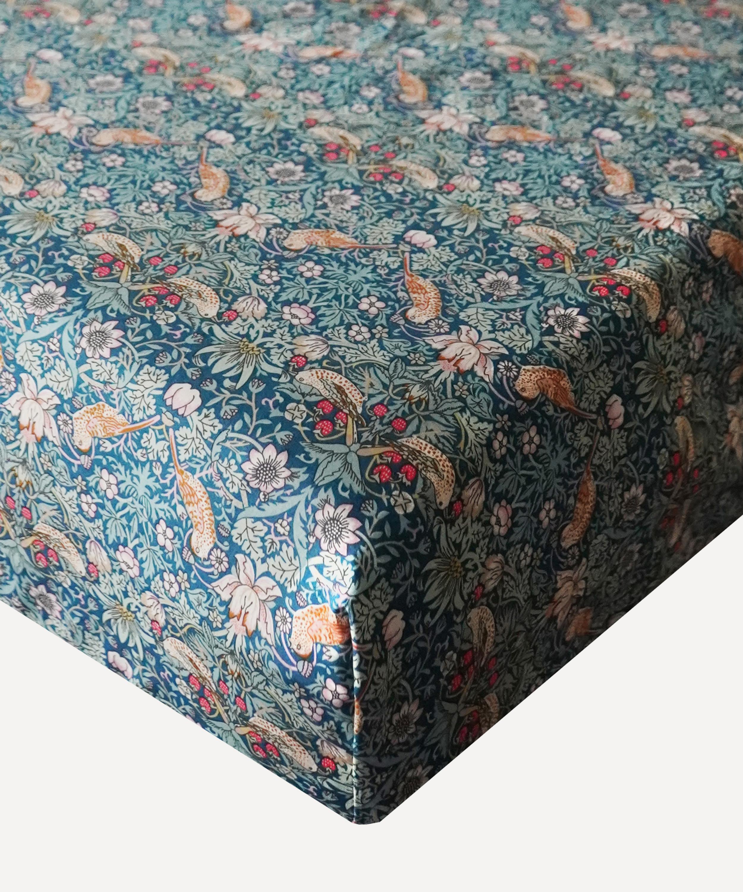 Liberty’s Strawberry Thief fitted sheet is expertly crafted from our inimitable Tana Lawn™ cotton. Cool, lightweight, and durable, with a silk-like softness and unmatched print quality, Tana is made from ultra-fine cotton in a dense percale weave using a bespoke production process that has evolved over a century. Strawberry Thief – first printed by William Morris in 1883 and introduced as a furnishing fabric for Liberty in 1979 – charmingly depicts birds stealing fruit within Morris’ Oxfordshire garden. Use this sheet to lay the foundation for a print-loaded bedding set-up, or as a vibrant pop of pattern in a subdued sleeping space.