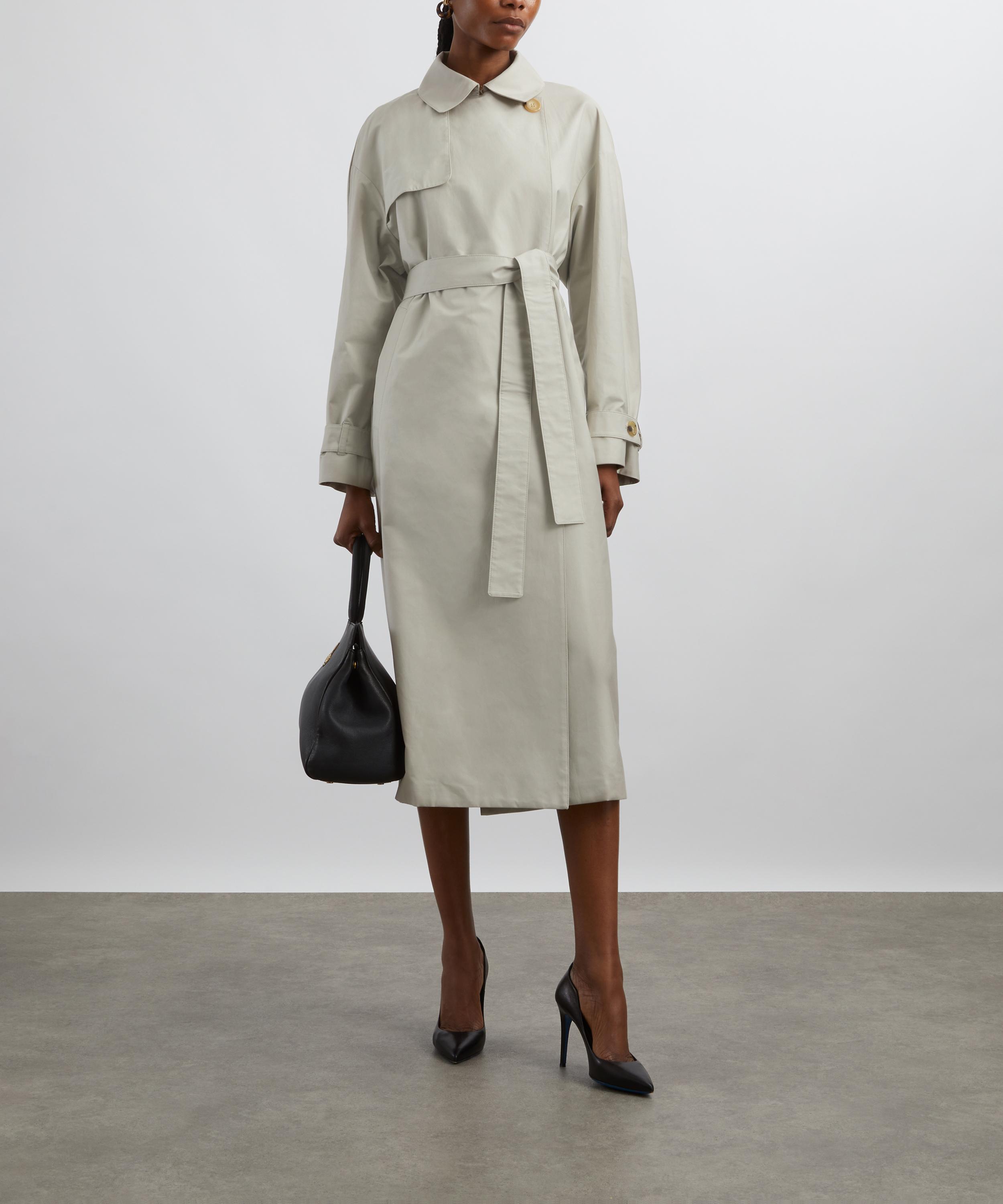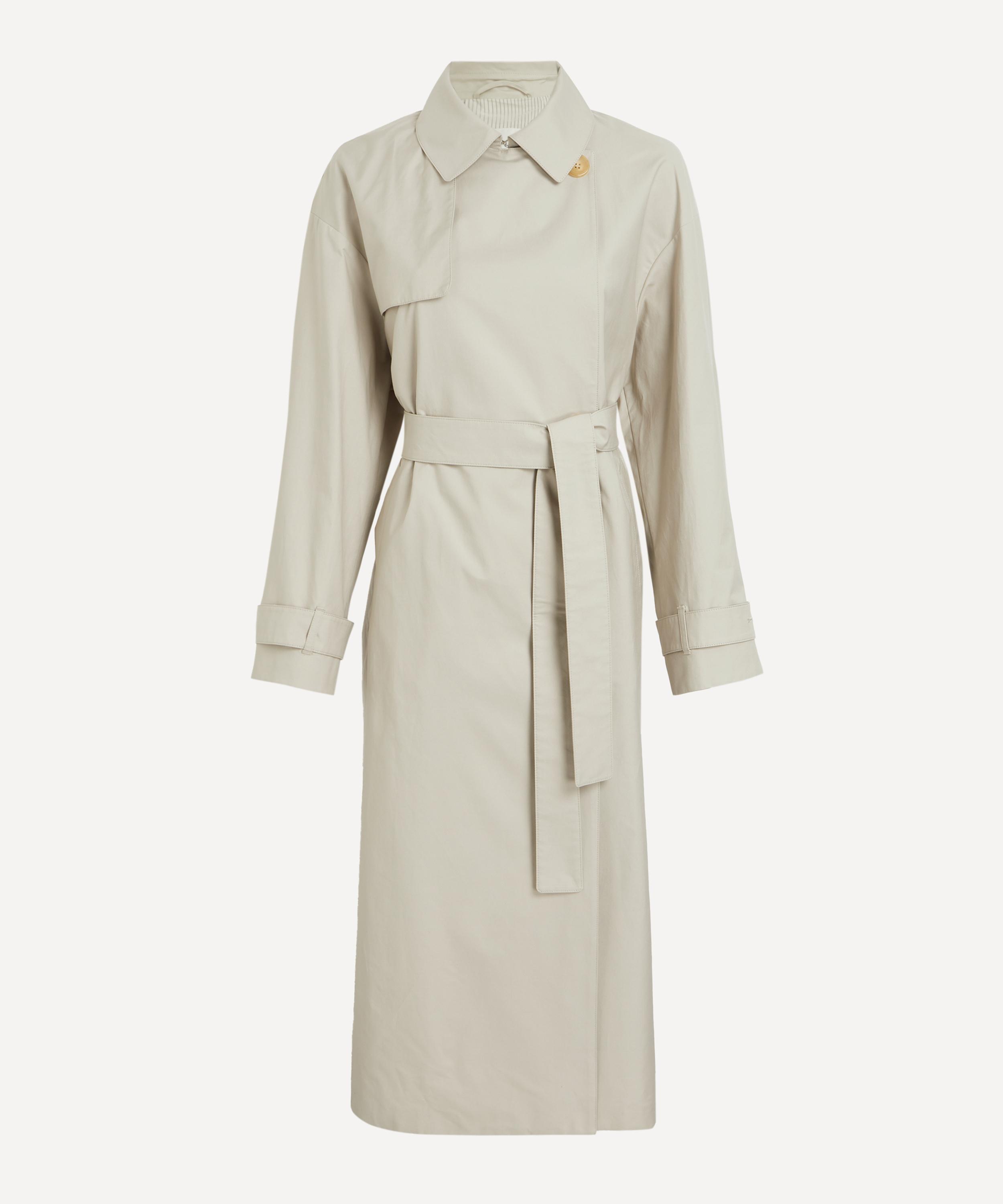 Crafted from a heavy, water-repellent stretch-cotton canvas, this double-breasted raincoat features a front button fastening, and a matching belt to cinch the waist for a flattering fit. Timeless and stylish, iconic details include a lapel collar, storm flap, flap pockets, and cuff tabs, offering a sophisticated, tailored finish.