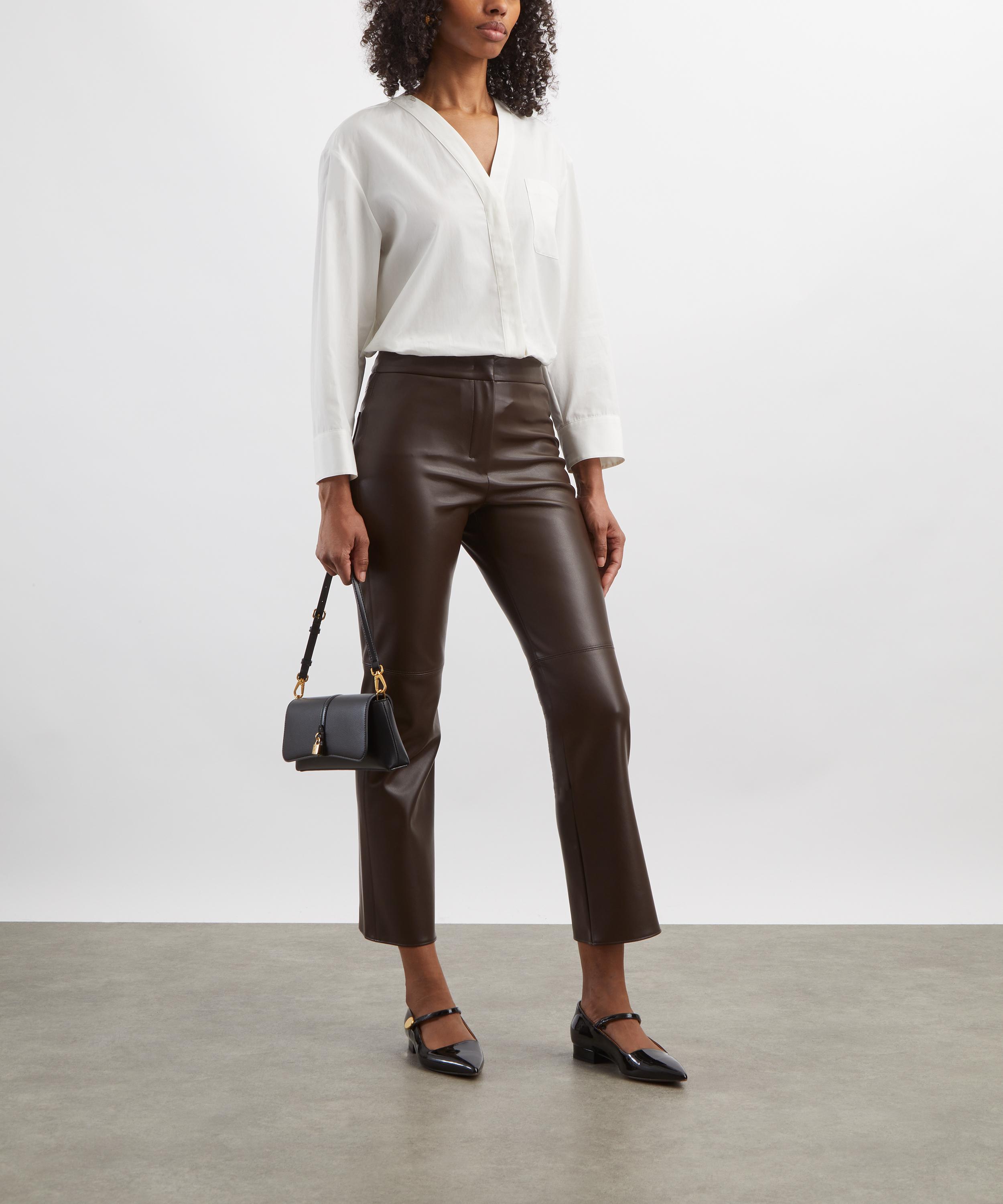 Crafted from a coated, leather-like fabric, these high-waisted trousers are cut to a clean, slim fit with a cropped, slightly flared hem. Leather-goods-inspired darts and precise topstitching elevate the design with a refined, premium finish.