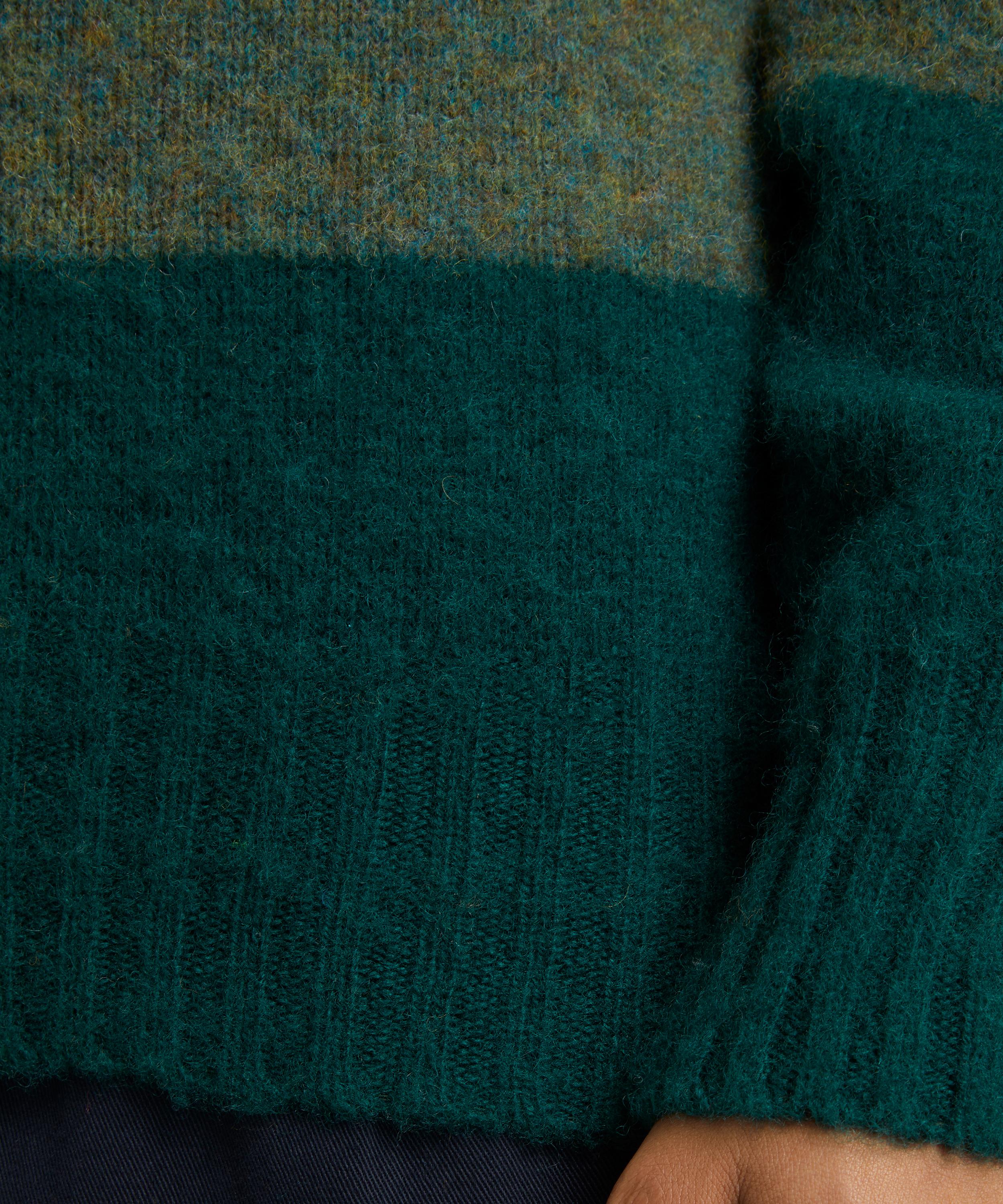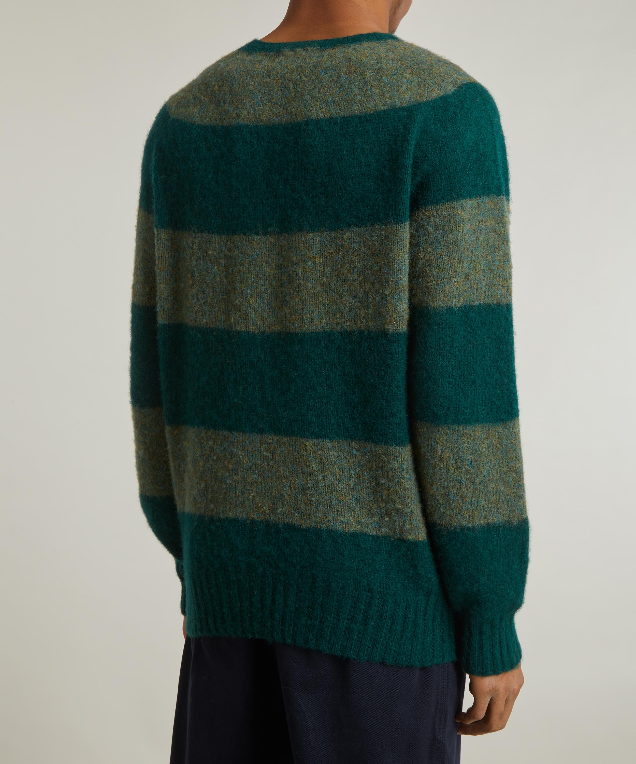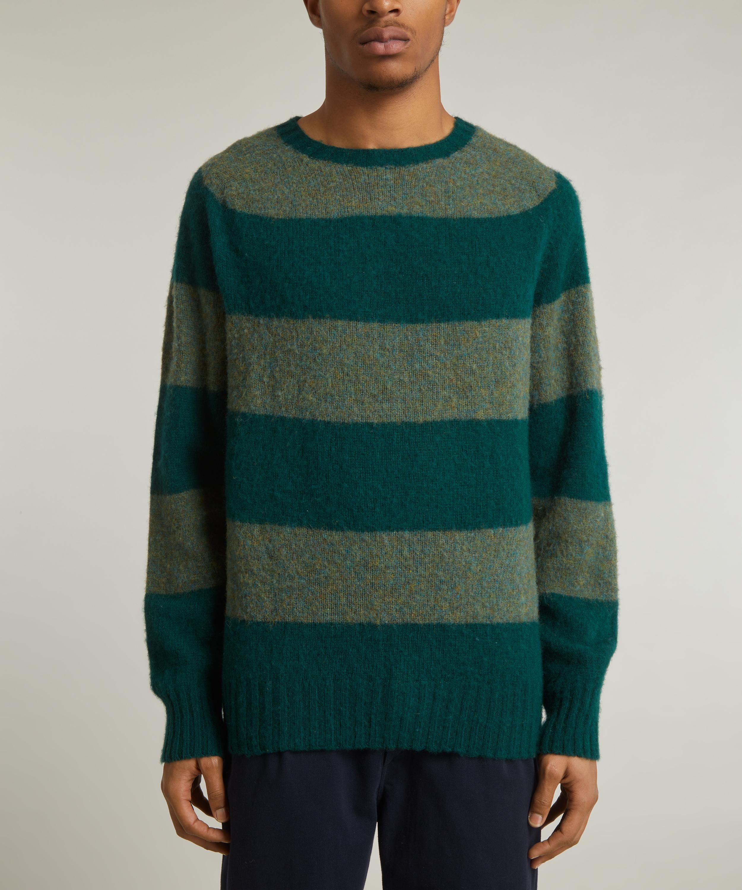 Crafted from lambswool with a tactile brushed finish and a tonal green two-stripe design, this crewneck jumper boasts a relaxed fit with dropped shoulders, slouchy long sleeves and a ribbed collar, cuffs and hem