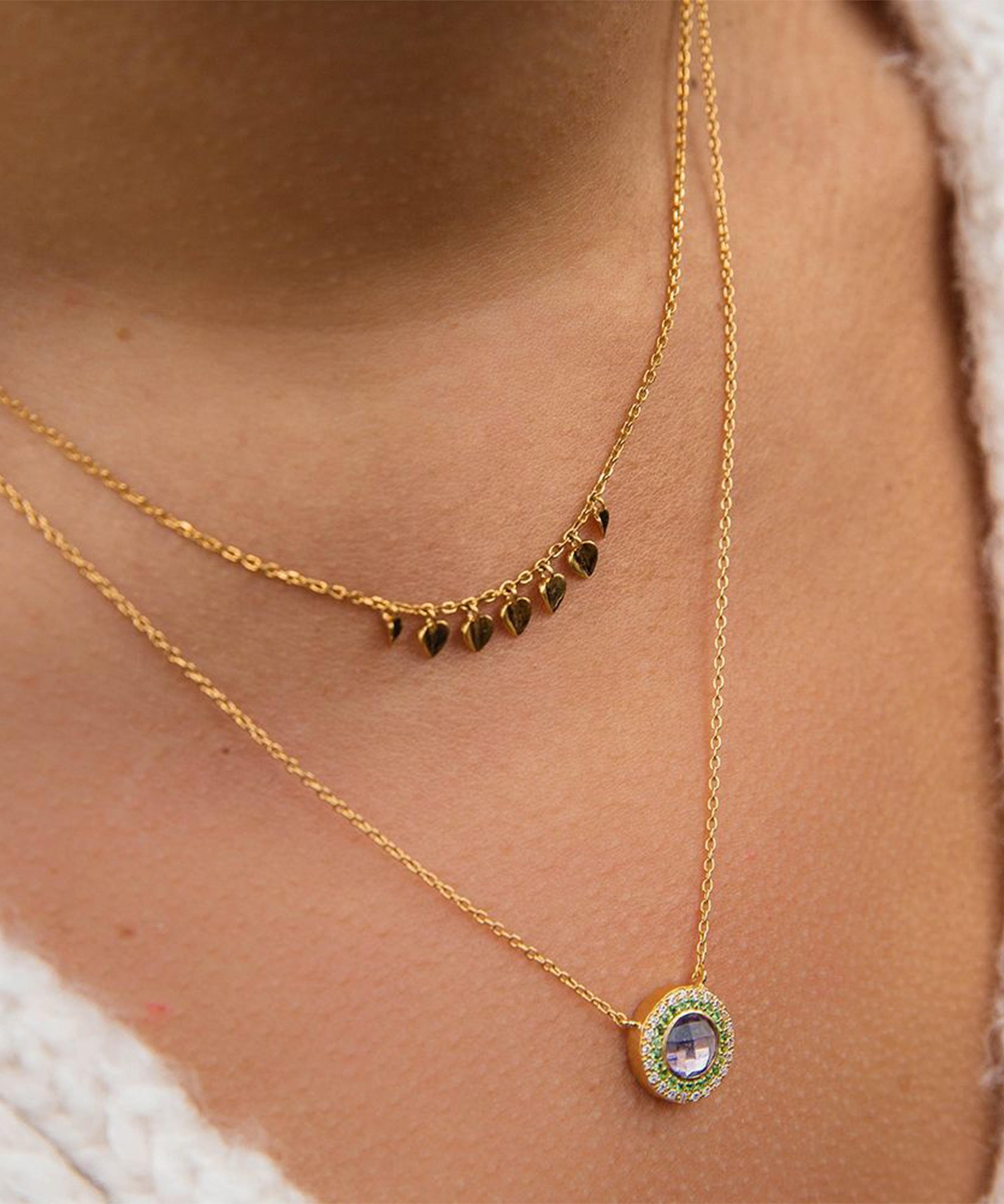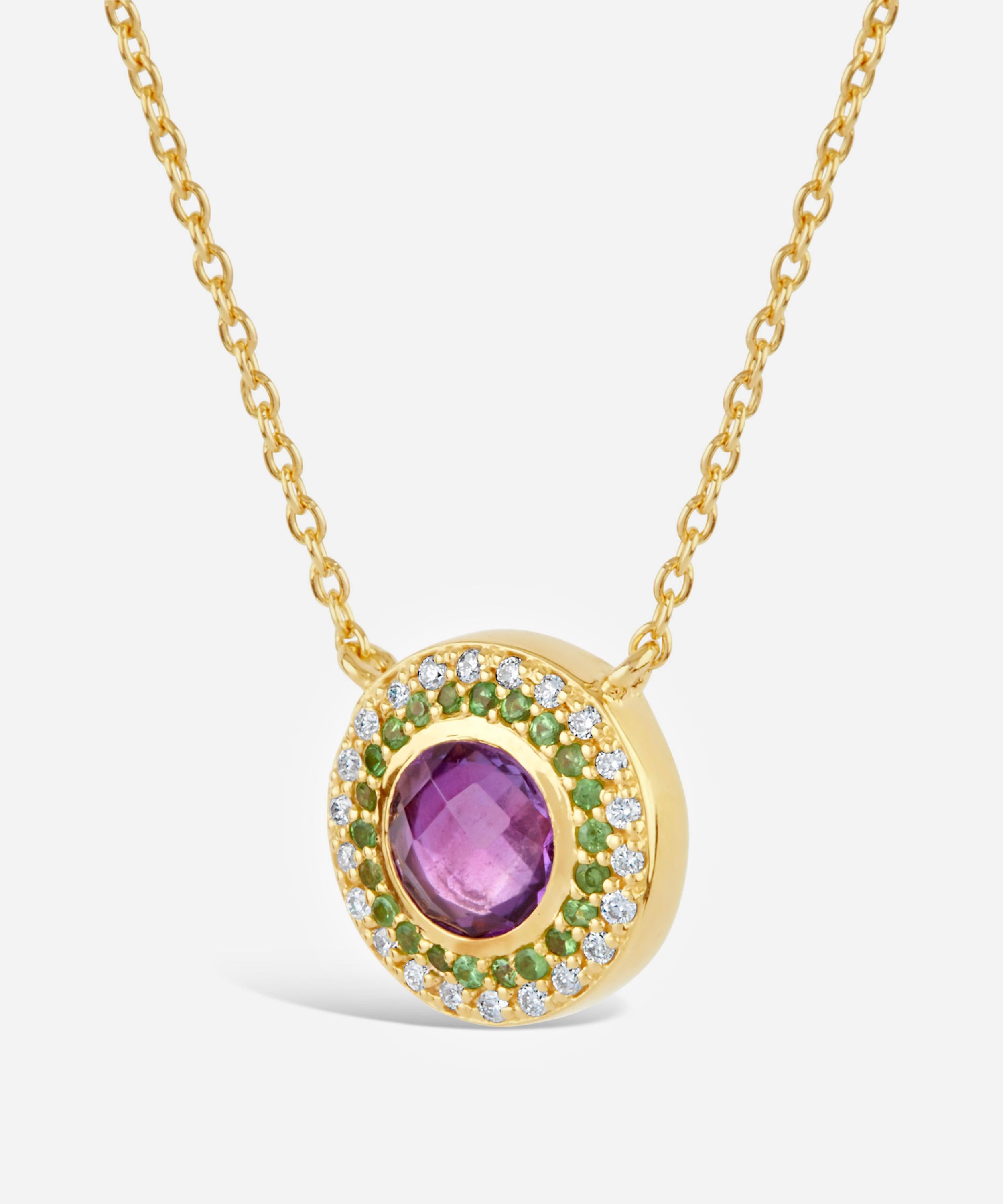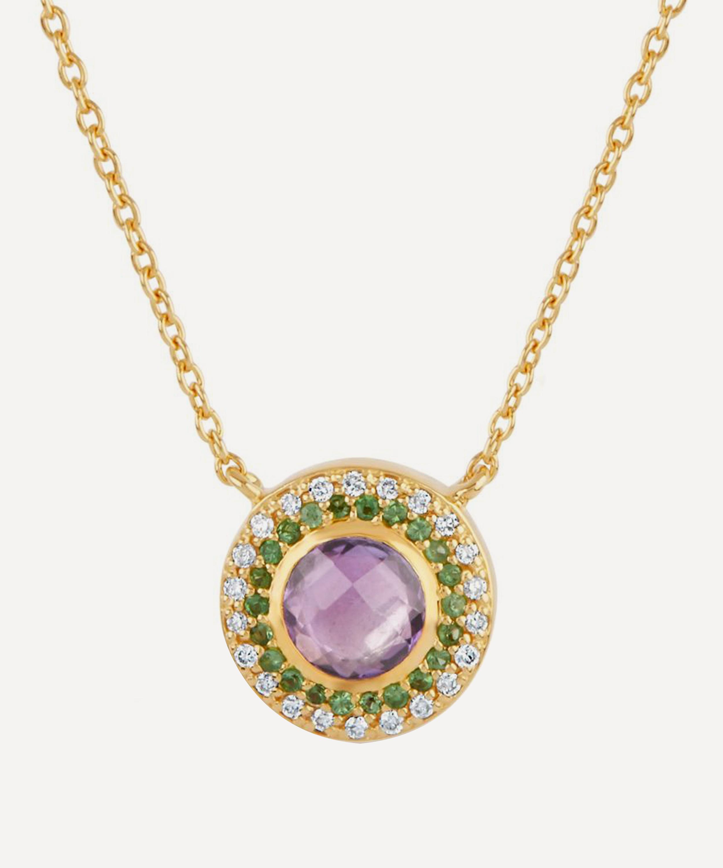 This 22-carat gold pendant necklace from Dinny Hall features a halo setting of rose-cut amethyst and brilliant-cut tsavorite and diamond, designed to celebrate and honour the Suffragette movement.