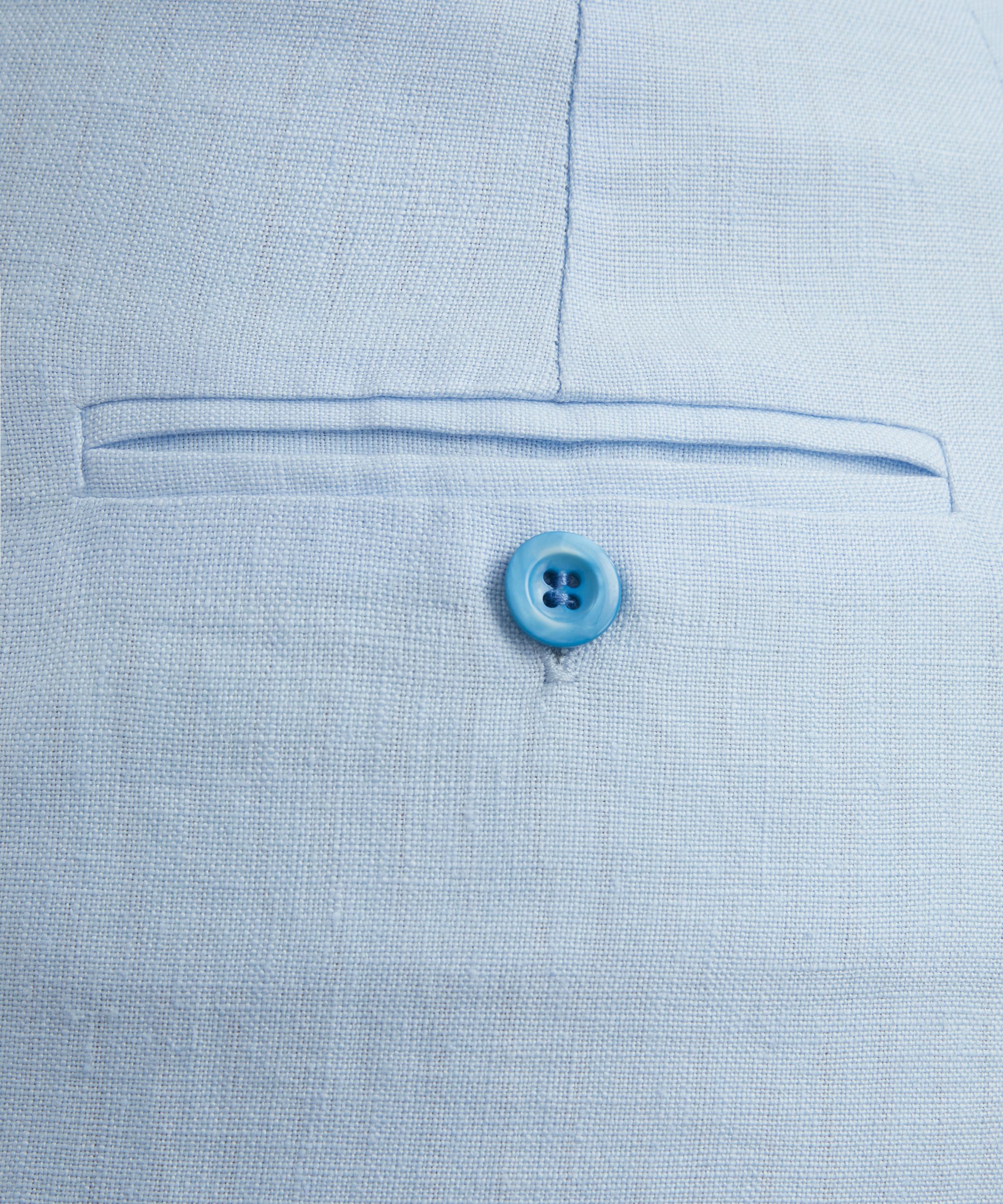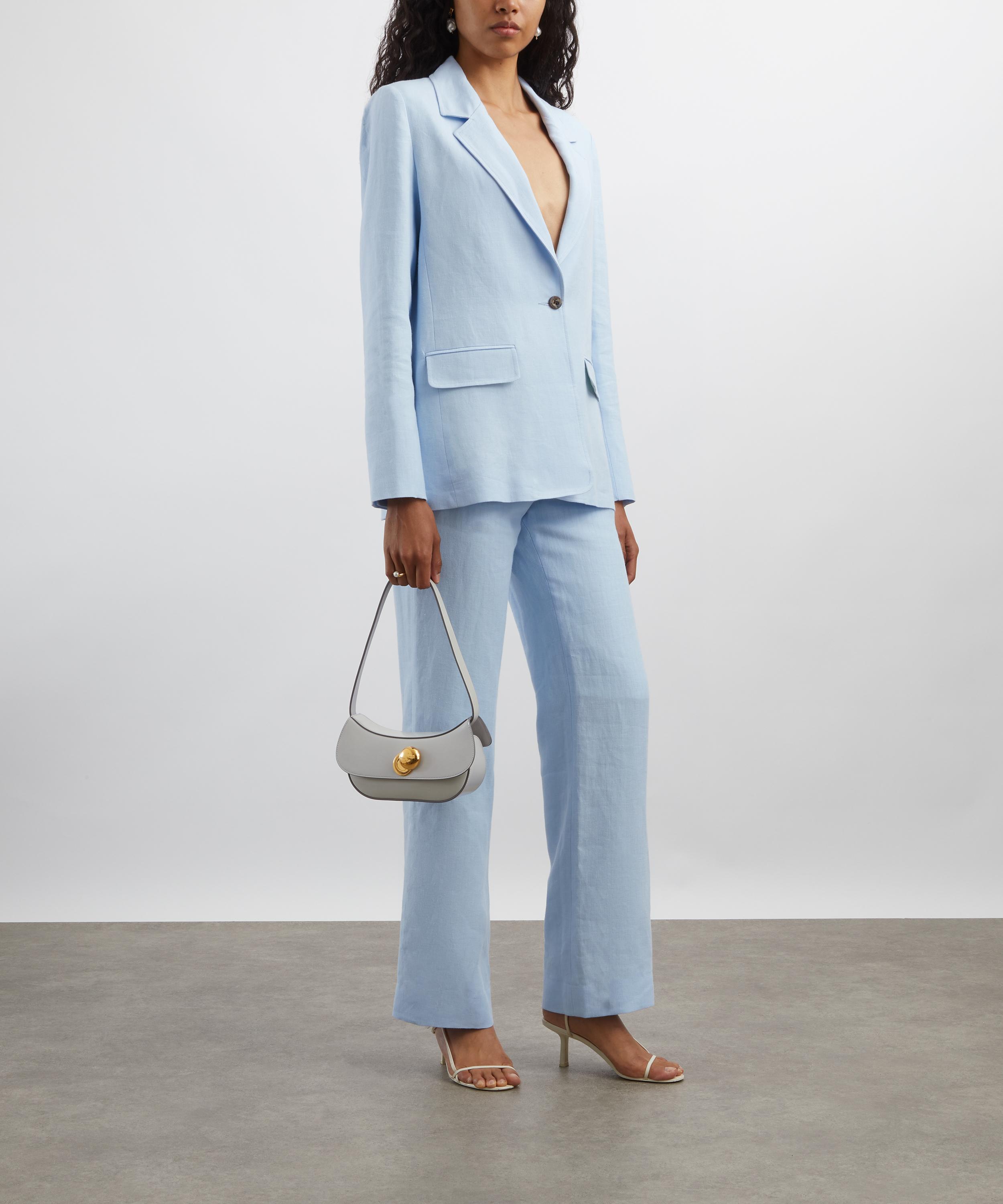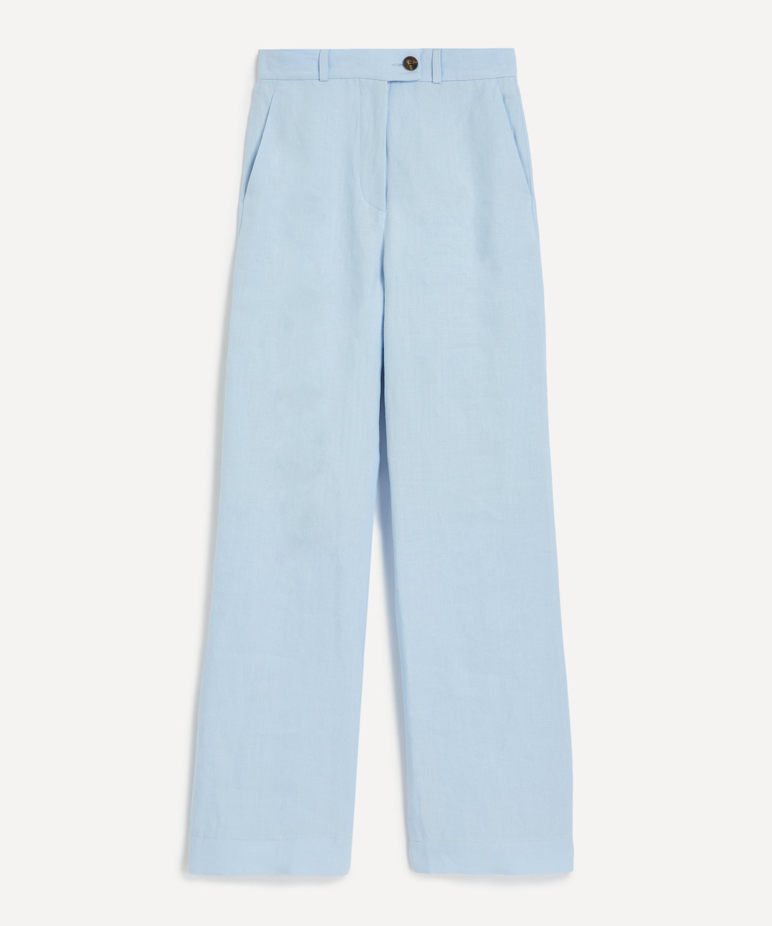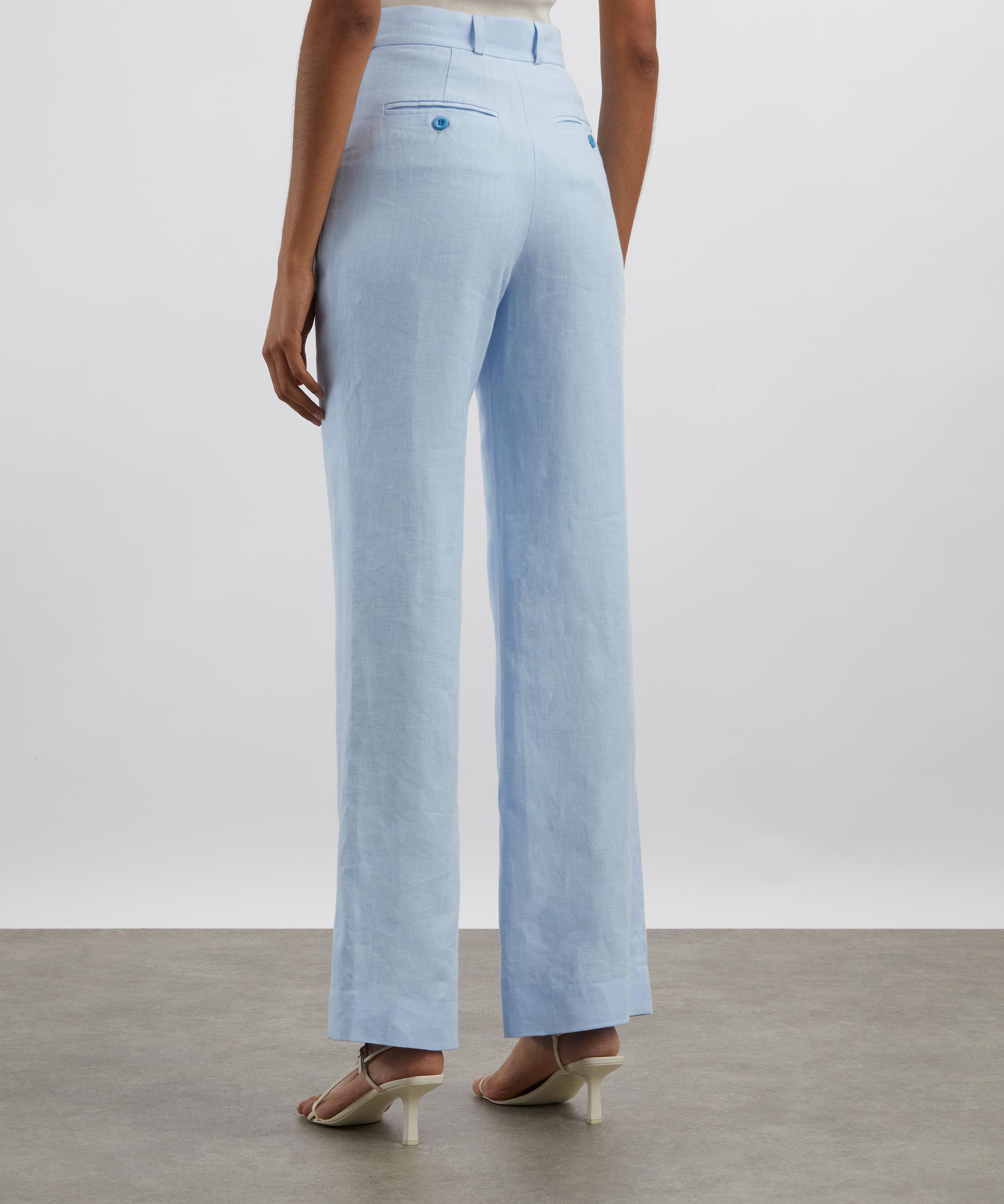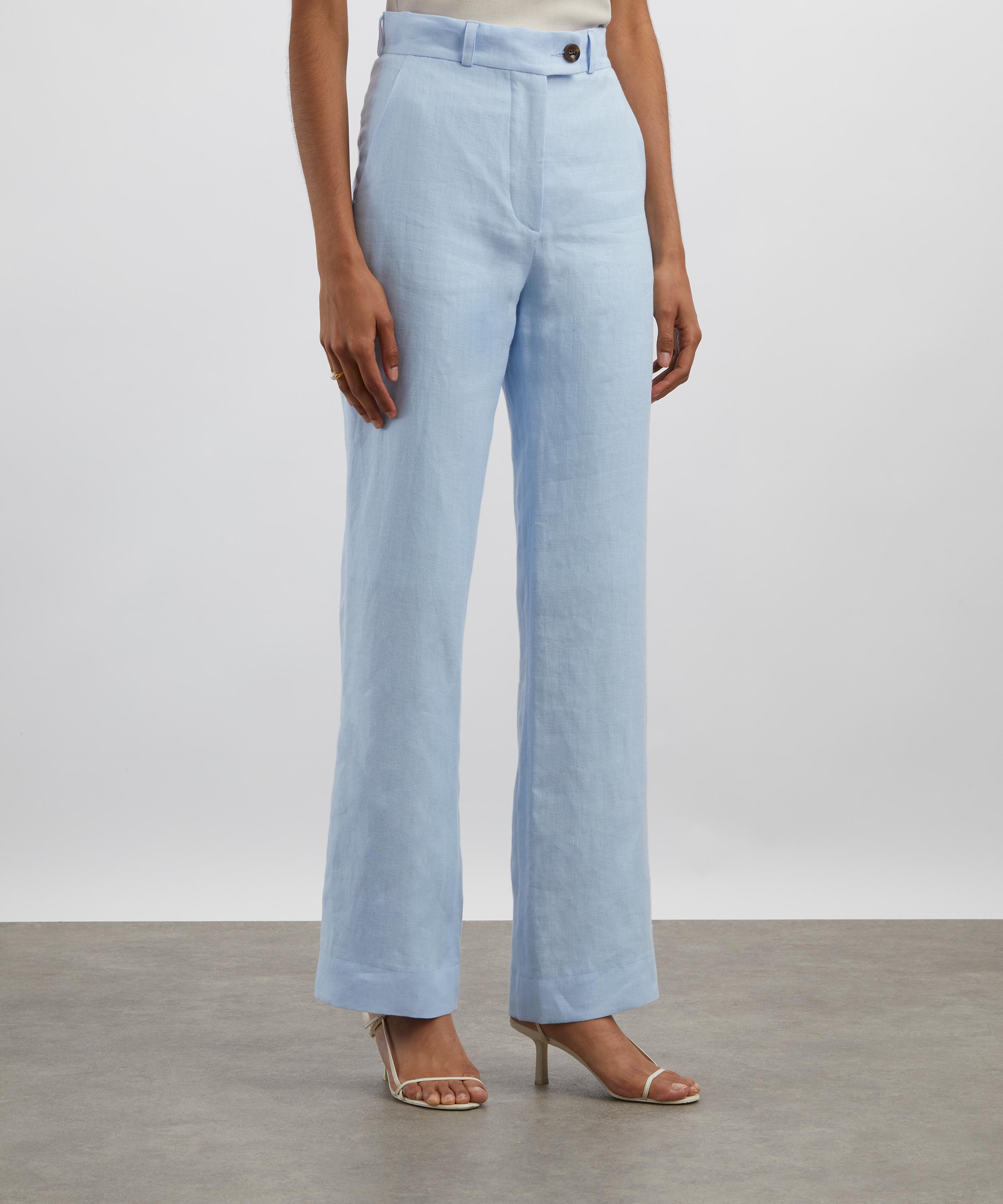Made in London, these high-waisted trousers are crafted from beautiful linen in a light-blue hue. Designed with a wide, straight-leg silhouette, they feature an extended waistband, and multiple side and back pockets. Style them with the matching Sugar Almond Blazer for a perfectly coordinated look.