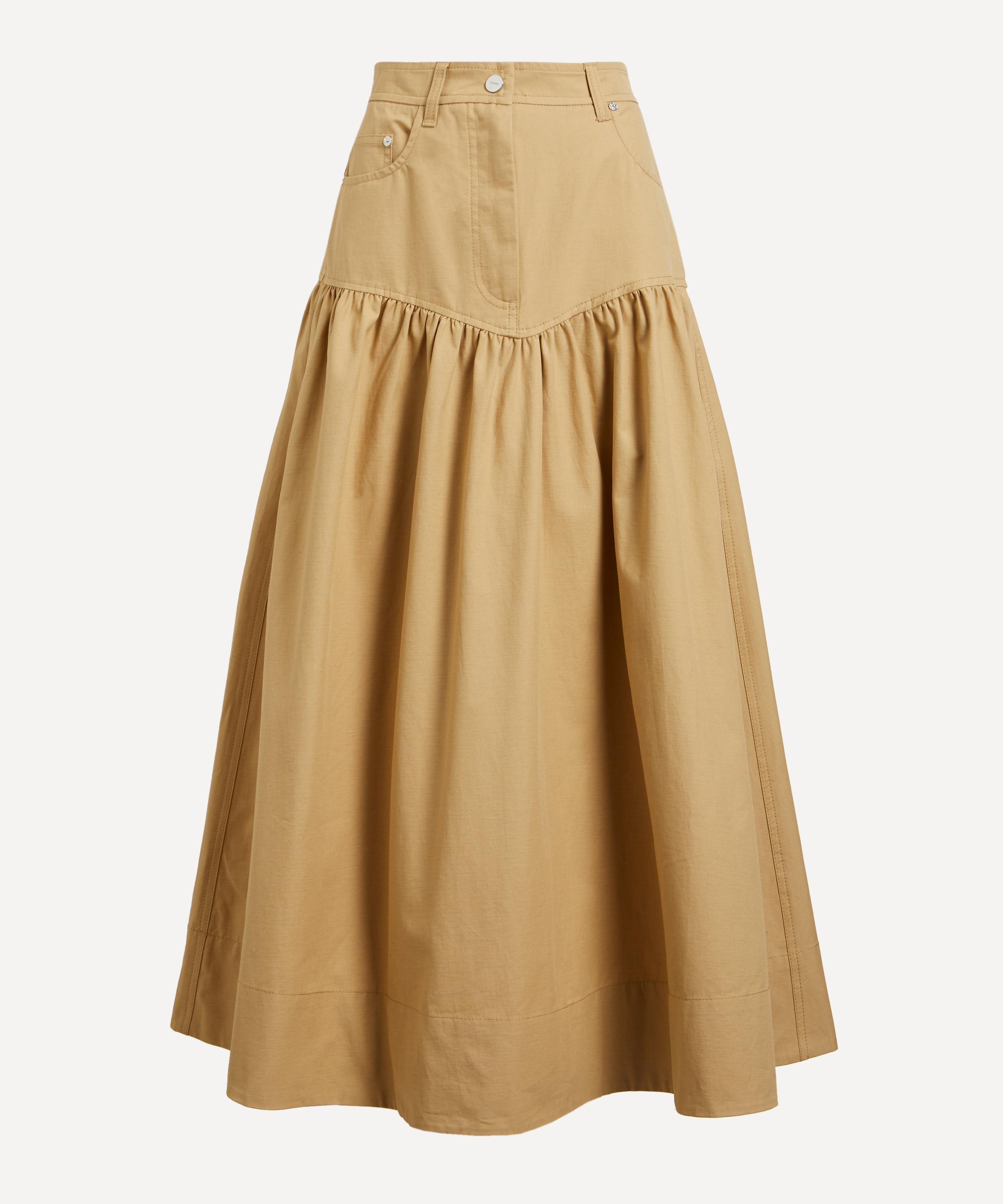 Crafted from a cotton-linen suiting fabric, this long skirt features a flared A-line silhouette with a ruched drop waist that flows gracefully to the ankle.
