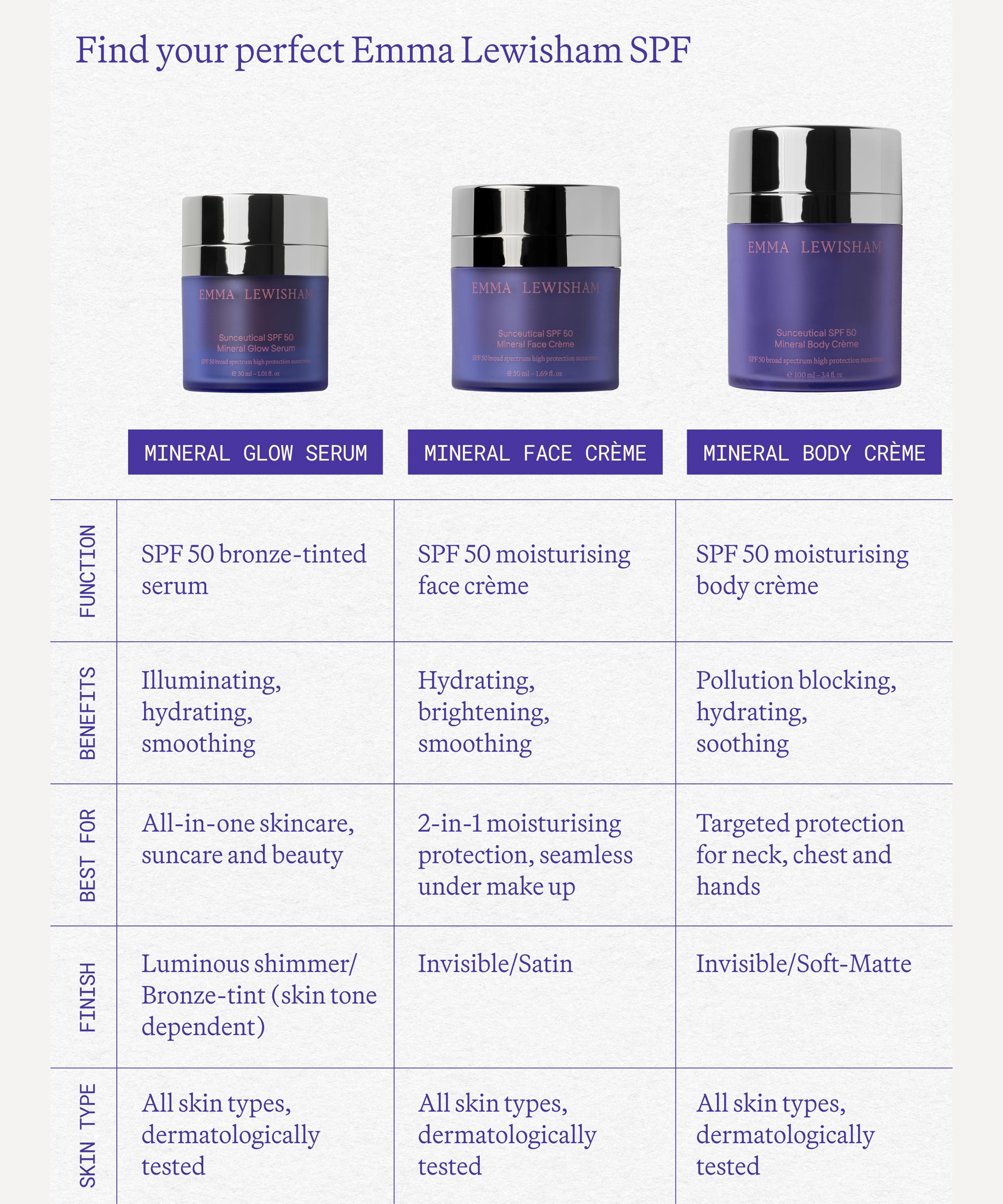 Bringing the benefits of scientifically-proven skin care ingredients to your daily suscreen, Emma Lewisham's Sunceutical SPF 50 Mineral Face Crème is a protective moisturiser that sumptuously melts into skin with a non-whitening, satin finish.