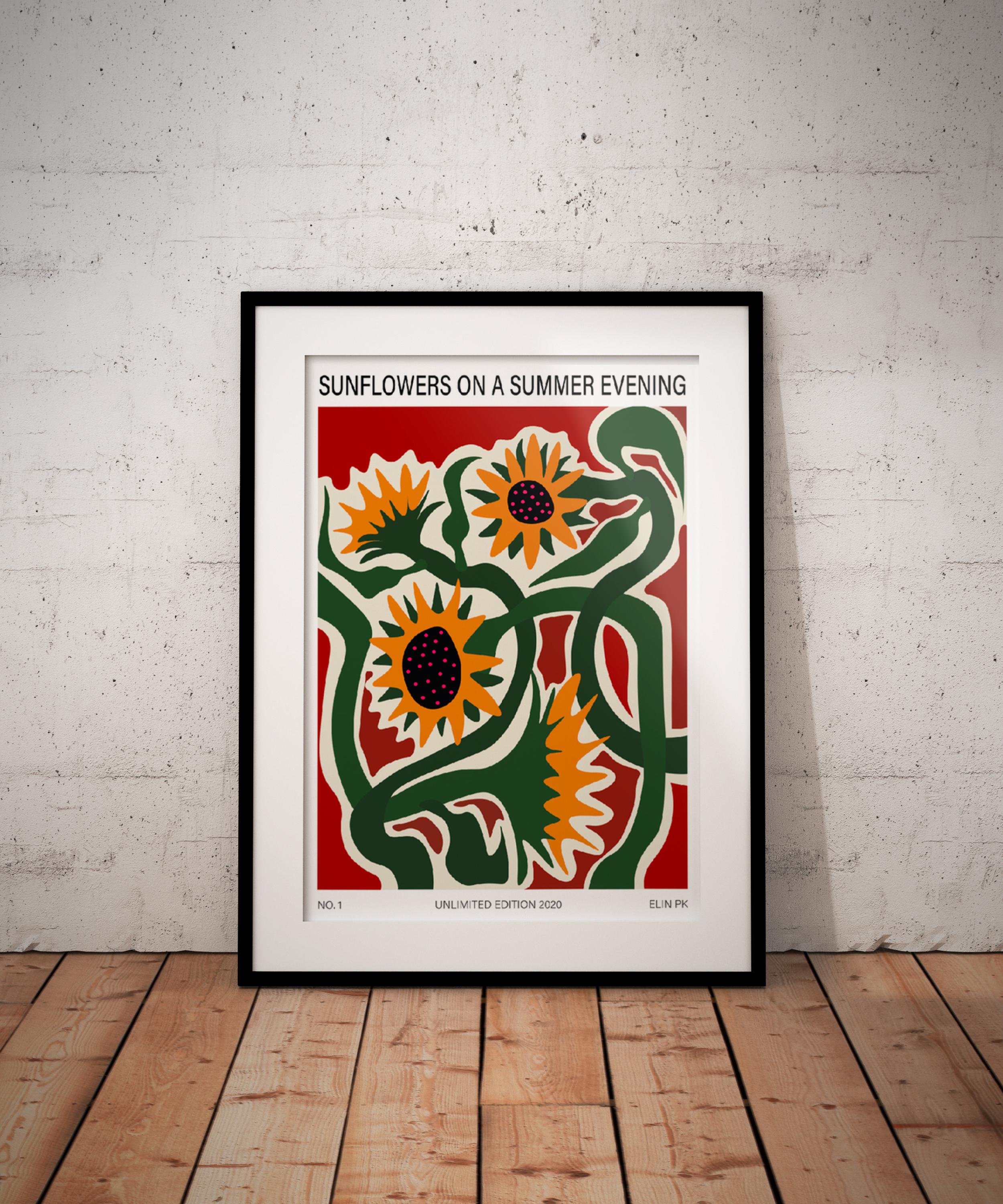 The Sunflowers On A Summer Evening print from Elin PK forms part of a collection of botanical inspired designs, created by Swedish artist and illustrator Elin Palmaer Karlsson.