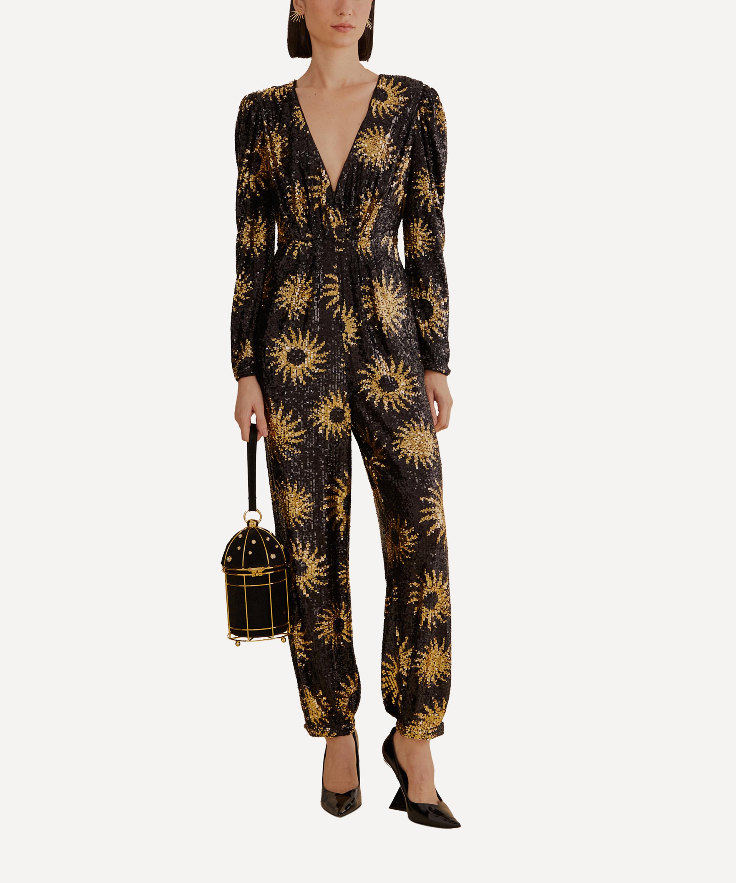 Intricately detailed all-over with shimmering black and gold sequins presenting a sparkling sun pattern, this jumpsuit is a true statement piece with its plunging V-neckline.