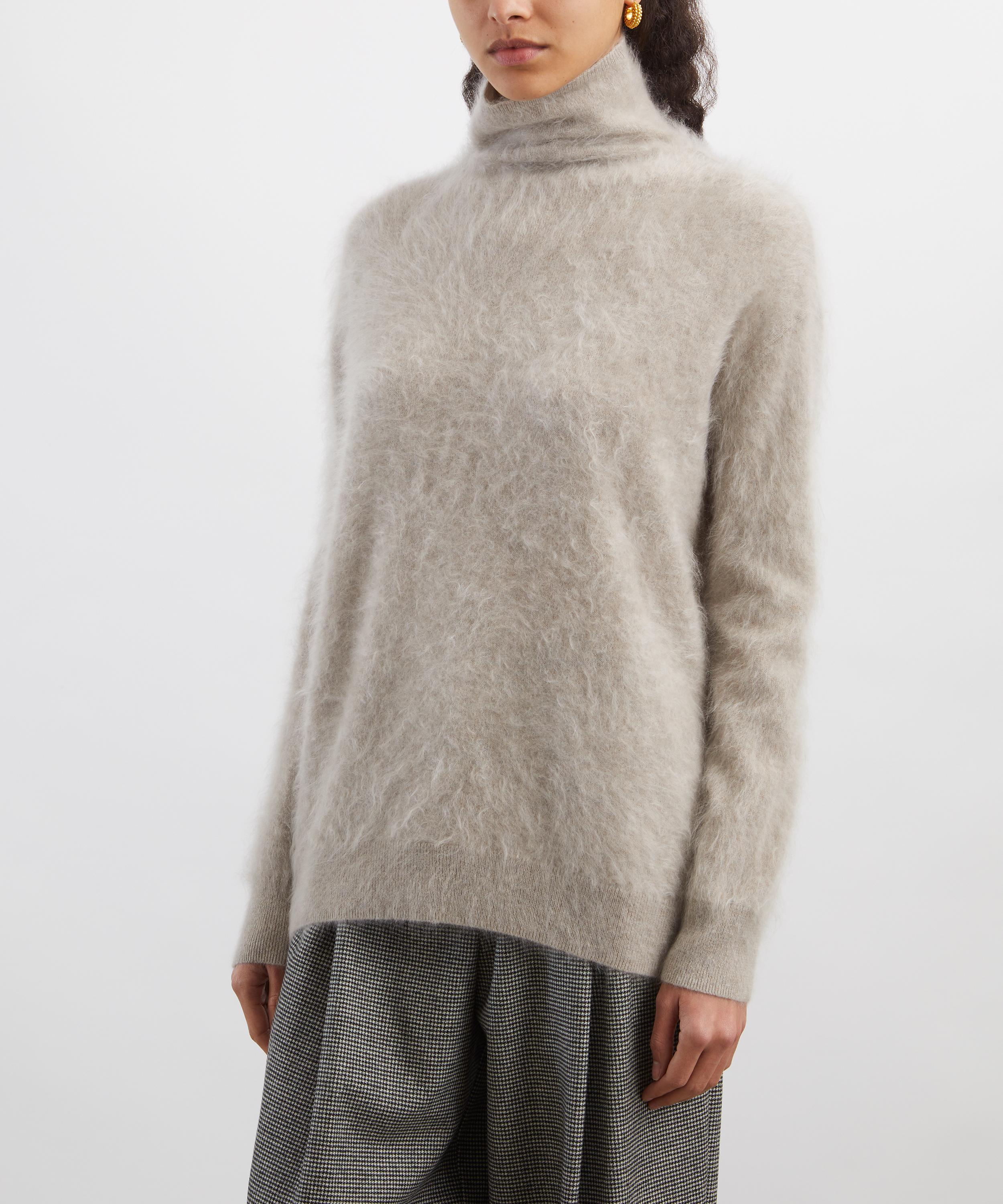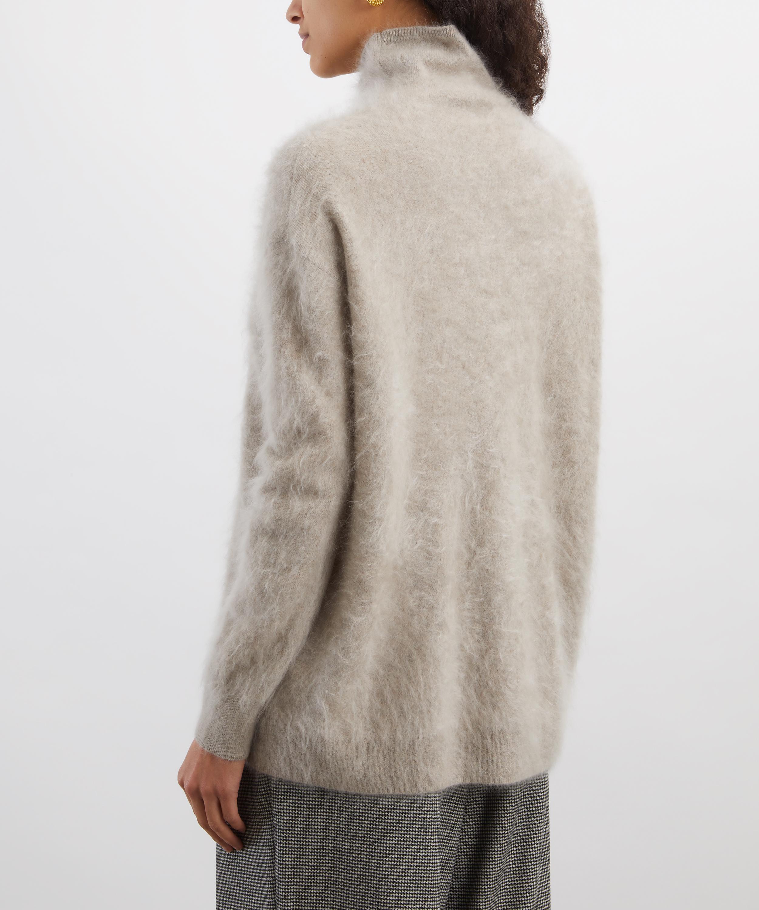 Crafted from a pure cashmere with a brushed, fluffy finish, this mock-neck jumper is designed in a slightly loose fit with dropped shoulders, long sleeves, and ribbed trims for a refined finish.