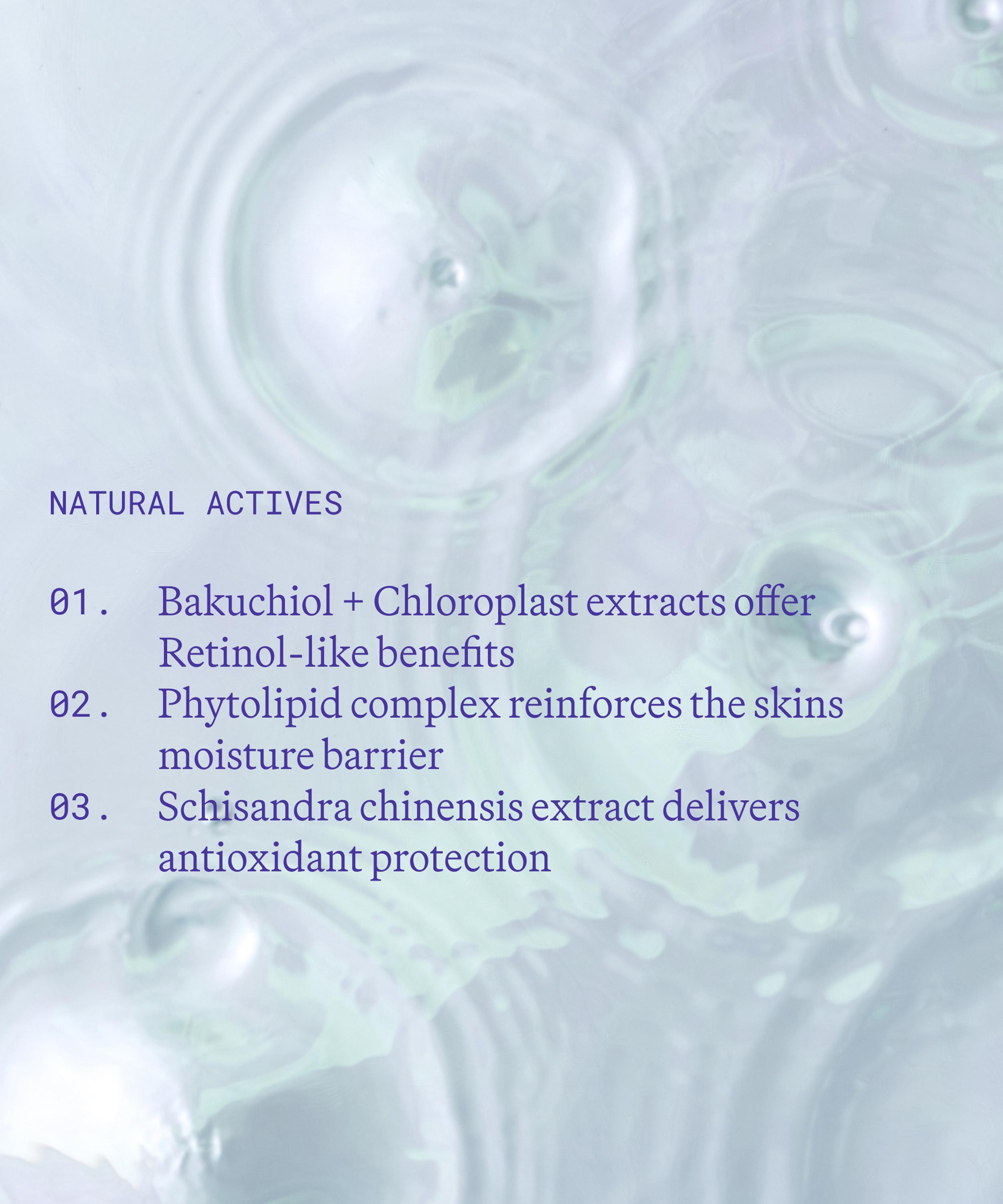 Camellia japonica seed oil, Jojoba esters, Citrullus lanatus seed oil, Opuntia ficus-indica seed oil, Terminalia ferdinandiana seed oil, Tridecane, Undecane, Squalene, Bakuchiol, Schisandra chinensis fruit extract, Medicago sativa extract, Cocos nucifera oil, Alaria esculenta extract, Jojoba oil/Macadamia seed oil esters, Phytosterols, Phytosteryl macadamiate, Tocopherol, Argania spinosa kernel oil, Calophyllum inophyllum seed oil, Limnanthes alba seed oil, Oenothera biennis oil, Prunus avium seed oil, Rosa canina fruit oil, Caprylic/capric triglyceride, Parfum (fragrance), Citronellol, Geraniol, Linalool, Citral, Limonene