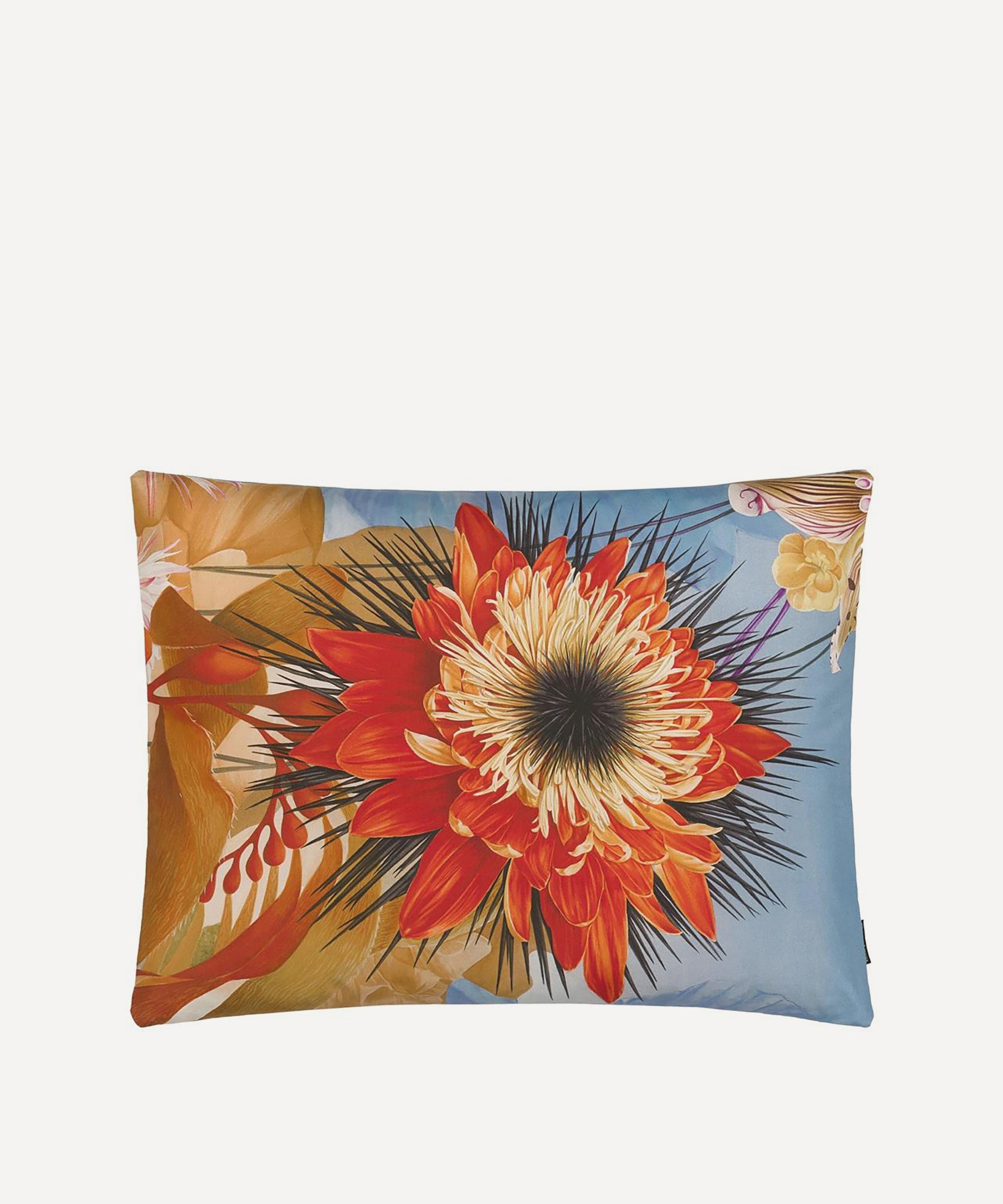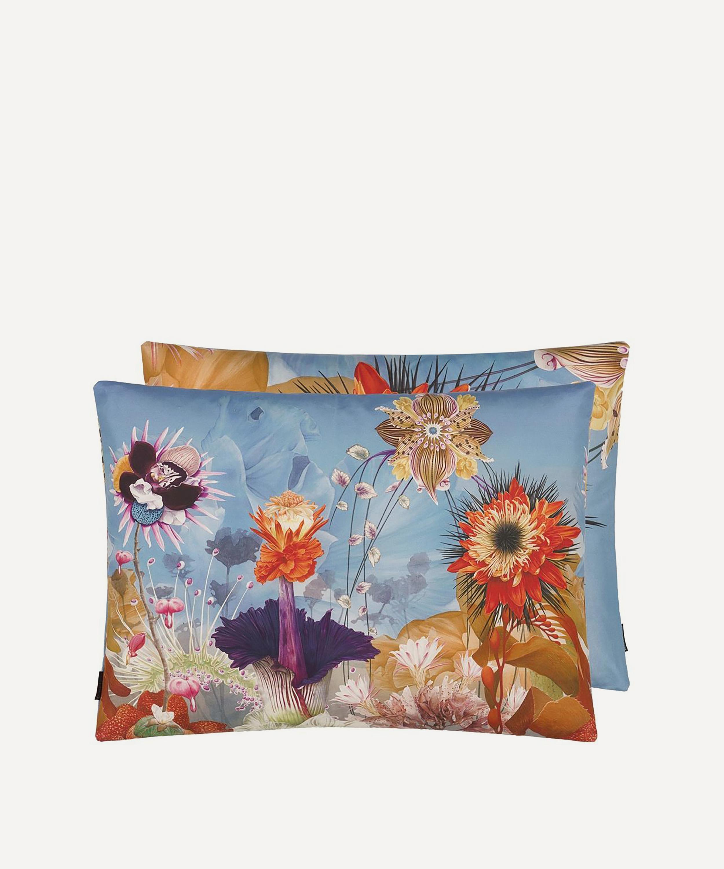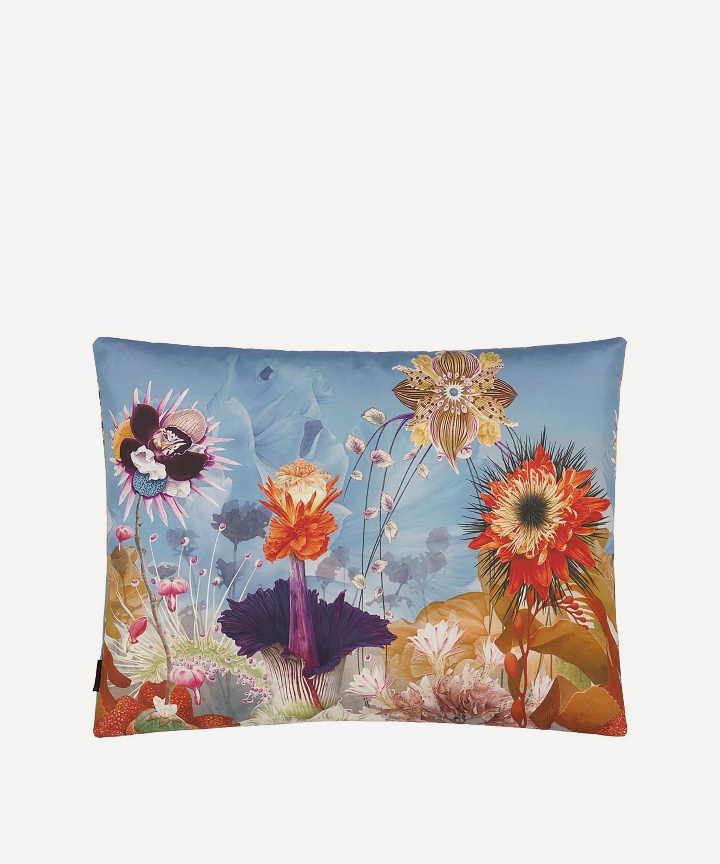 Spotlighting riotous fresco of wild and imaginary flowers to the front, this cushion is digitally printed and embroidered onto luxe cotton sateen. With a bold close up flower to the reverse, style with block colours to enhance the vibrant design.