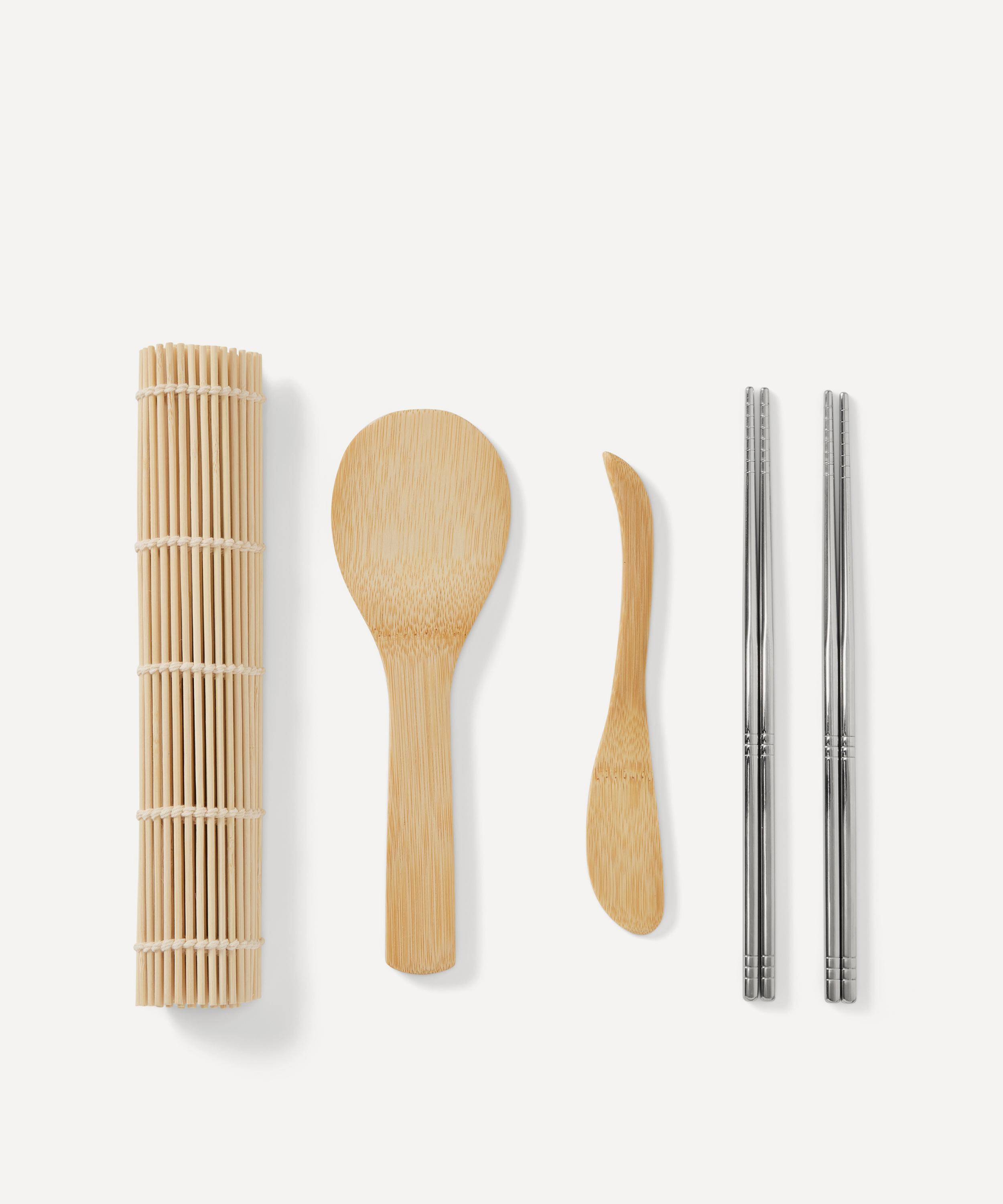 - Includes: x1 Bamboo Rice Paddle, x1 Bamboo Spreading Knife, x1 Bamboo Rolling Mat, x8 Chopsticks