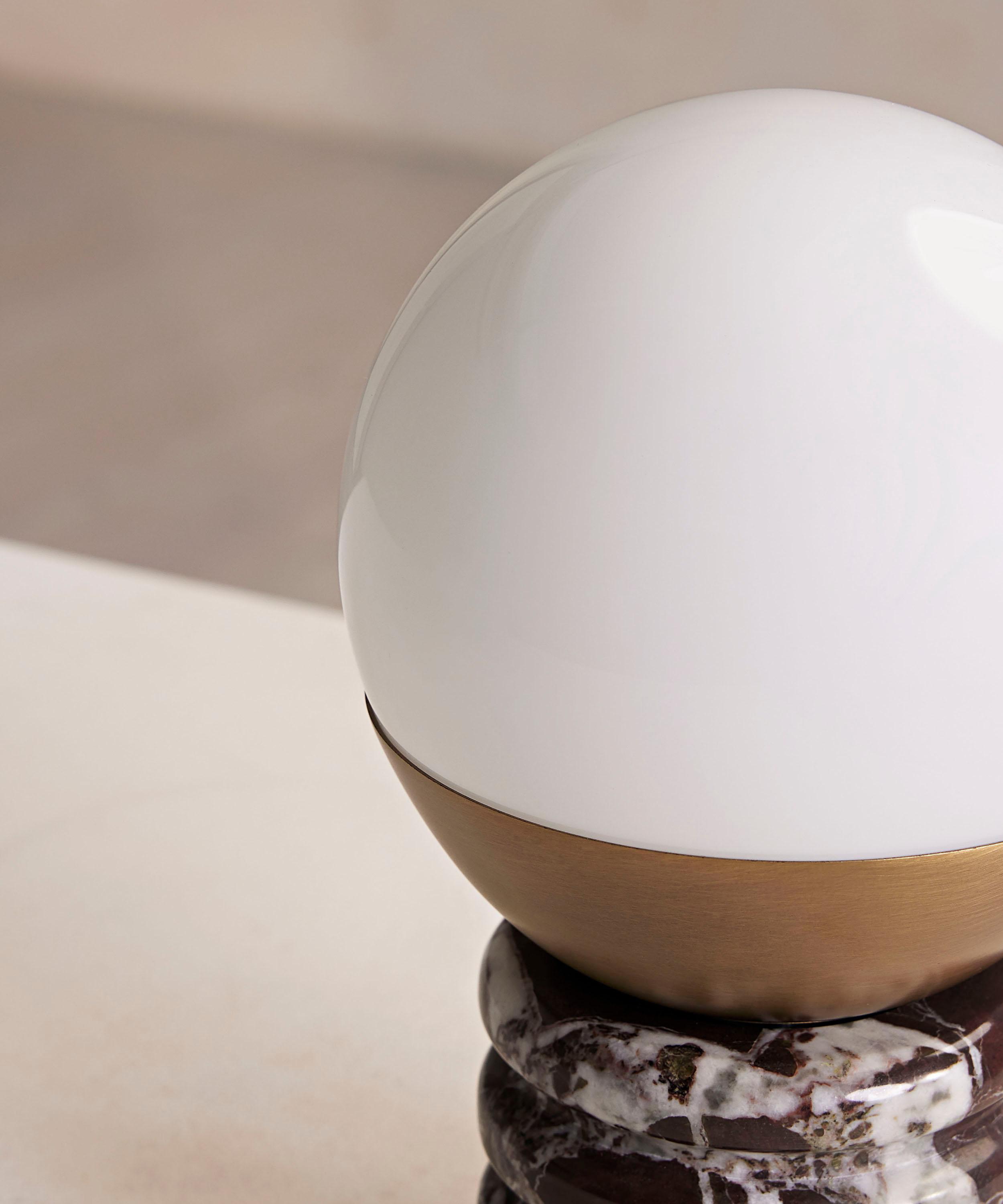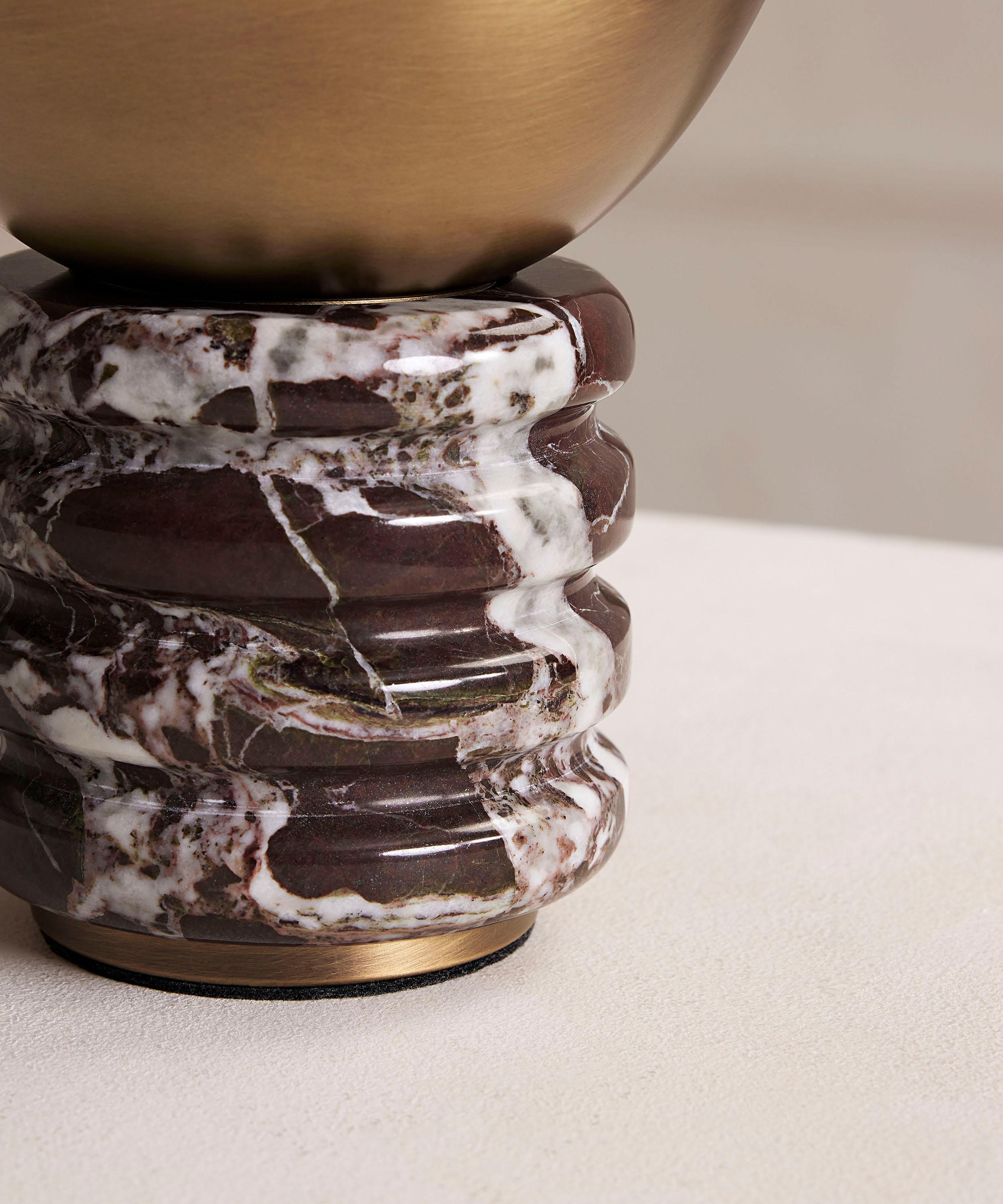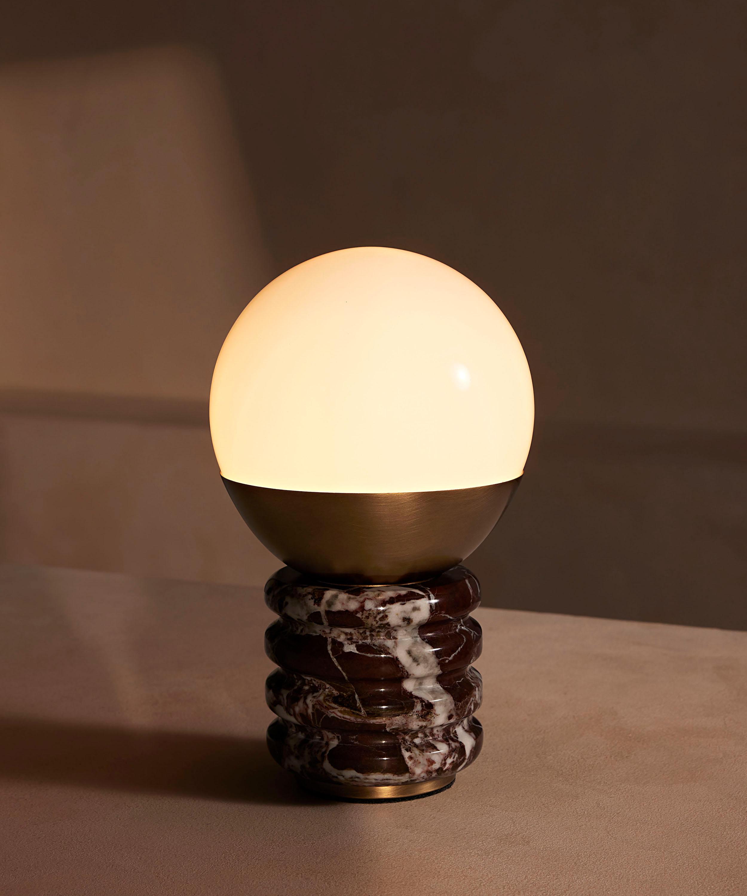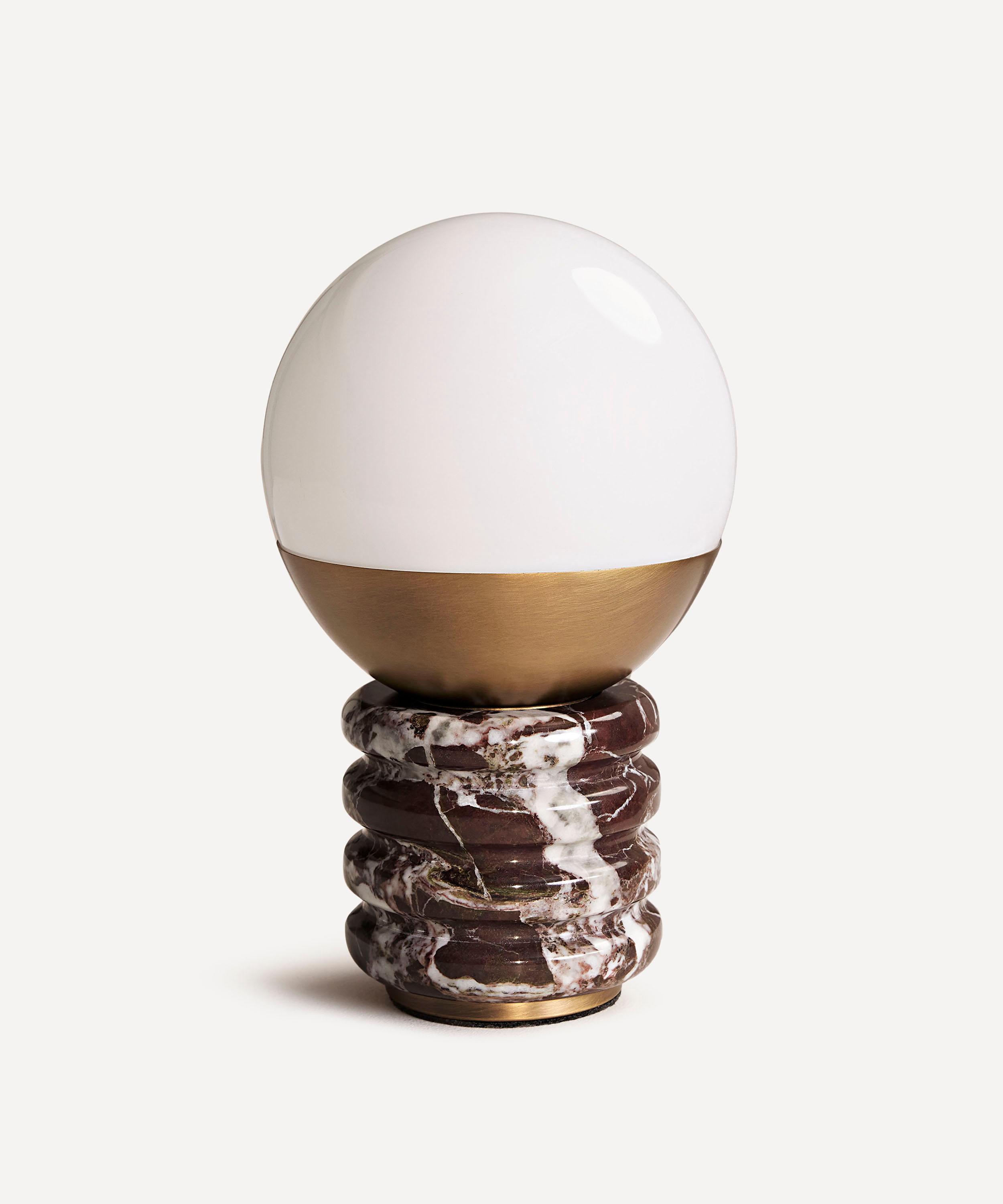 Crafted from Rosso Levanto marble, this modernist table lamp has a cylindrical base with ridges, and a white glass orb set in antique brass. The solid marble base has distinct veining in the stone, which makes each lamp entirely unique. Place yours on a desk or side table to create an ambient glow. Please note: All marble elements have natural variations and will differ from piece to piece.About Soho Home