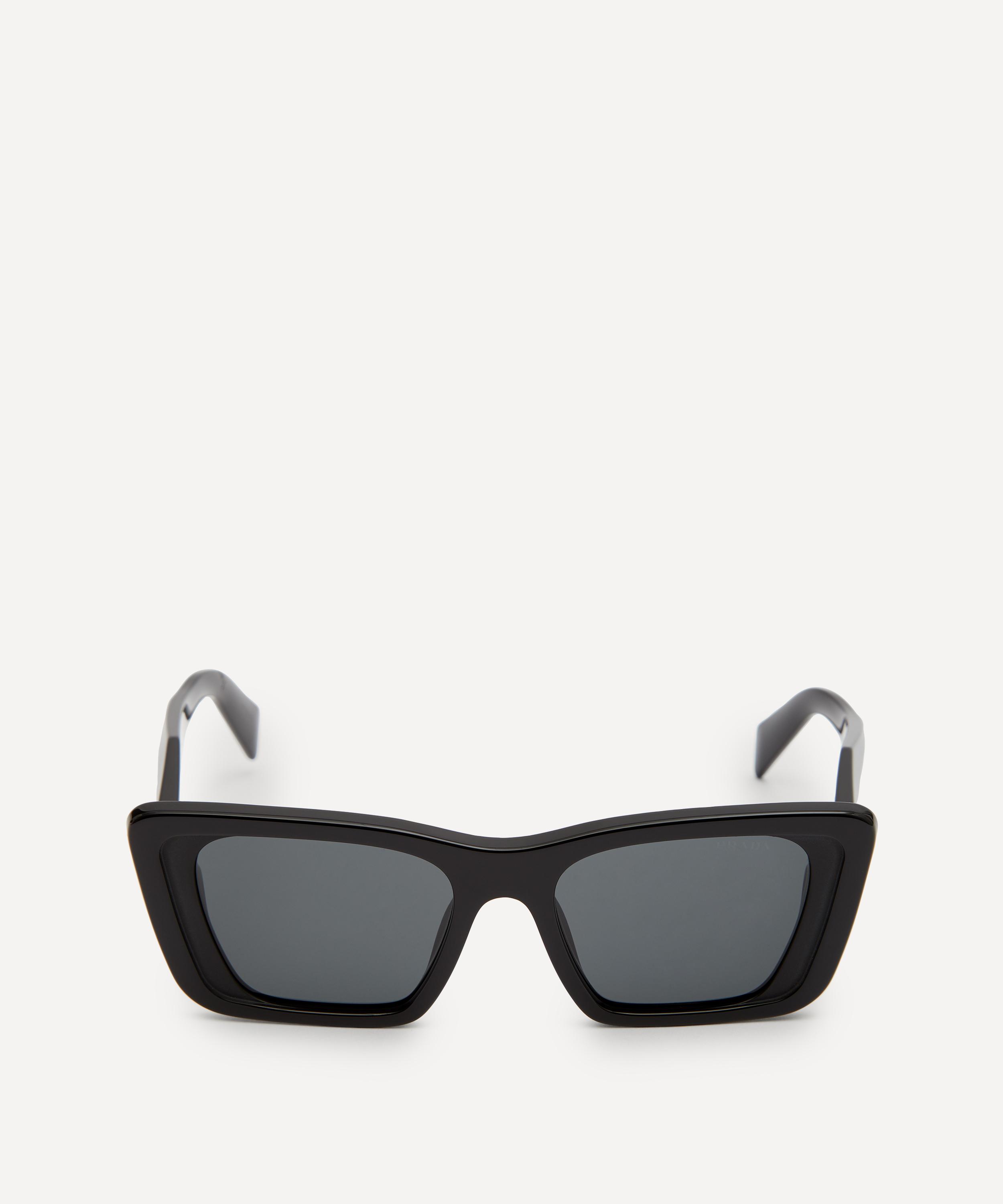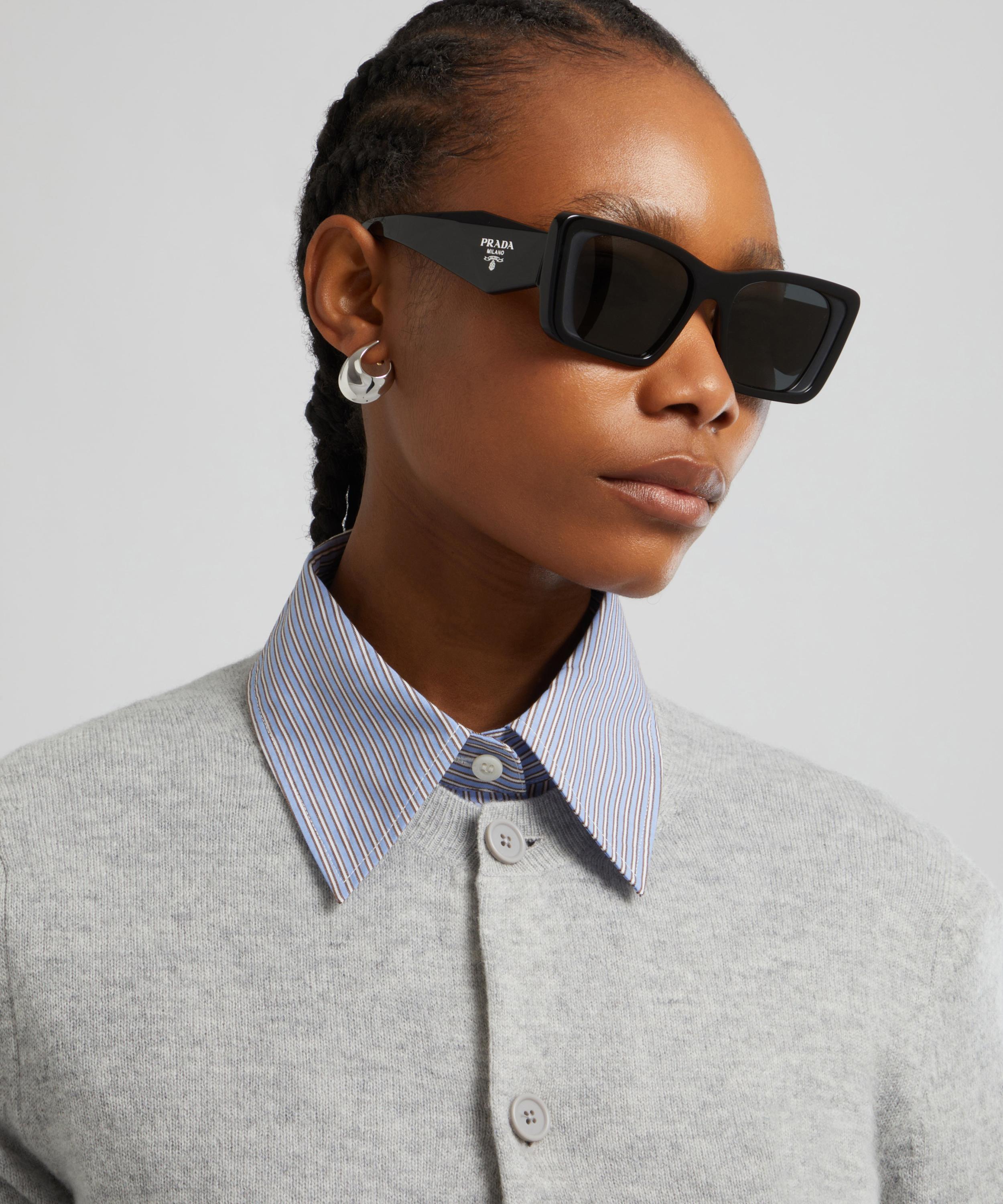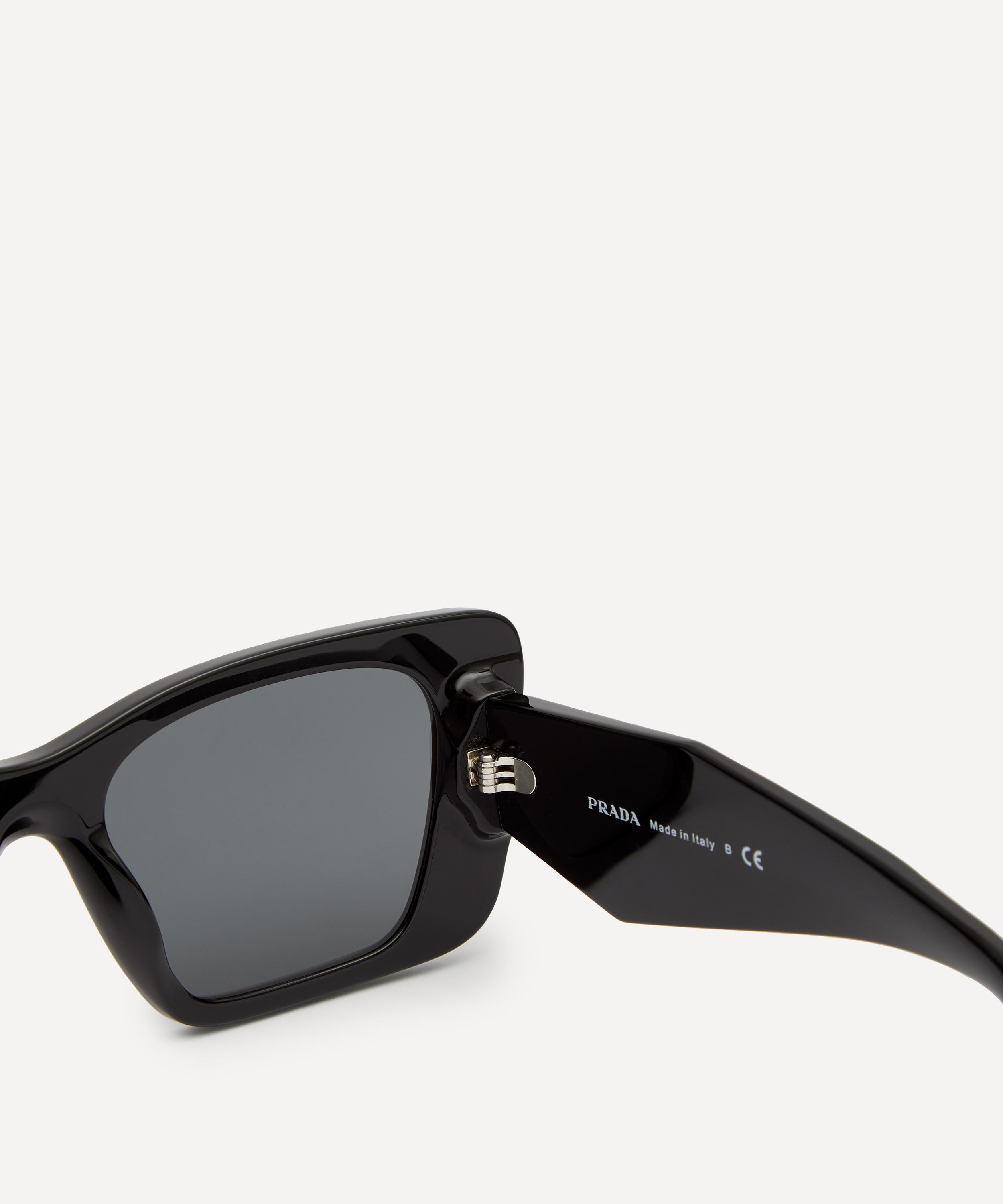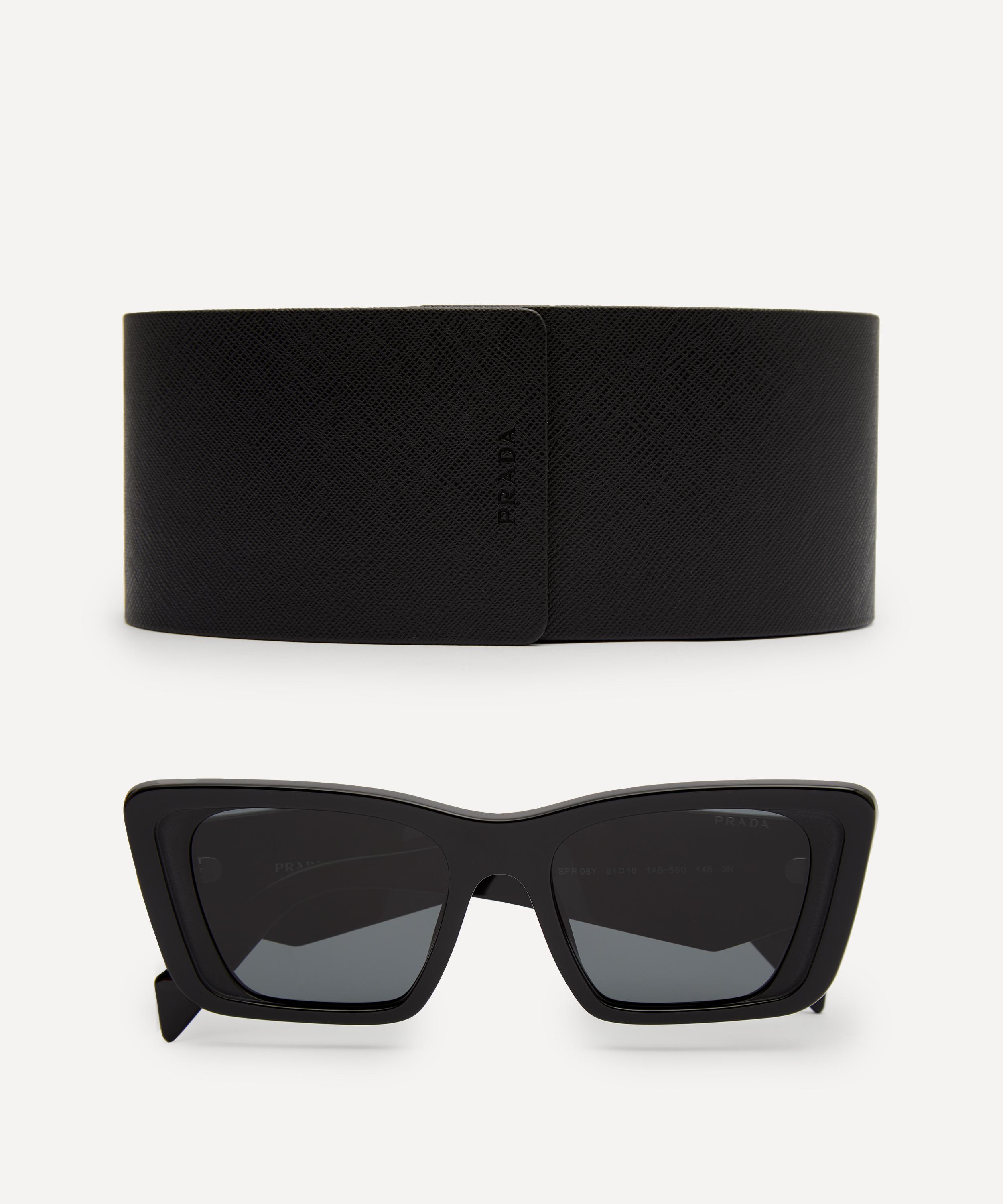 Crafted from premium black acetate with coordinating grey lenses, these sunglasses feature wide, angular temples with three-dimensional facets creating a sculptural, geometric finish. Signed off with the exclusive Prada logo on each side, they’re both effortlessly stylish and endlessly versatile - pair them with anything from casual denim to formal tailoring.