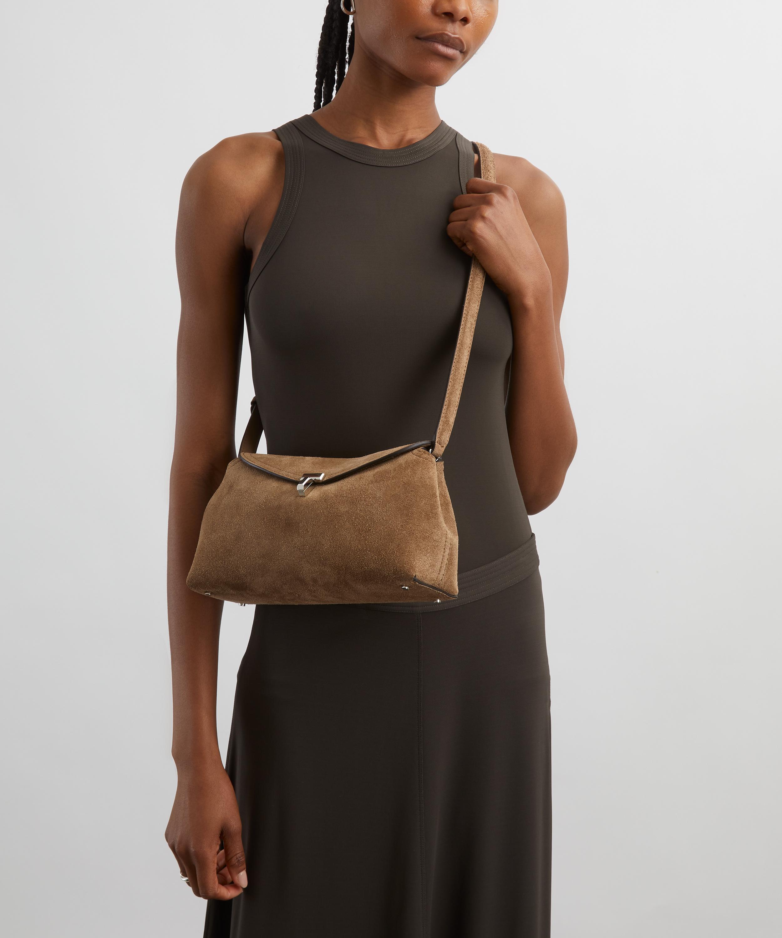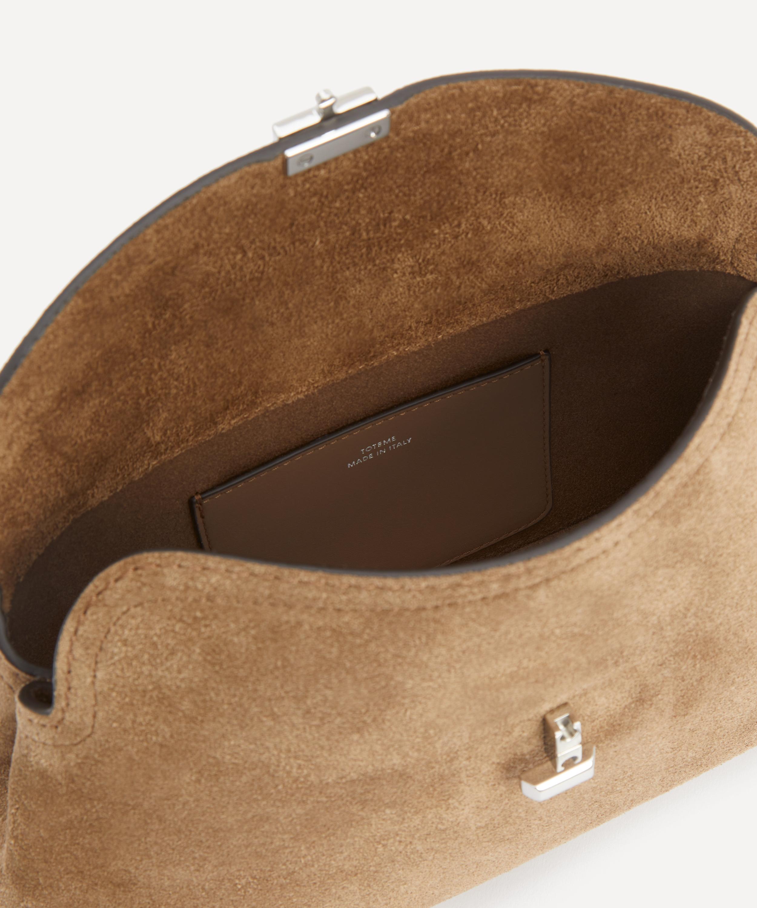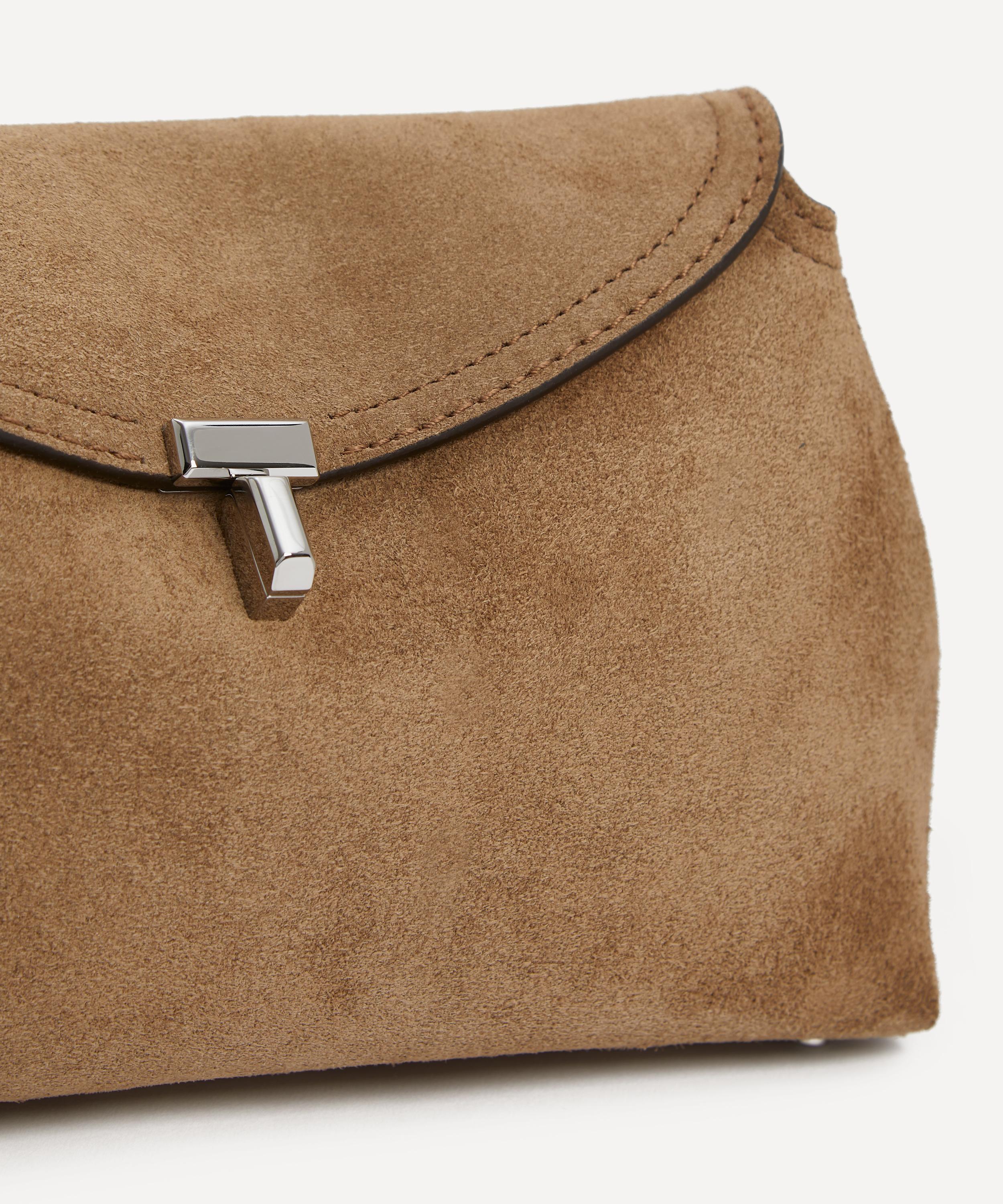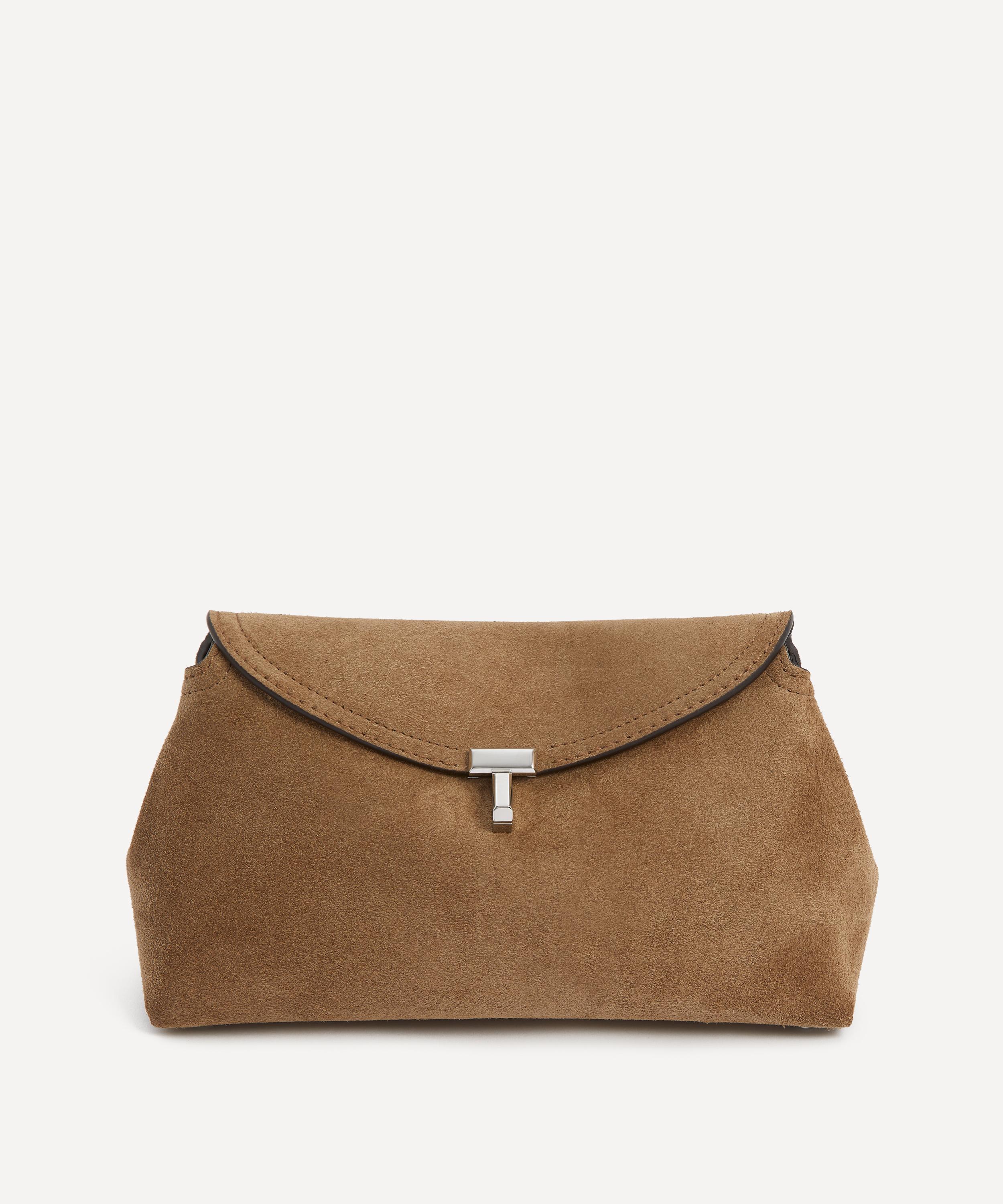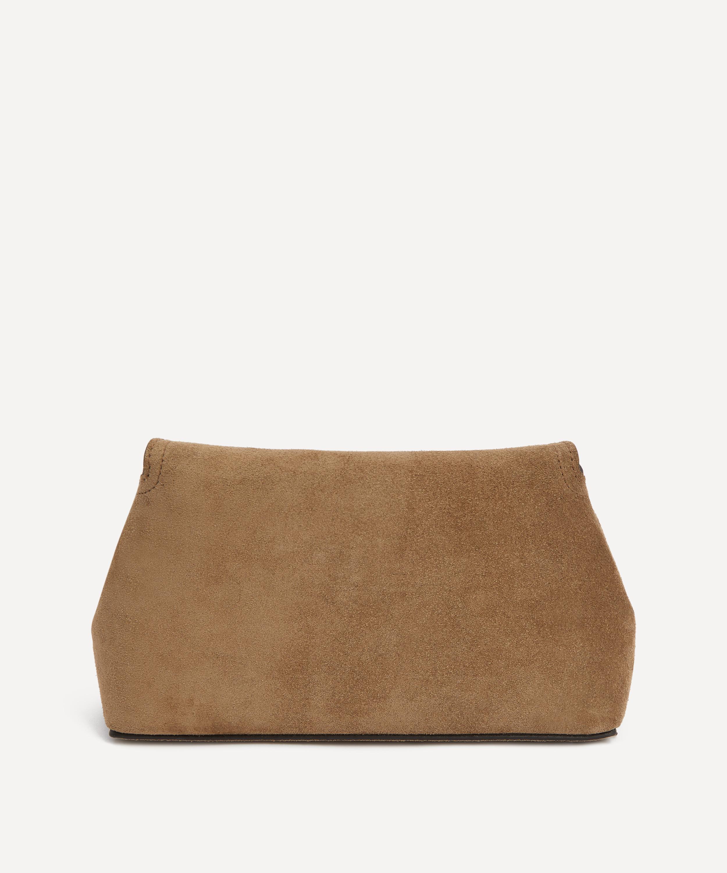 Crafted in Italy from smooth suede finished with a tonal top-stitched trim, this compact clutch bag features an optional, adjustable crossbody strap for versatile styling options, and is complete with an internal slip pocket and a metal twist lock securing the curved top flap oprning.