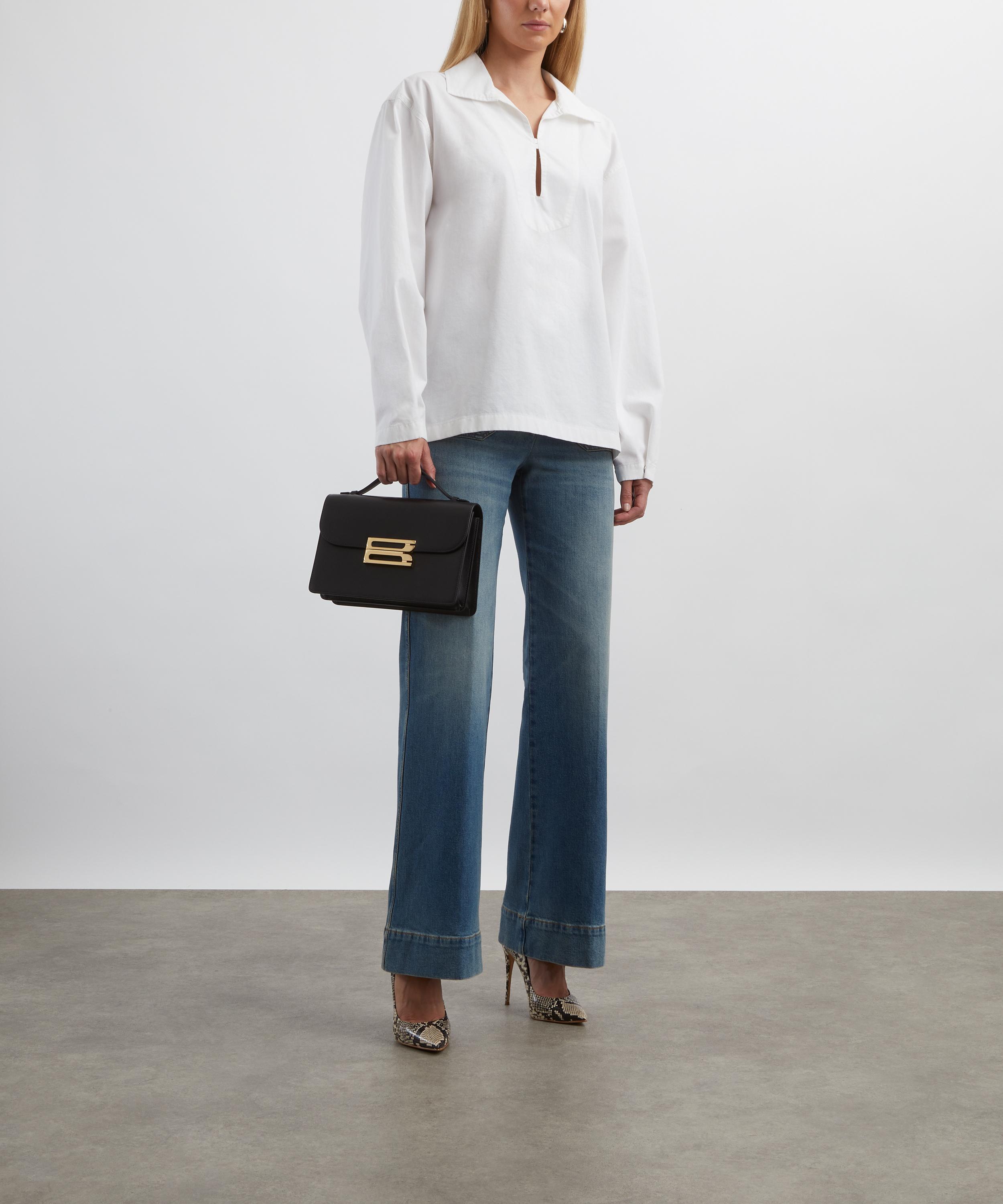 The Tab Detail Denim Top from Victoria Beckham serves as the foundation of the modern woman's wardrobe with its timeless design and sophisticated silhouette.