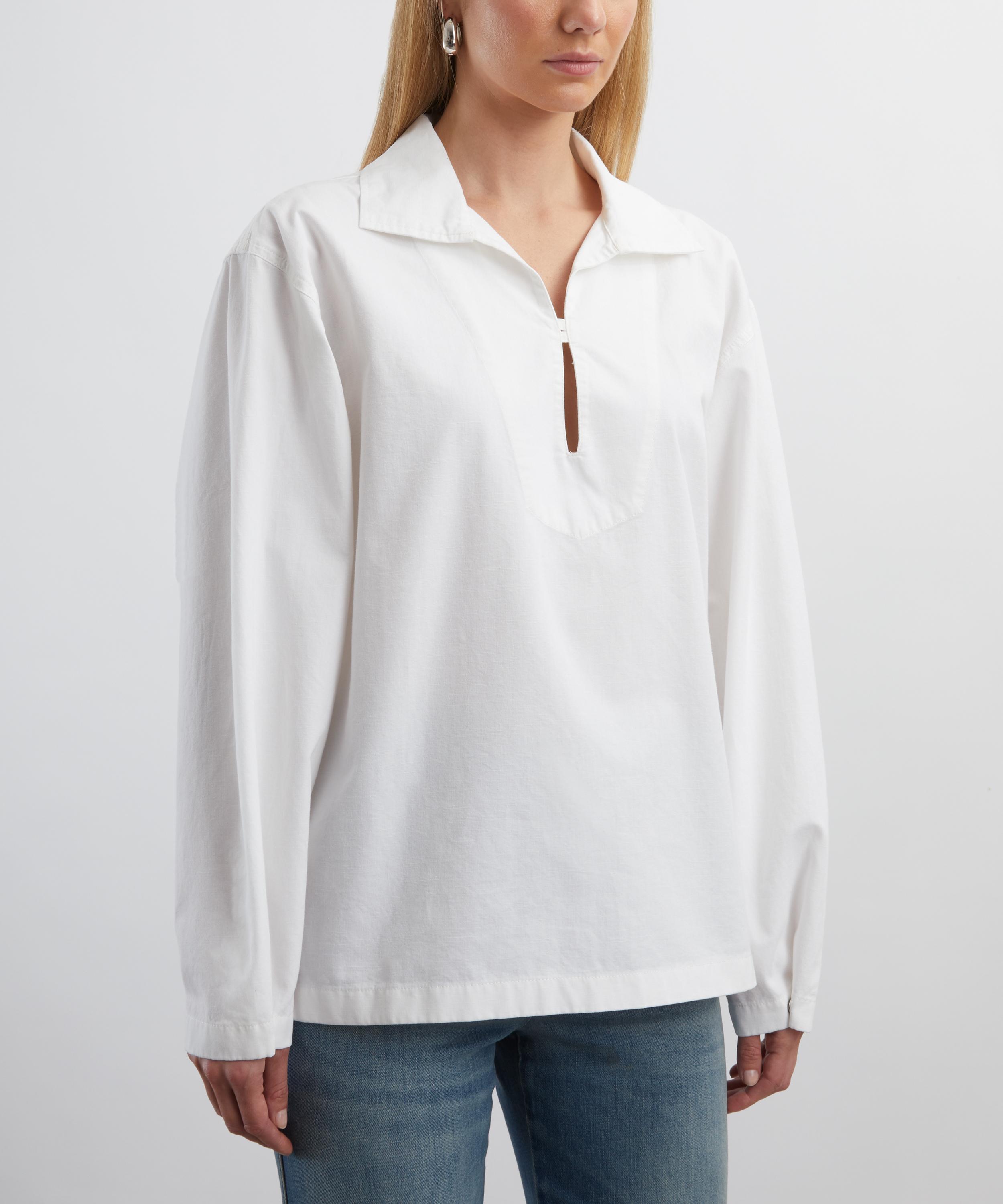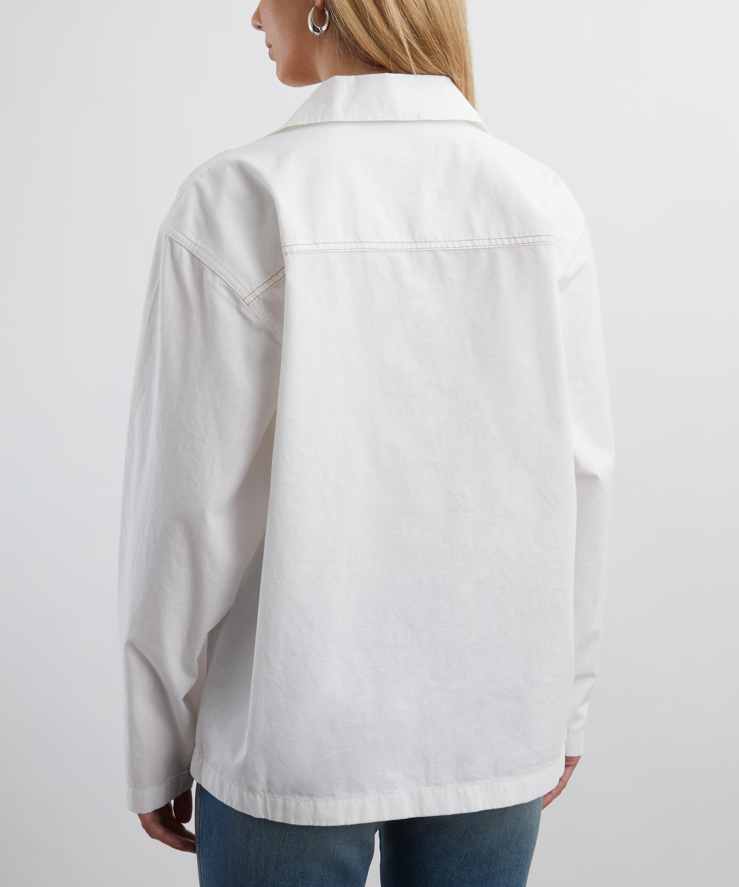 A fresh take on the classic denim shirt, the Tab Detail Denim Top blends utility and elegance with a sleek front opening featuring an internal button and rouleau loop closure. Snap cuffs and tobacco topstitching nod to its workwear roots, while the Washed White hue brings a crisp, contemporary edge.