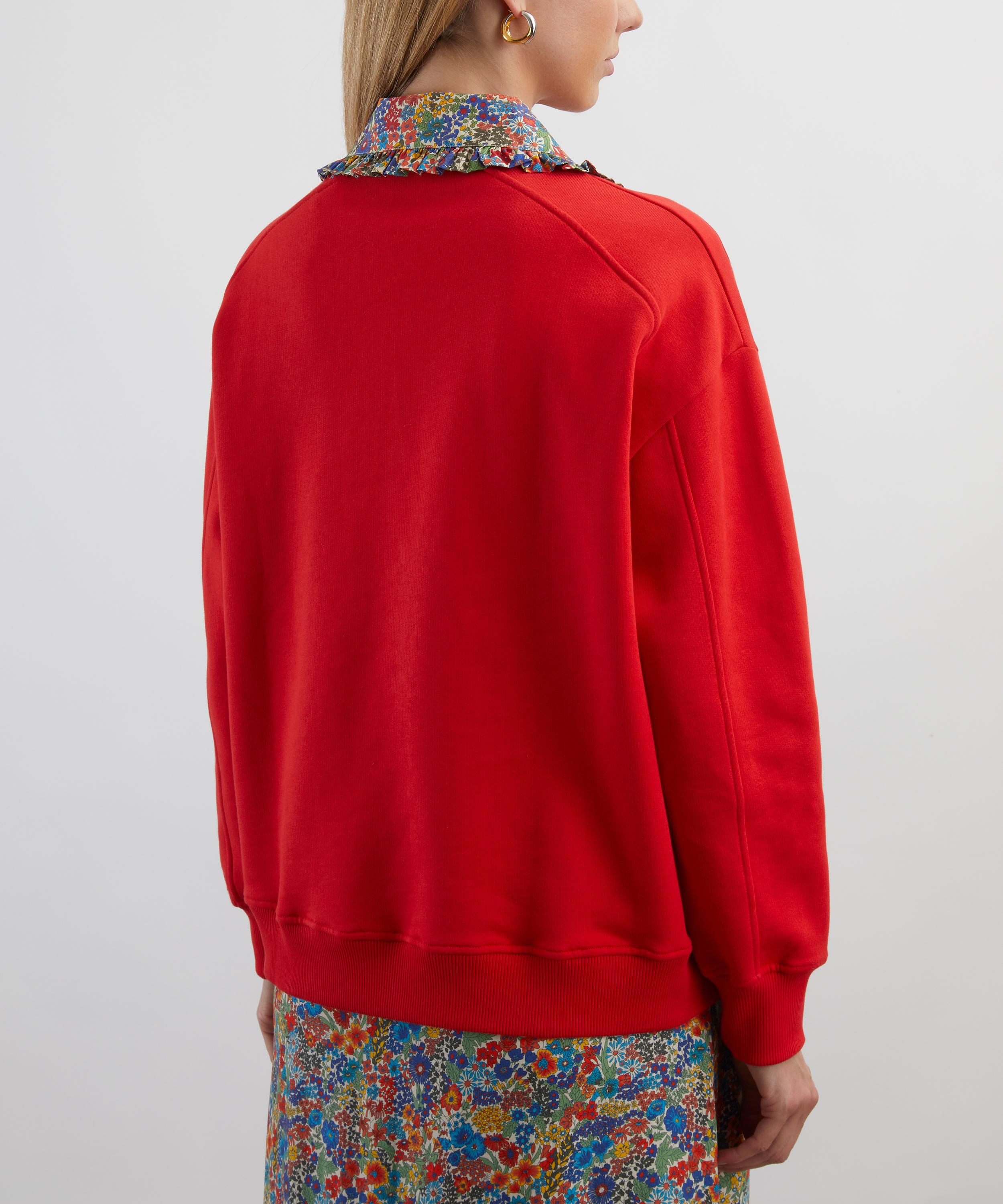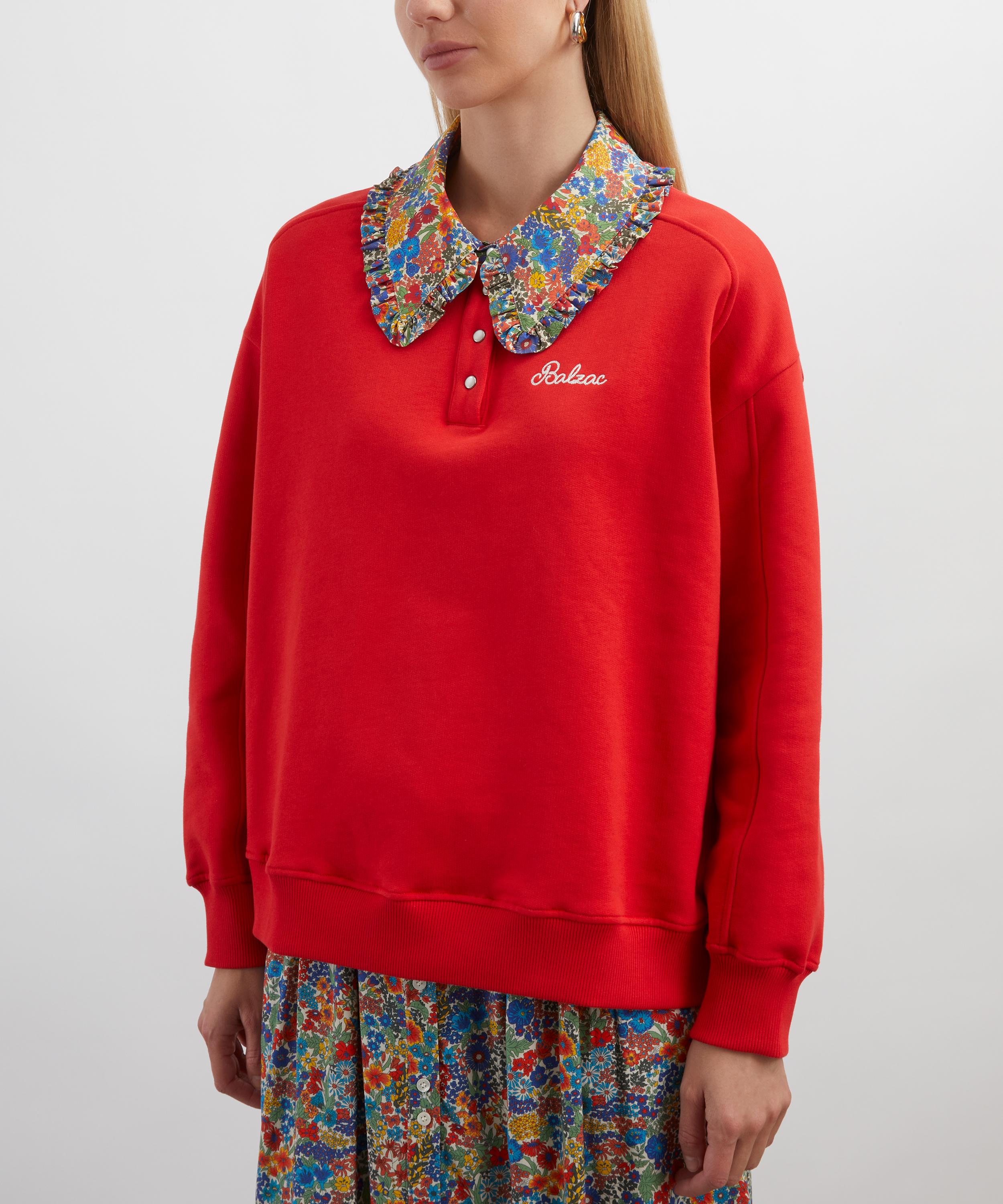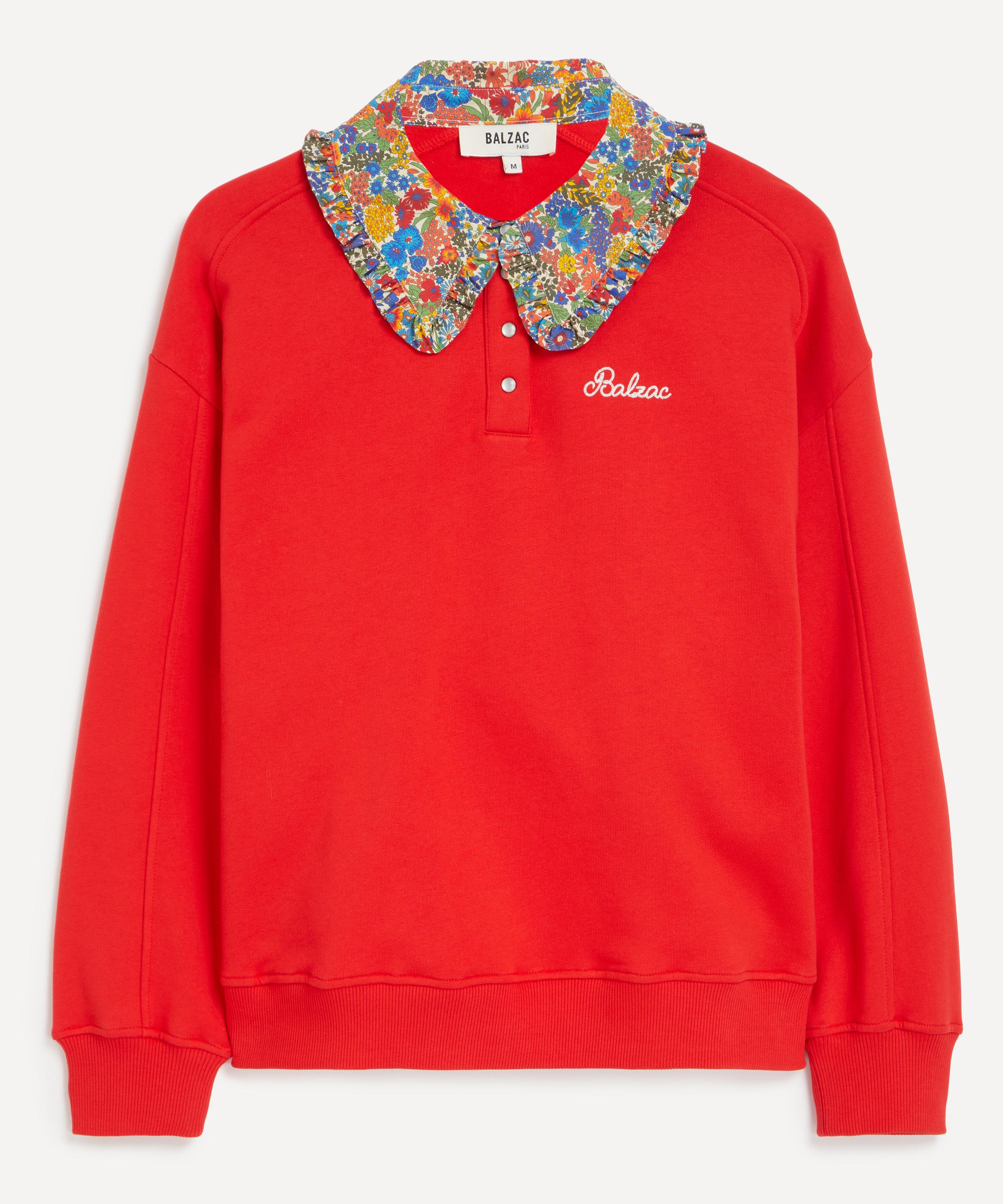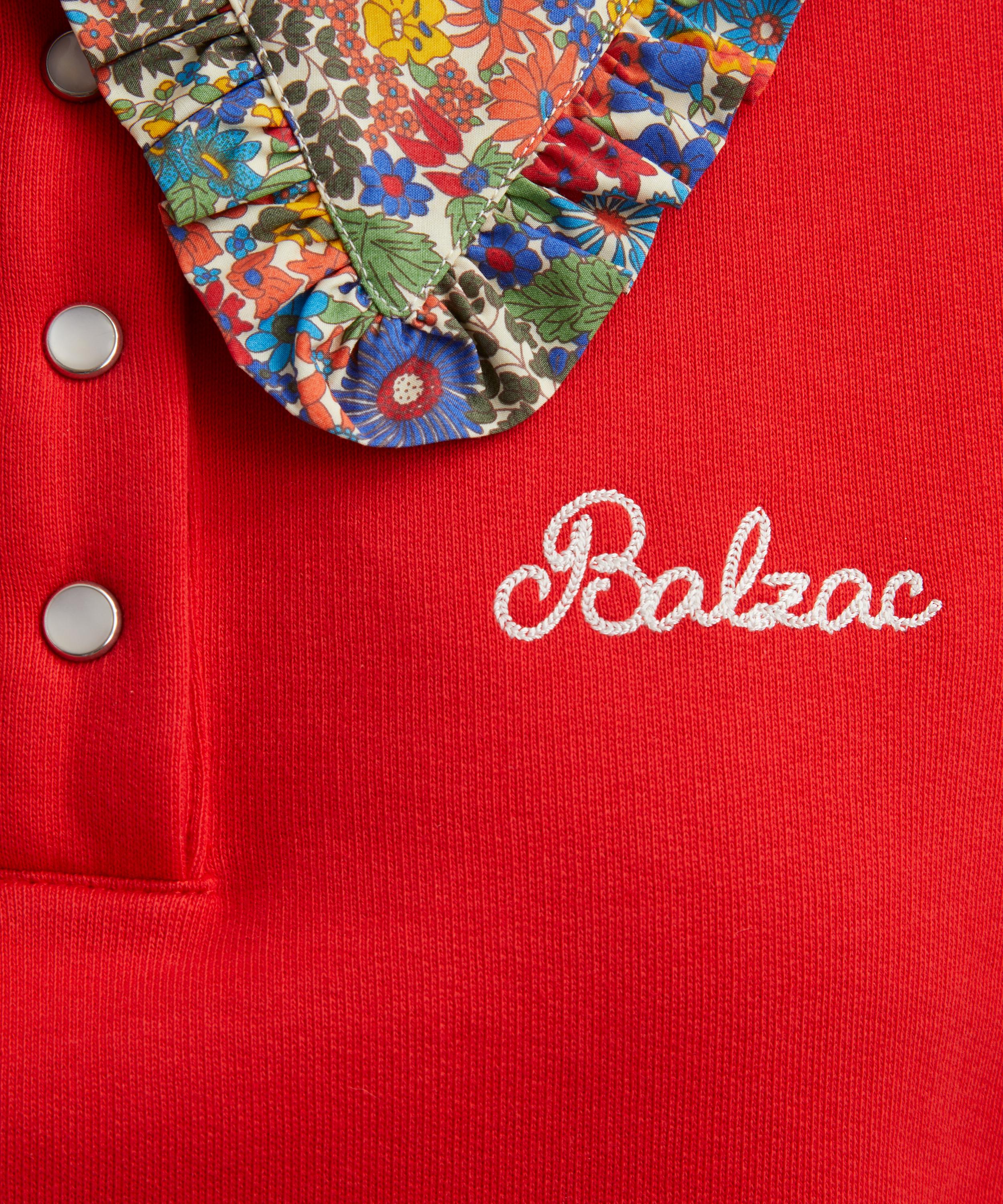 Crafted from soft cotton jersey, the red Tammy sweatshirt features a charming floral collar in Liberty’s classic Margaret Annie print. Designed for a relaxed fit, it includes a partial placket and subtle Balzac embroidery at the chest, striking the perfect balance between casual comfort and Parisian chic.