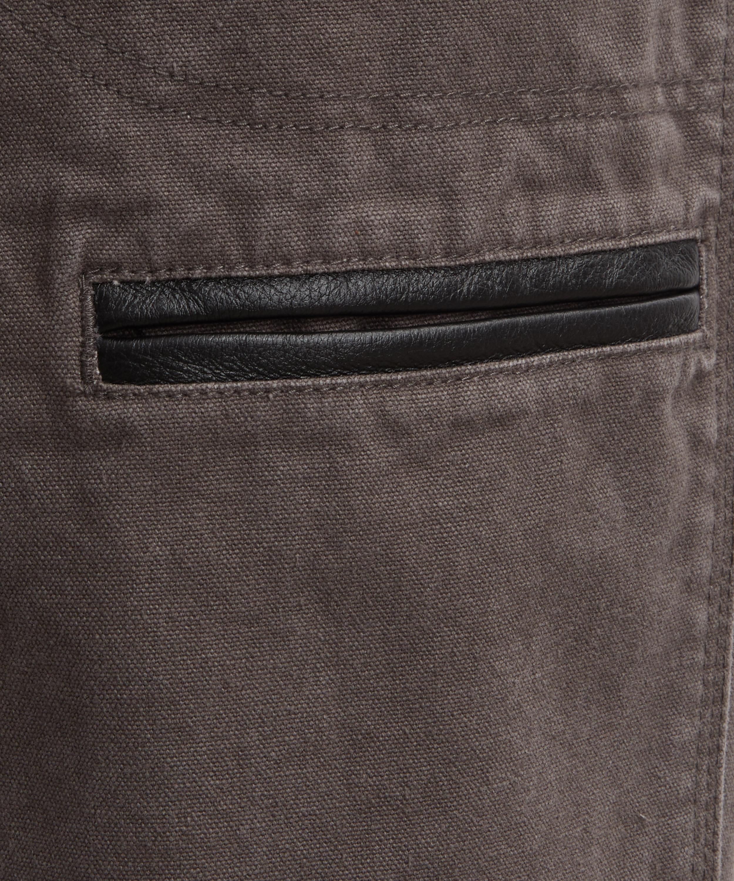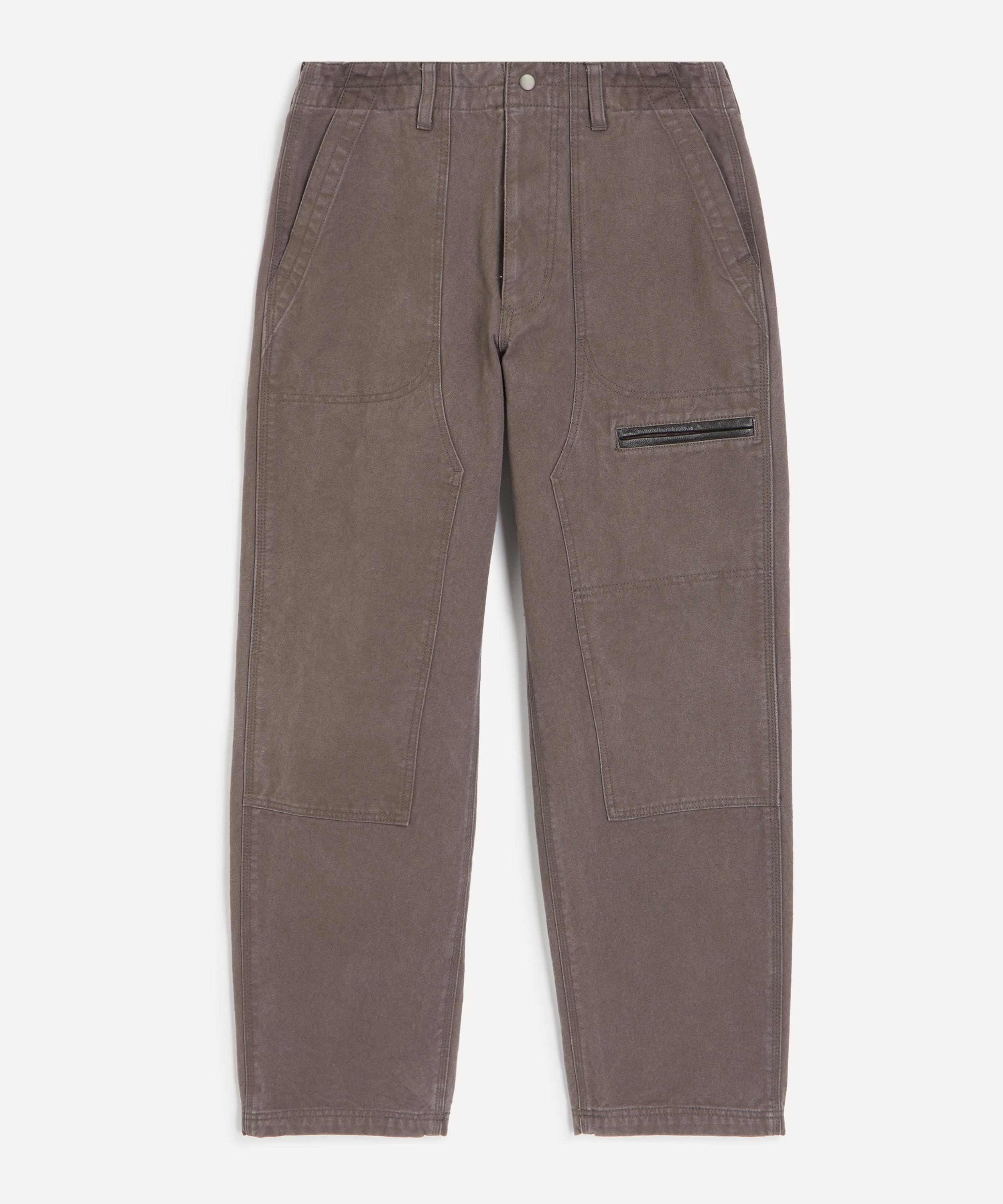 Cut from a hard-wearing heavy canvas, featuring a regular waist, button and zip fastening and double-knee reinforcements. A black leather jacket complements the leather zip detailing, fusing functional workwear with a streetwise attitude.