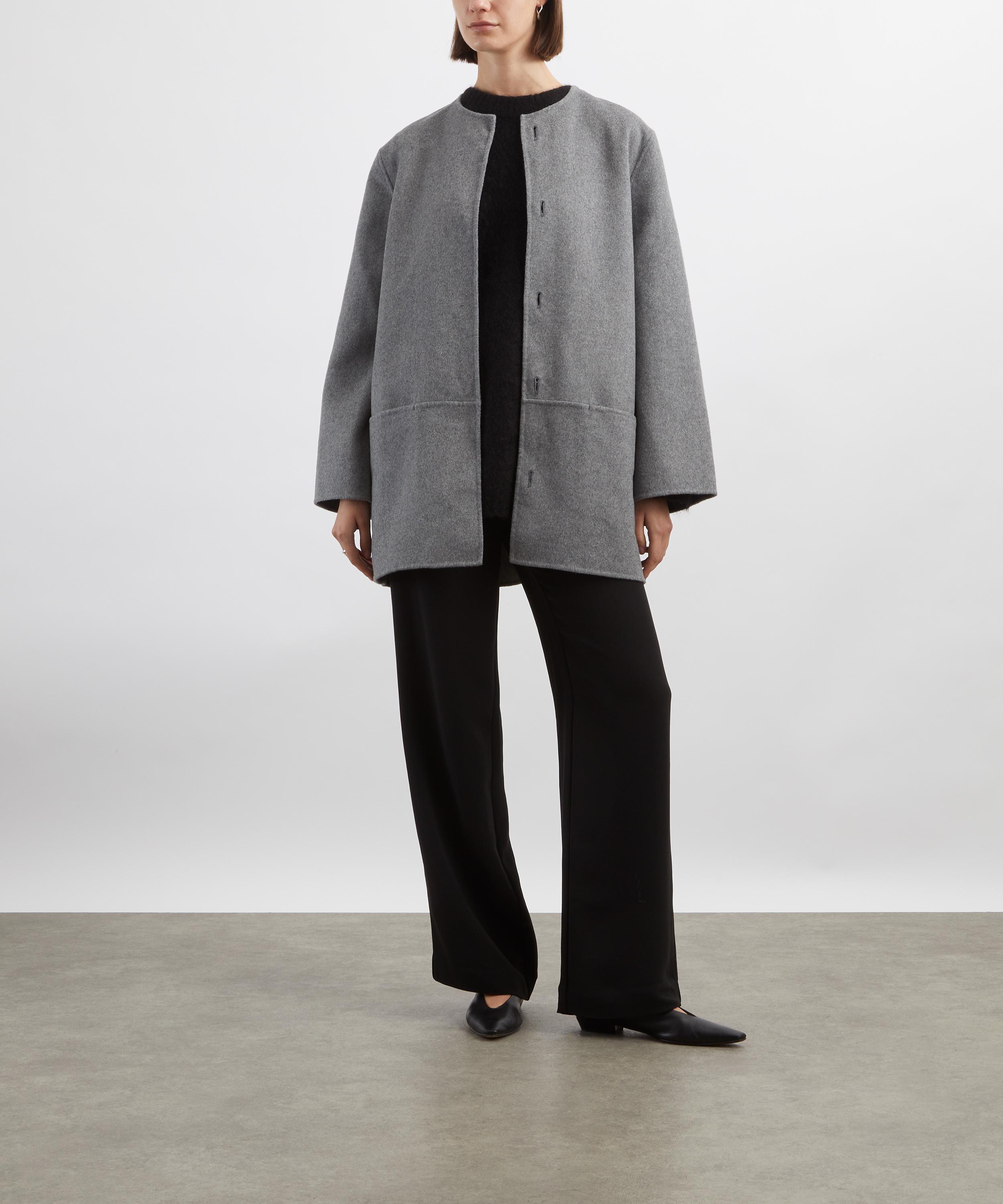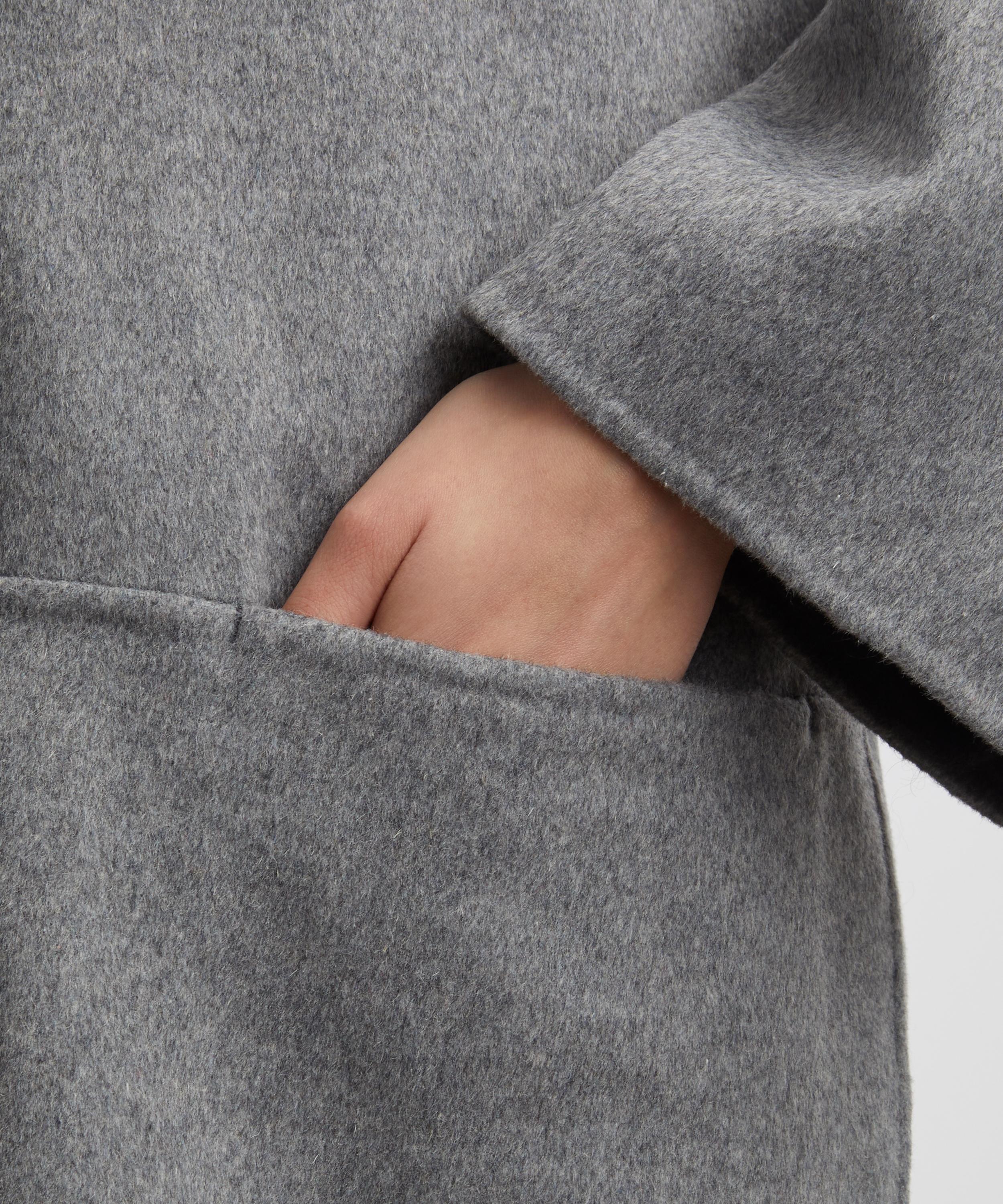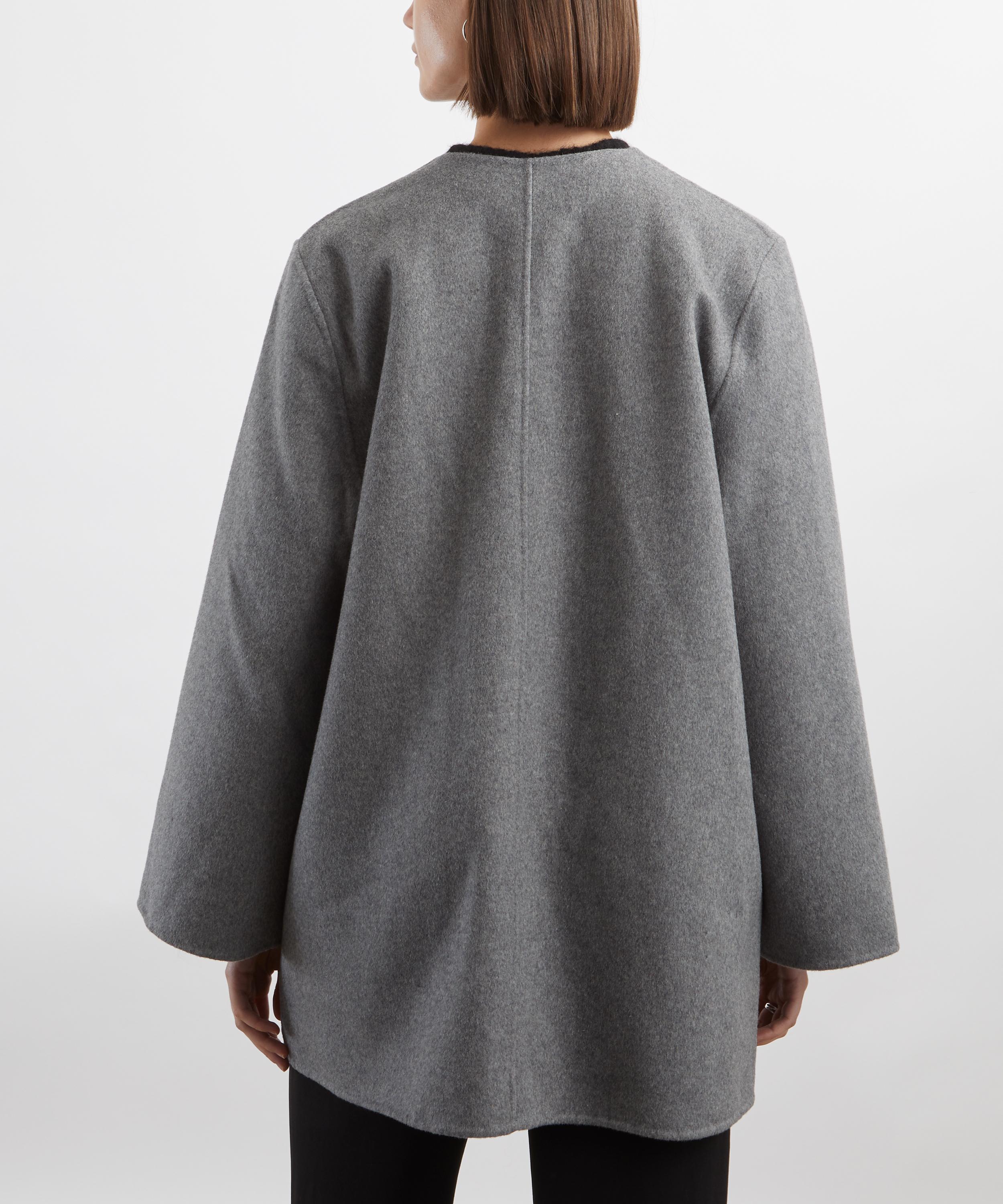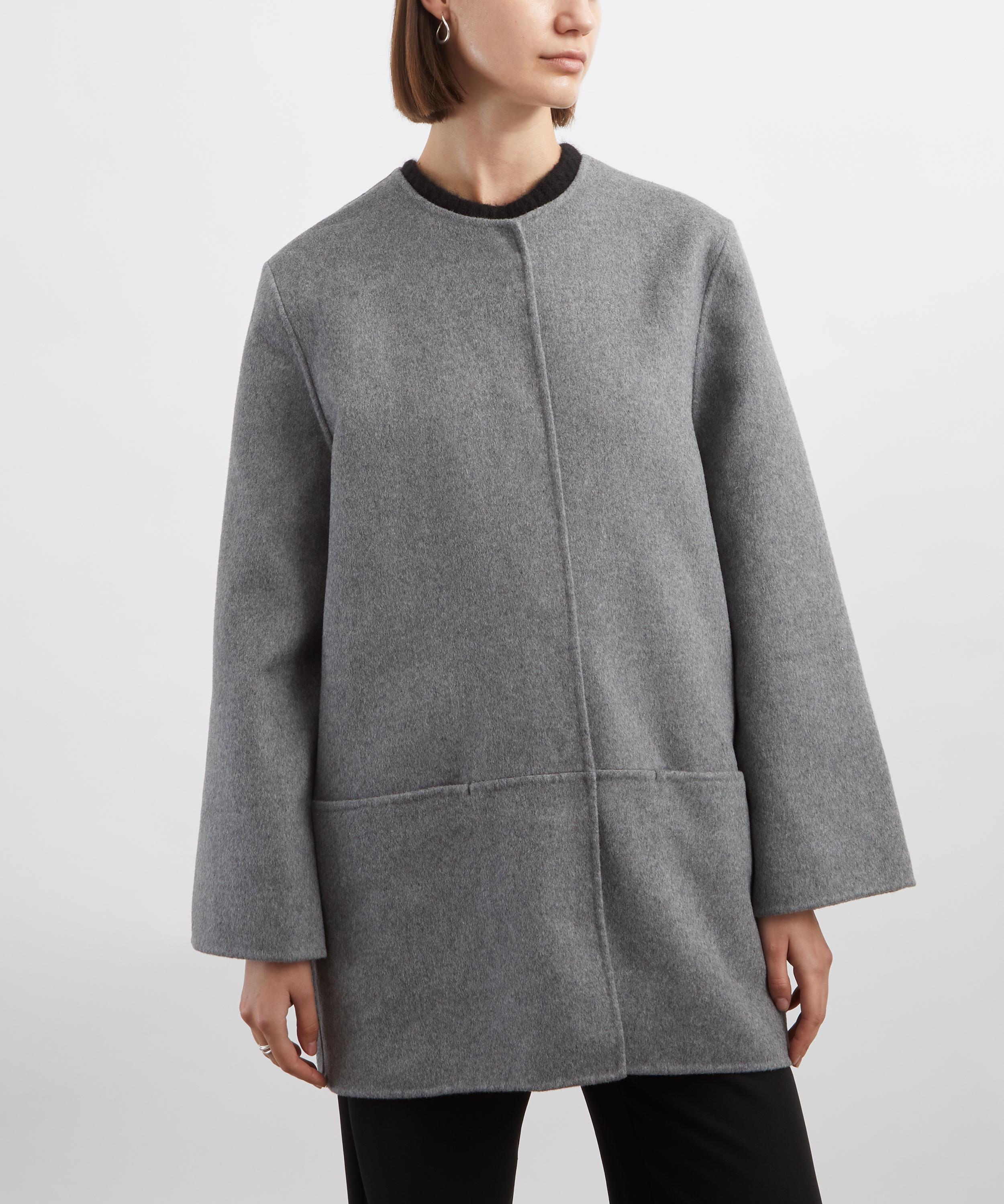 Crafted from a double-faced wool blend, this semi-long coat features a clean, round neckline, dropped shoulders, full-length sleeves, and an elegant concealed closure that enhances its minimalist silhouette.