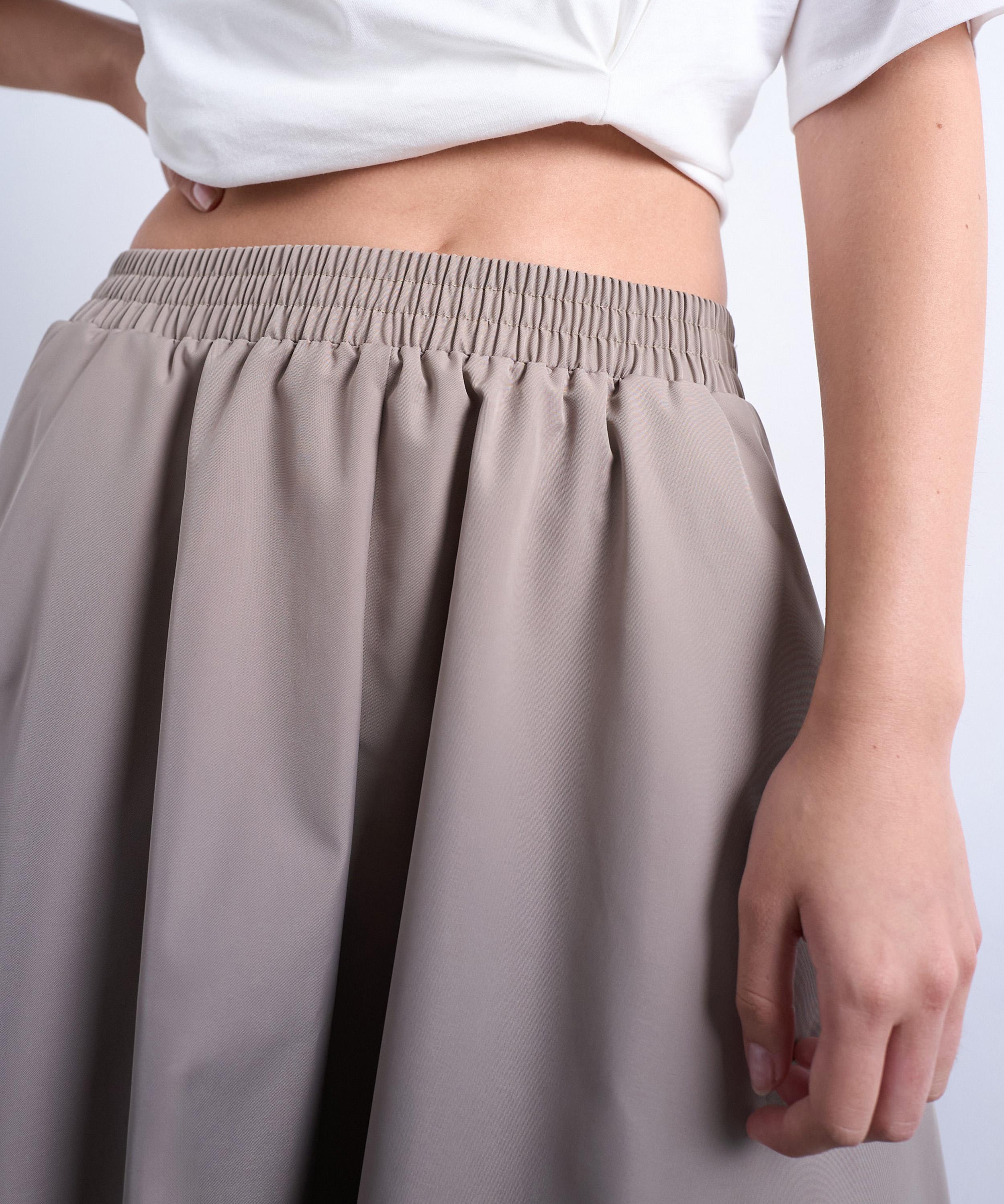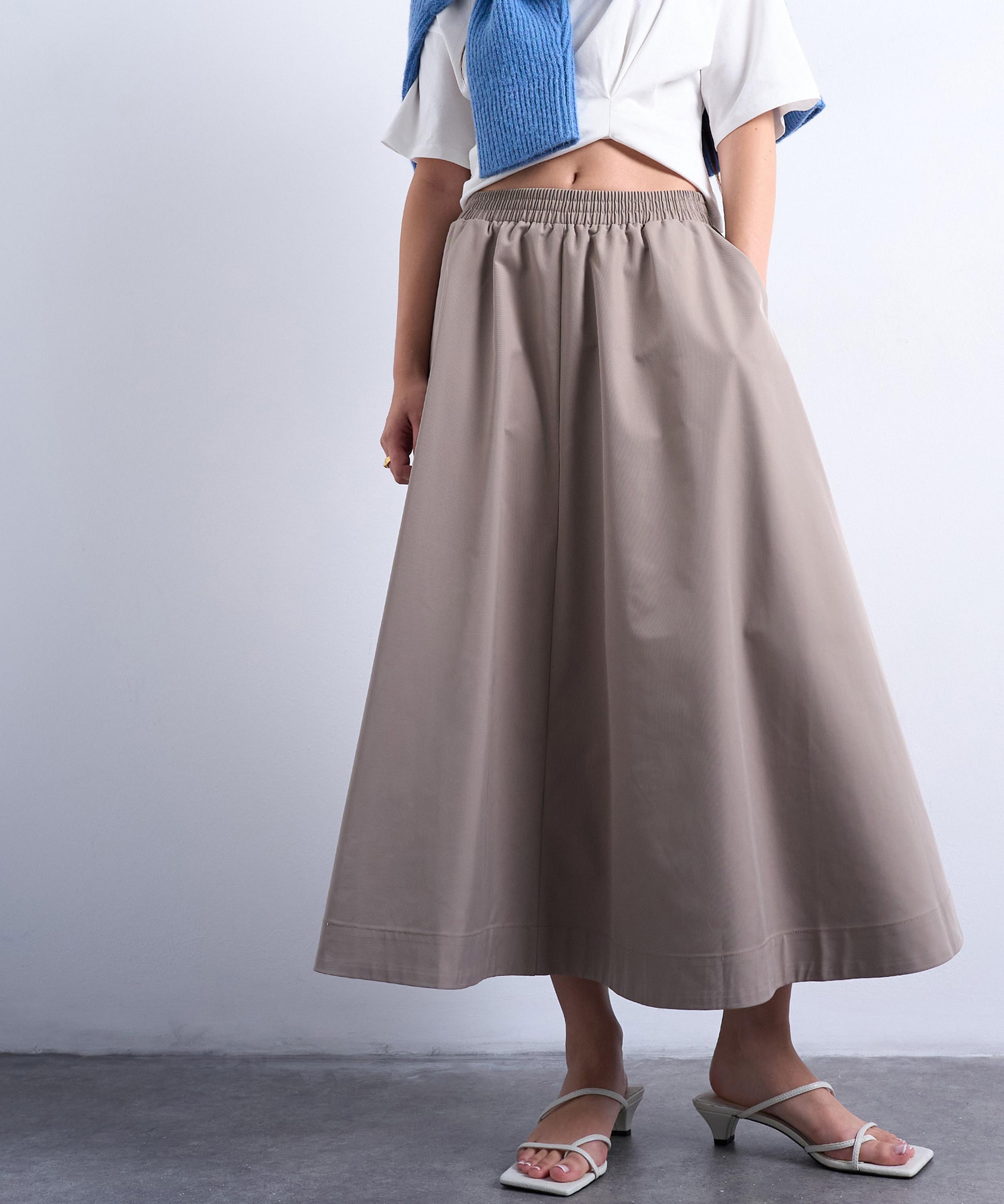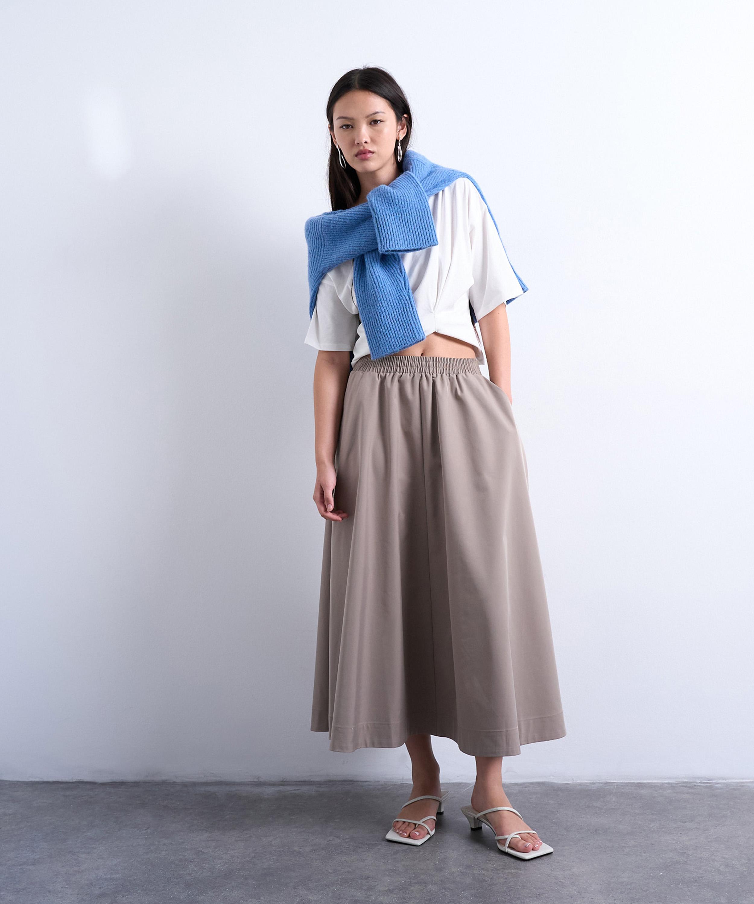 Crafted from soft cotton in a light taupe hue, this midi skirt features a flared A-line silhouette and an elasticated waist for effortless comfort and style.